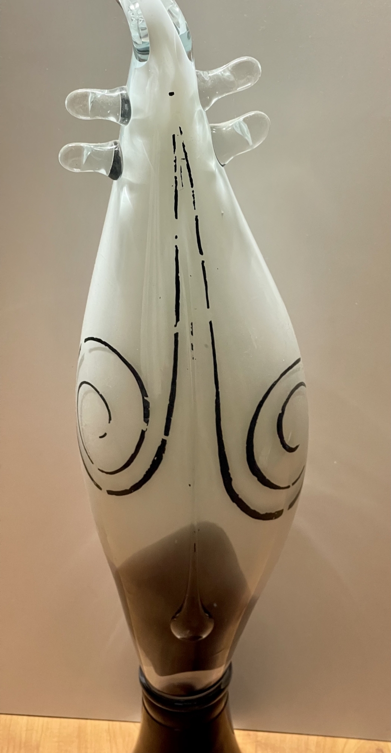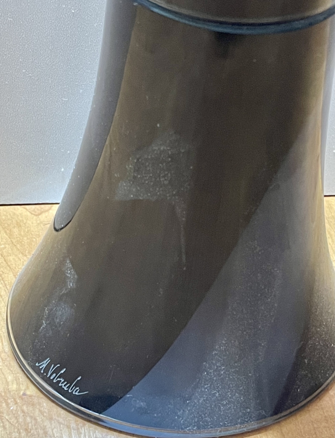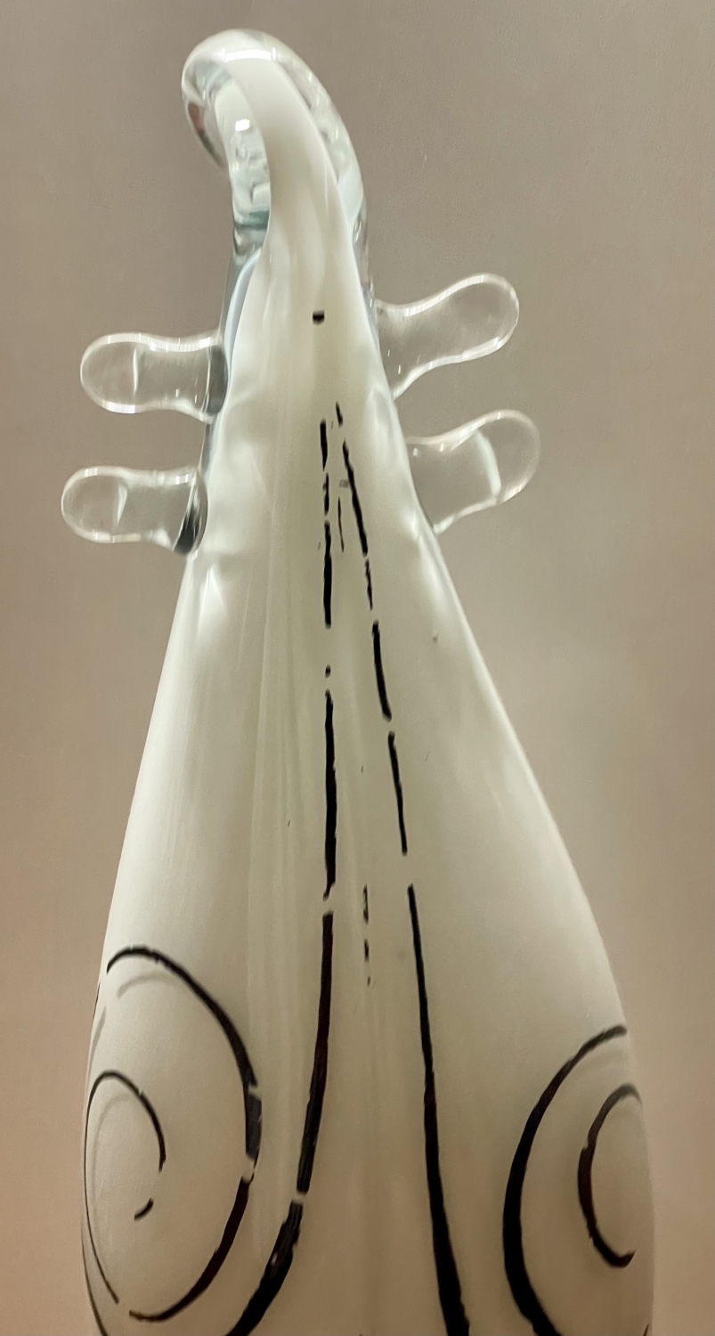 Velký zajímavý skleněný objekt “ Melodie “ od sklářského výtvarníka Milana Vobruby. Signováno dole na podstavci – viz foto. Výška 76 cm. MILAN VOBRUBA (*1934 – 2016) Akademický sochař Milan Vobruba pochází z Třemošnice, po dokončení naší školy vystudoval pražskou VŠUP a poté pracoval jako designér ve sklárně Lenora na jihu Čech. Jeho skleněná díla nechyběla na světových výstavách EXPO 58 v Bruselu a EXPO 67 v Montrealu. V roce 1968 emigroval z Československa do Švédska, kde se rychle prosadil. Jako návrhář sklárny Reimyre Glasbruk vyvinul unikátní moderní hutní zušlechťovací techniku rozvíjející estetický odkaz antického skla. V roce 1978 si Vobruba založil vlastní sklárnu ve švédském Gusumu