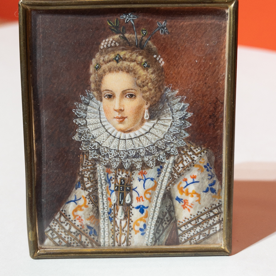 Miniatura, malba na slonové kosti, Dáma s límcem, v kovovém rámečku,