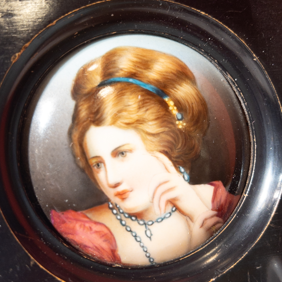 Miniatura, malba na porcelánu, Dáma s modrou čelenkou, v černém dřevěném rámečku,
