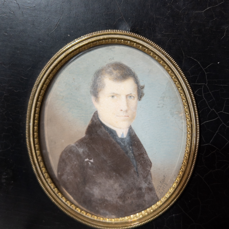 Miniatura, malba na slonové kosti, Portrét muže, v černém dřevěném rámečku, signováno C.Philippot a datováno 1834