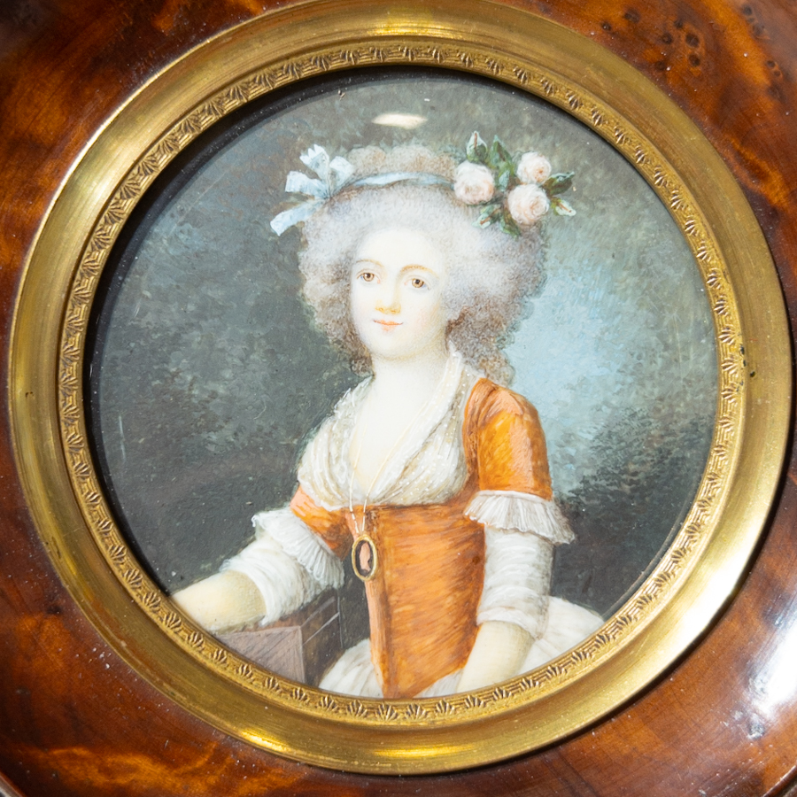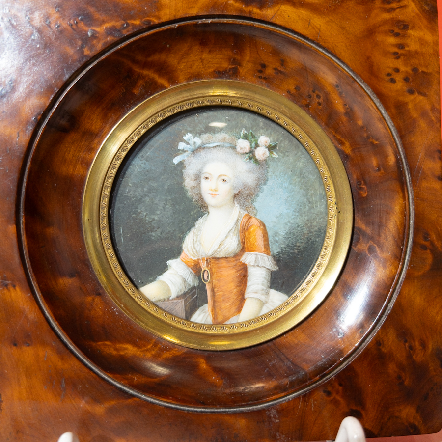 Miniatura, malba na slonové kosti, Portrét šlechtičny, v dřevěném ozdobném rámečku,