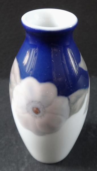 Porcelán bílý, kobaltový, glazovaný. Úzkého válcovitého tvaru. Úzké hrdlo. Ve spodní části bílá. V horní části zdobená květem s listy na kobaltovém pozadí. Značená zespodu – Rosenthal. Německo kolem roku 1910. Výška 6,5 cm.