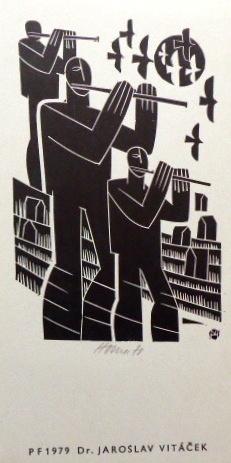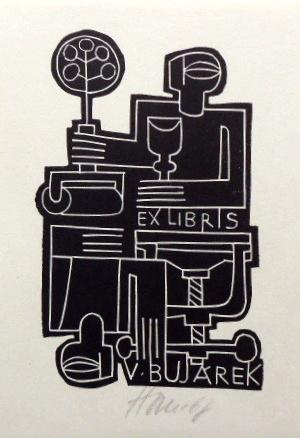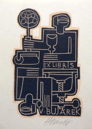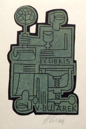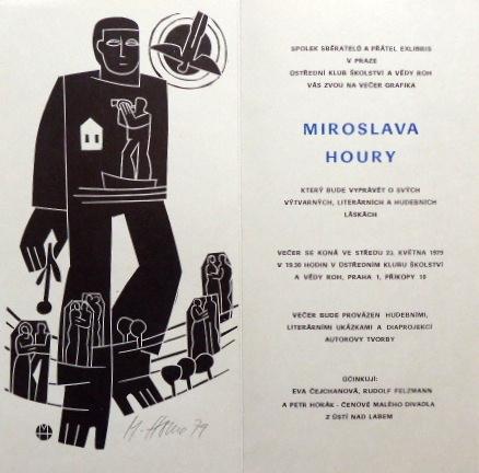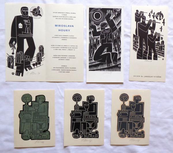 4x linoryt na papíře 20 x 10,5 cm, 14,8 x 9 cm, 17 x 9 cm, 12,5 x 8 cm. 2 x barevný linoryt na papíře 12,5 x 8 cm, 12,5 x 8 cm. Signováno tužkou uprostřed dole, 1 x vlevo dole. Datováno 1978, 1979. 3x exlibris – V. Bujárek. PF 1979 Dr. Jaroslav Vitáček. Pozvánka. Slunovrat. Nerámováno. Miroslav Houra ( 3. 8. 1933 Krhanice – 19. 1. 2006 Ústí nad Labem ) studium: Vyšší škola uměleckého průmyslu v Praze 1948 – 1952 prof. Karel Müller, Univerzita Karlova v Praze 1952 – 1955 prof. Karel Lidický, Cyril Bouda, Martin Salcman. člen: Sdružení českých umělců grafiků Hollar, skupina Objekt, skupina Dialog, Český fond výtvarných umění, Svaz československých výtvarných umělců, Spolek exlibristů Lublaň.