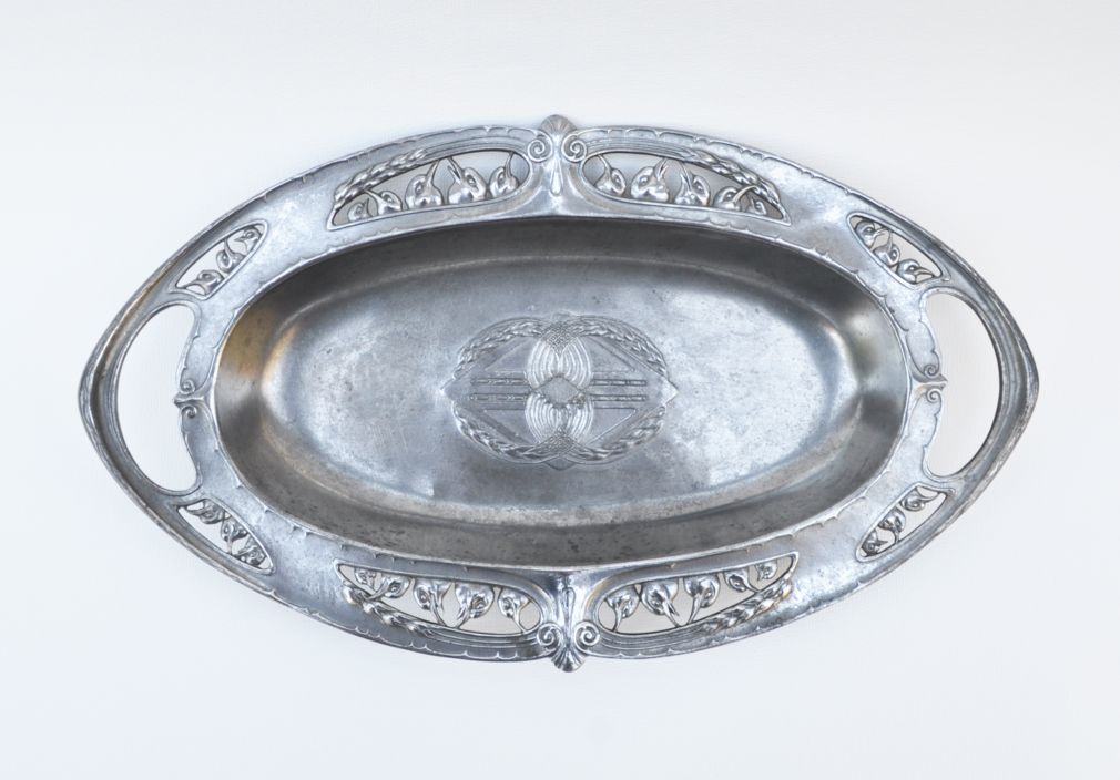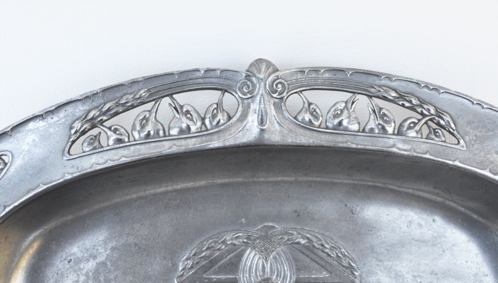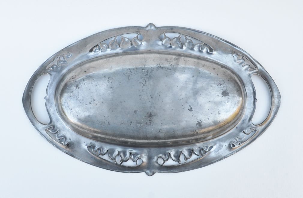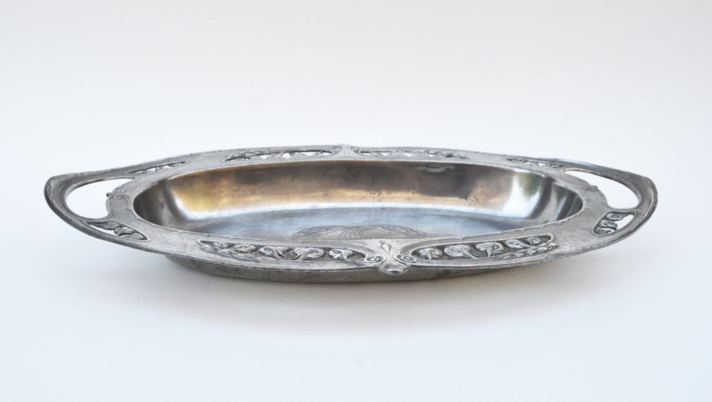 Stará dekorativní prolamovaná mísa s motivem ptačích hlav, Německo cca 1905, patinovaný cín, šířka 35 cm, šířka 20,5 cm, výška 4.8 cm, velmi dobrý stav.