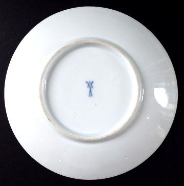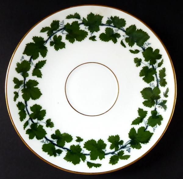 Bílý, malovaný, zlacený porcelán. Kulatý s klenutým okrajem a zlatou horní linkou. V horní části, malovaný pás zelených vinných listů se stonky. Uprostřed zlacený kruh. Značený zespodu – modré zkřížené meče, vtlačené číslice. Německo 1825 – 1924. Průměr 14,5 cm.