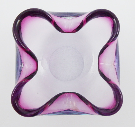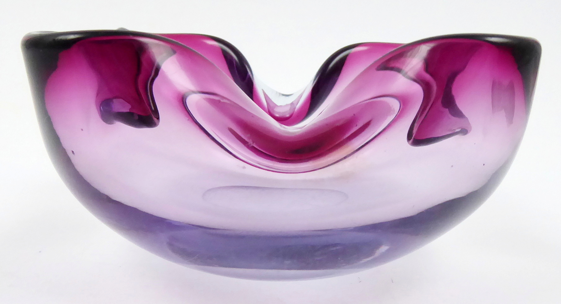 Ametystové a fialové hutně tvarované sklo. Miska či popelník z ametystového a fialového skla s laločnatě tvarovaným okrajem. Ve výborném stavu. Československo, třetí třetina minulého století. Průměr 12,5 cm, výška 6 cm.