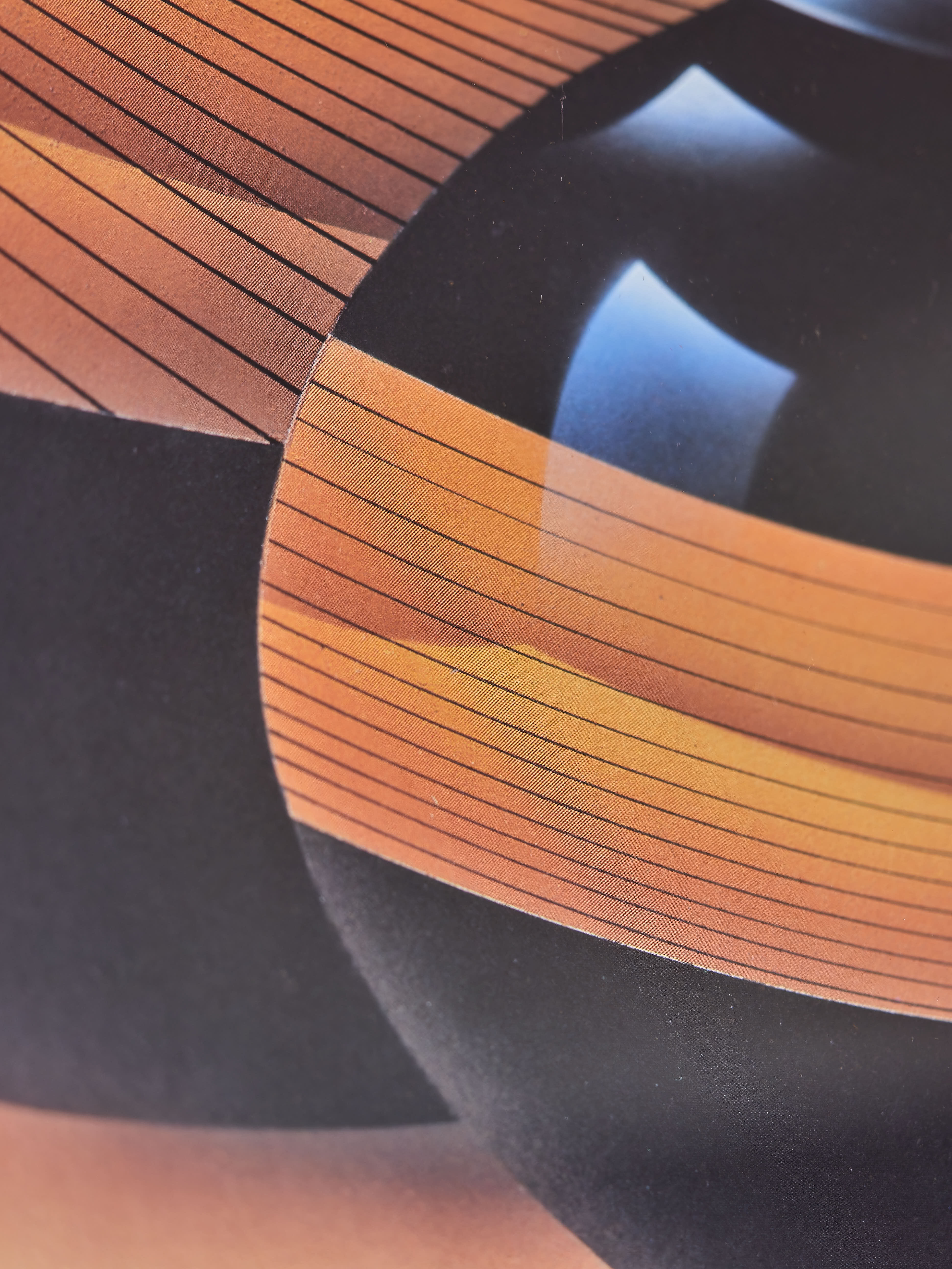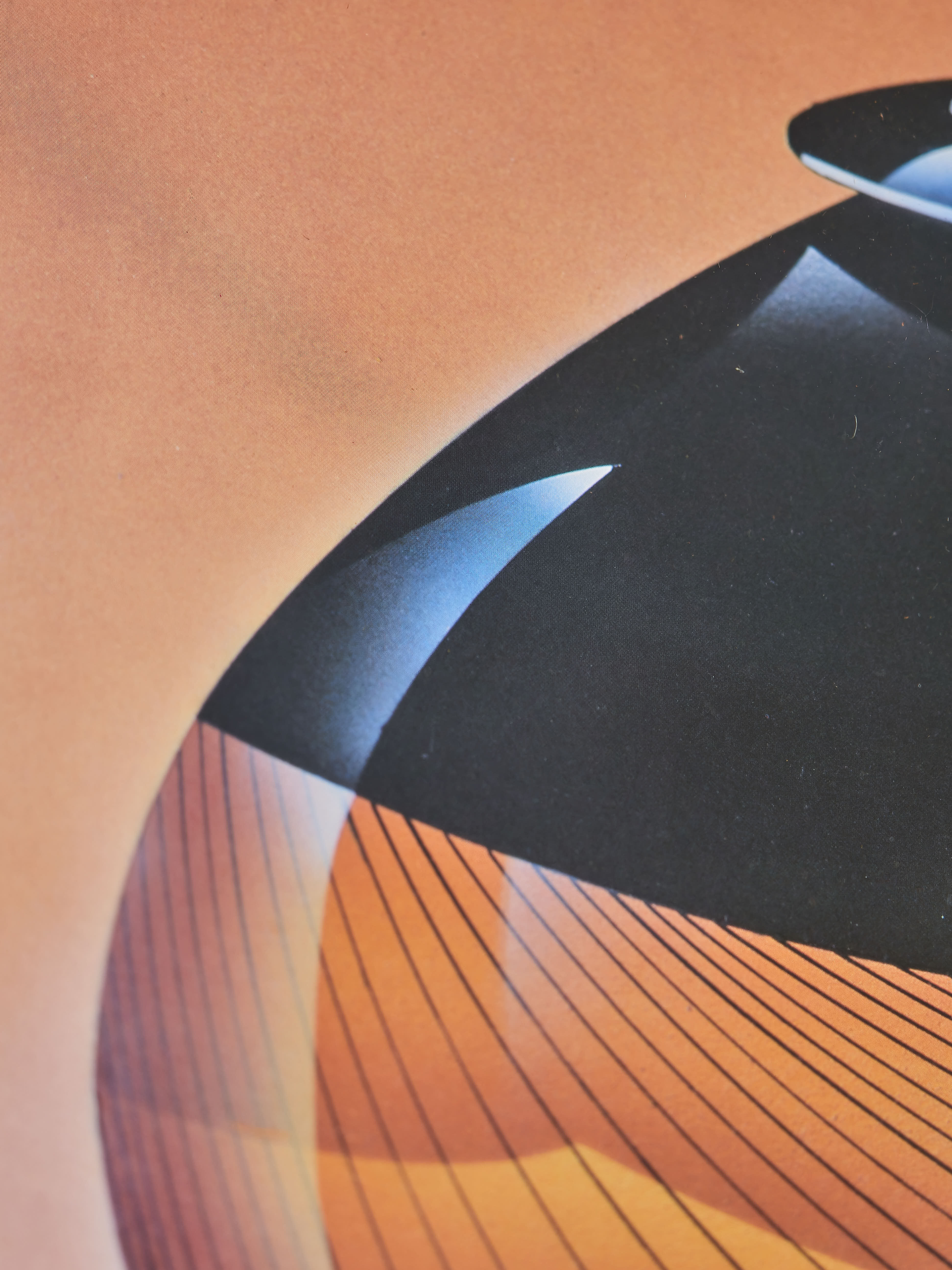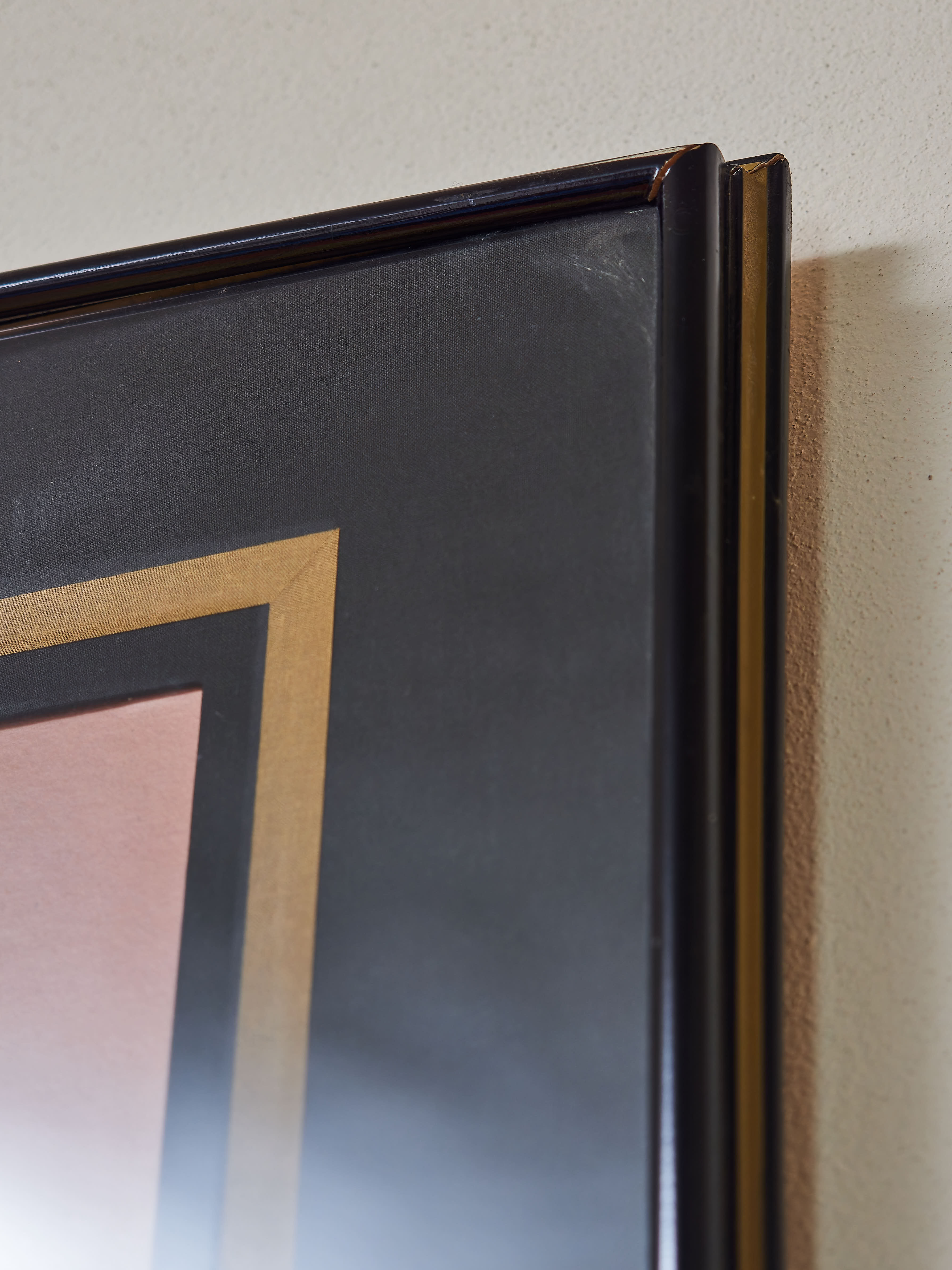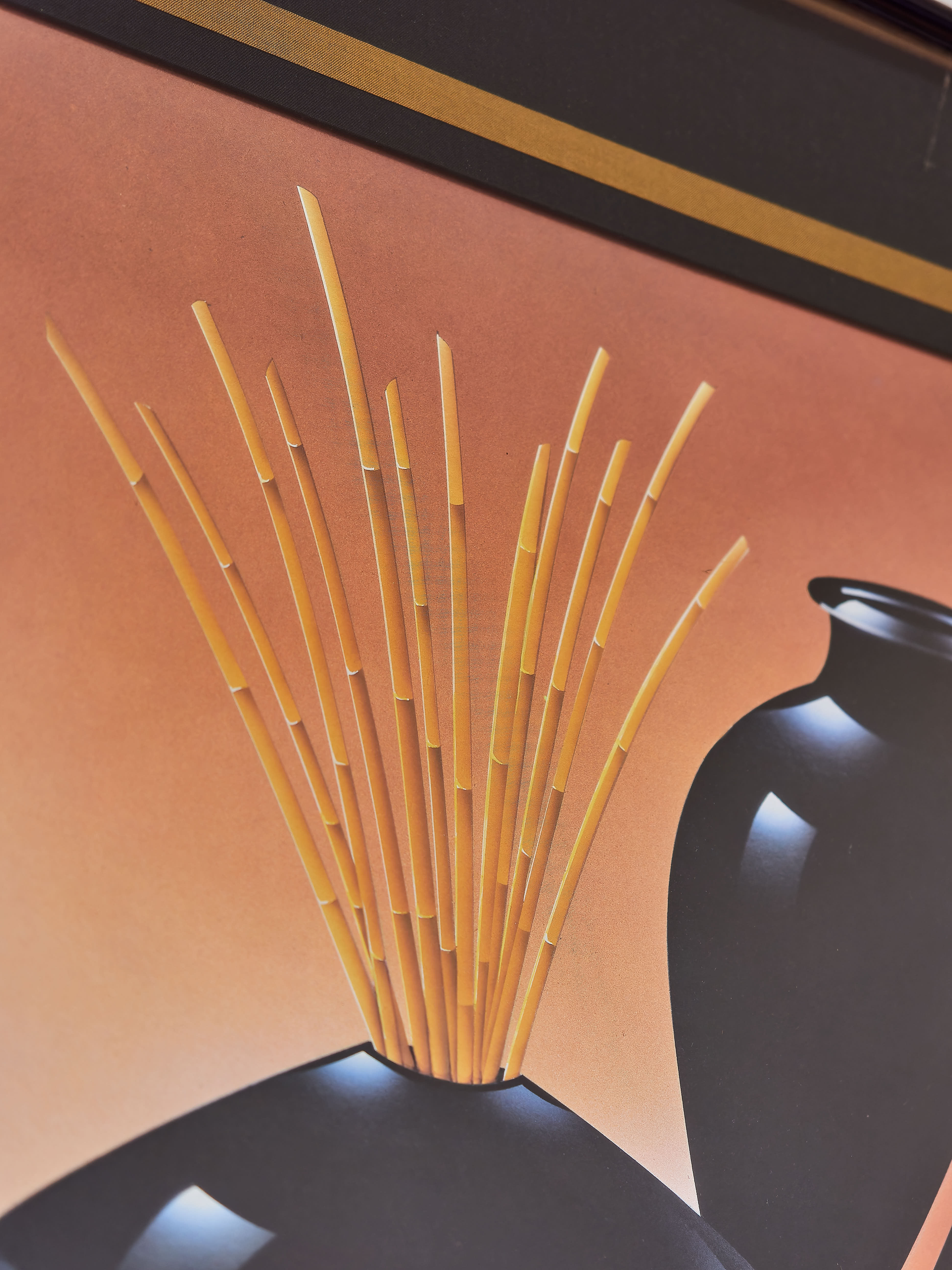 Elegantní dekorativní obraz s motivem čtyř černých váz se zlatými pruhy a bambusovými stébly, provedený v minimalistickém a moderním stylu. Jemný přechod pozadí z teplých odstínů oranžové a béžové zvýrazňuje kontrast černých tvarů a dodává celé kompozici hloubku a harmonii. Dílo působí jako spojení moderního designu a nadčasové estetiky, hodí se jak do současných interiérů, tak i jako elegantní prvek do klasického prostředí.