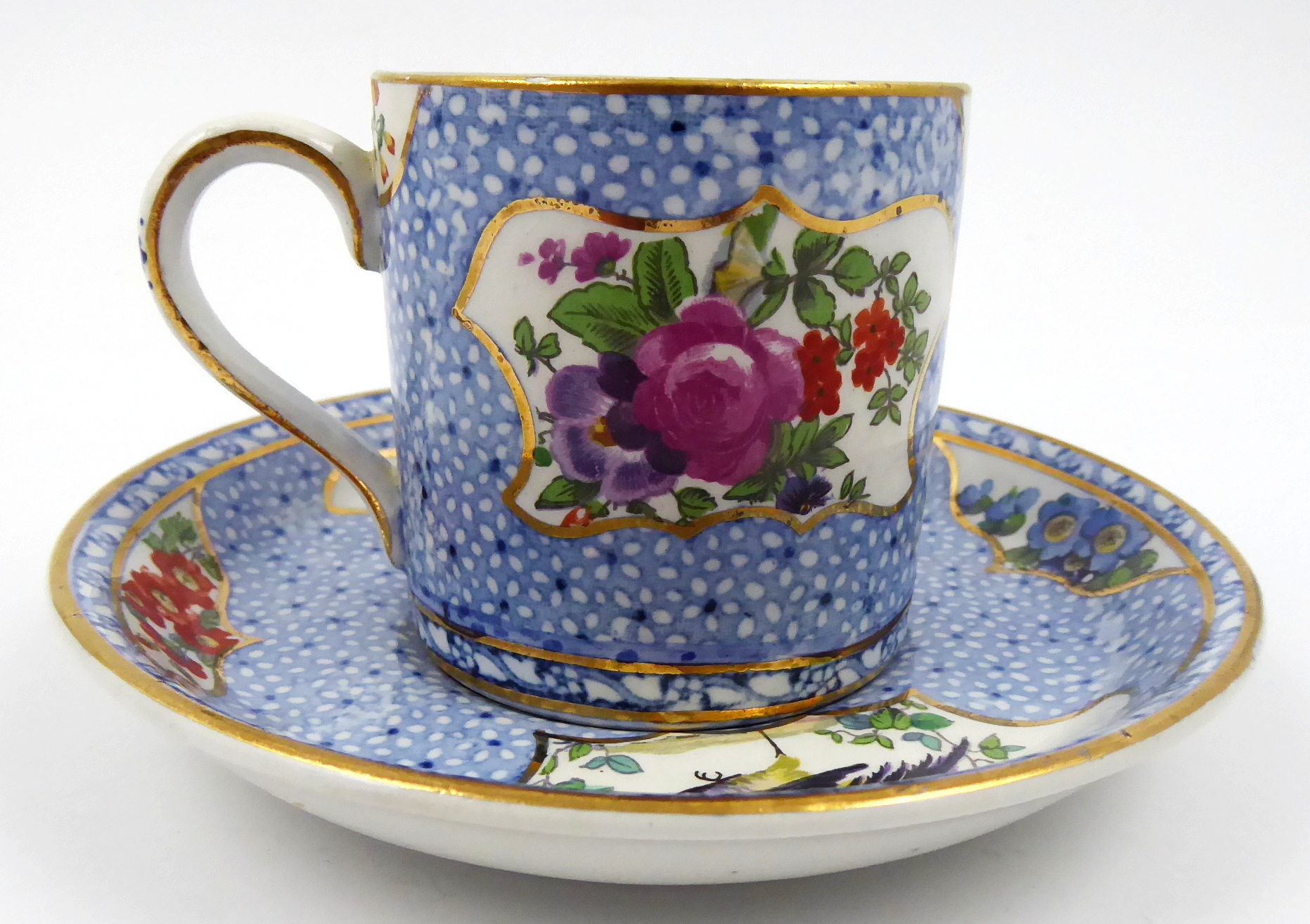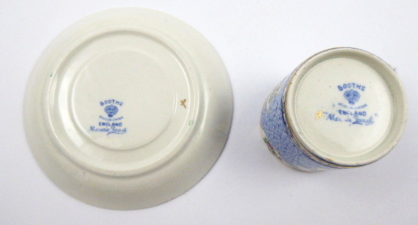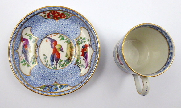 Barevně malovaná a ručně zlacená keramika. Tenká průsvitná kamenina s názvem Sillicon China vynalezená se záměrem konkurovat jemnému porcelánu prostřednictvím vyšší odolnosti. Porcelánka Booths, Stoke-on-Trent, kterou založil roku 1850 Thomas Booths. Kávový šálek s podšálkem s různými druhy okrasného ptactva ve zlacených kartuších. Zlacený úchyt i zlacené linky v horní i dolní části šálku i na obvodu podšálku. Značeno zespodu: Booths England s korunkou a dalšími nápisy. Anglie, Stoke-on-Trent 1906 – 1939. Výška 5,5 cm, průměr podšálku 12 cm.