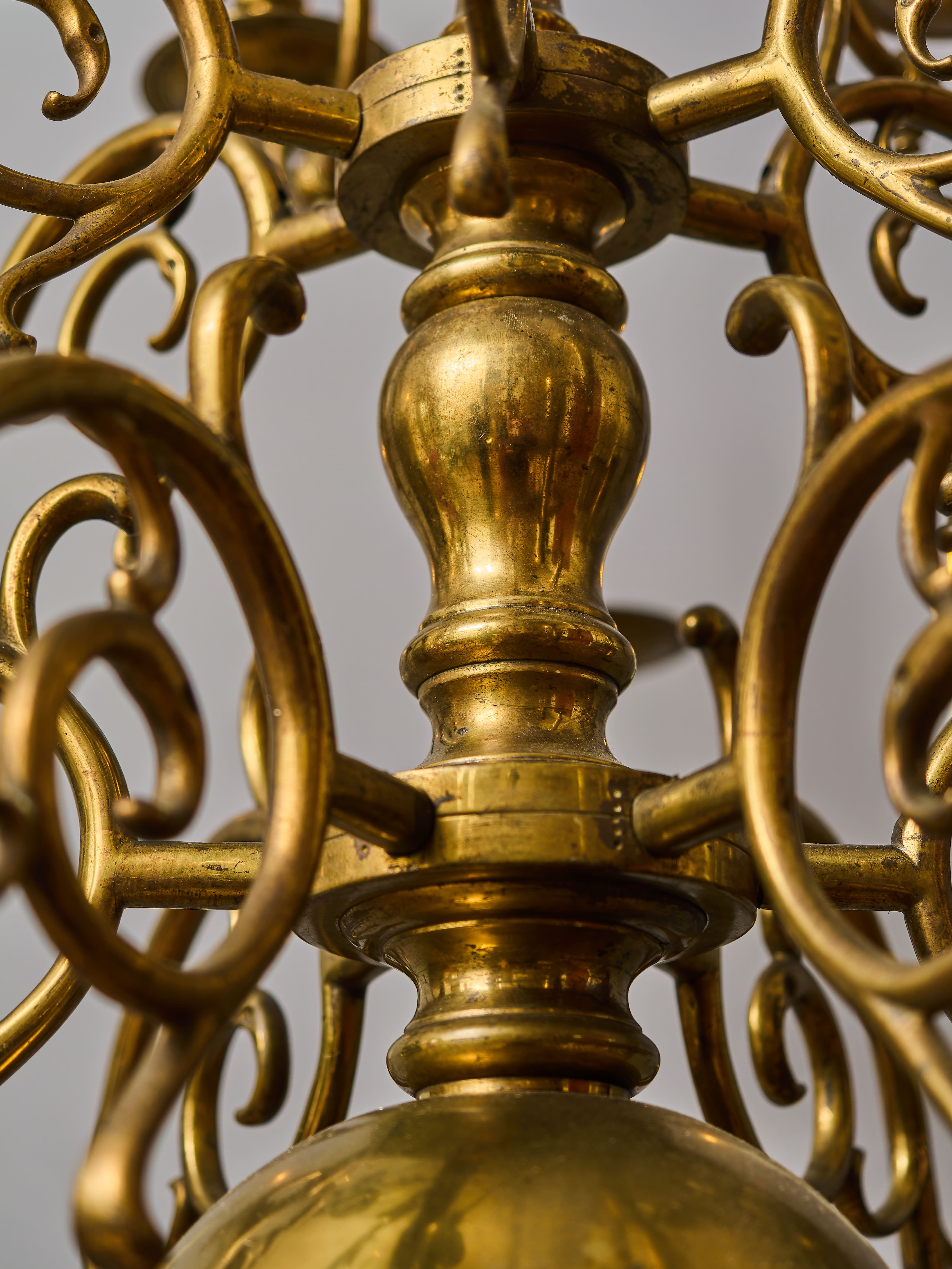 Tento výjimečný mosazný lustr představuje vrchol tradiční řemeslné výroby velkých reprezentativních svítidel, určených původně pro osvětlení interiérů pomocí plynu. Konstrukce lustru je plně ručně zhotovená z masivní mosazi, s bohatě tvarovaným středovým tělem, plasticky modelovanými rameny a výraznými volutami, které vytvářejí harmonickou a vyváženou kompozici.
