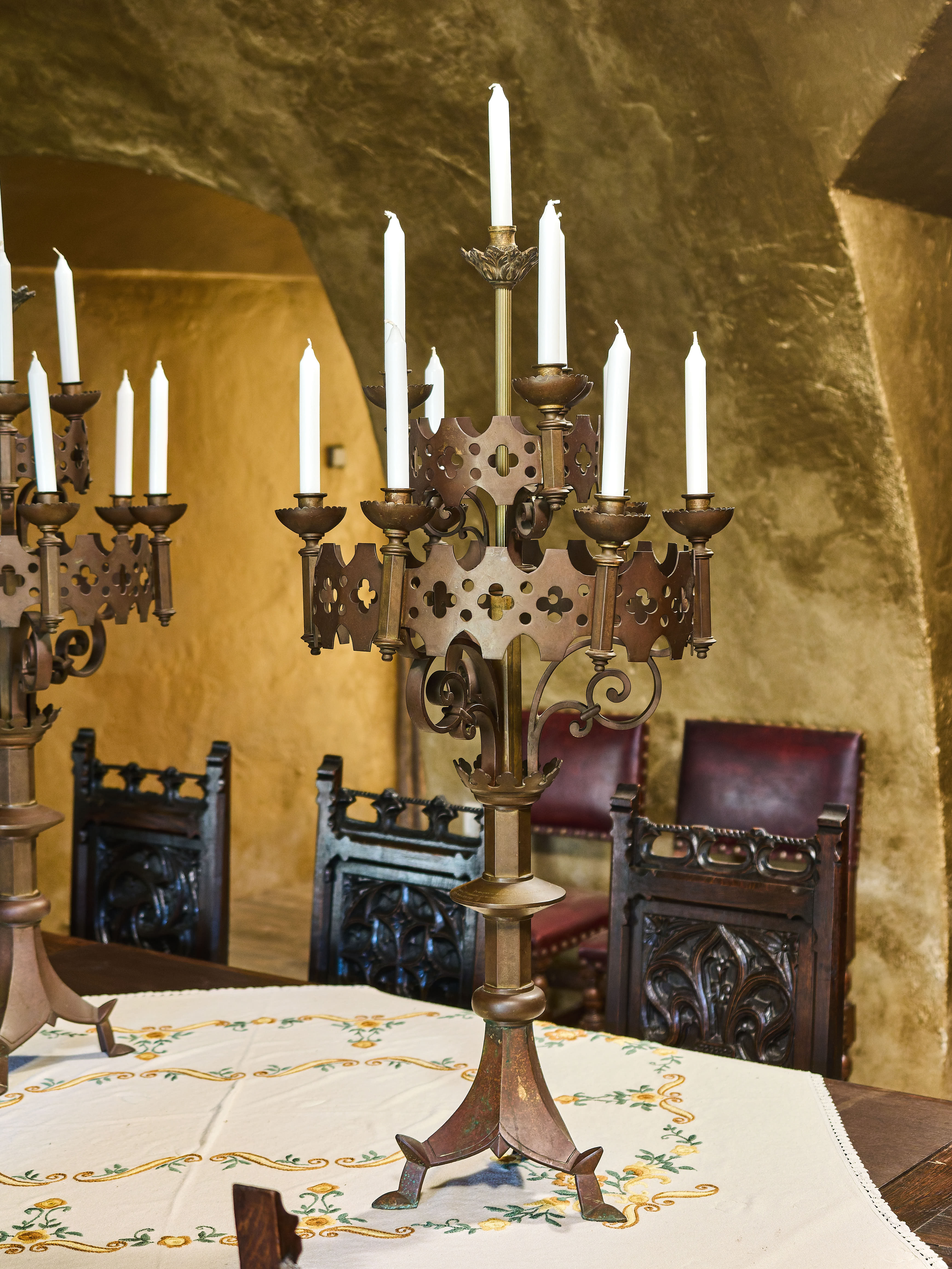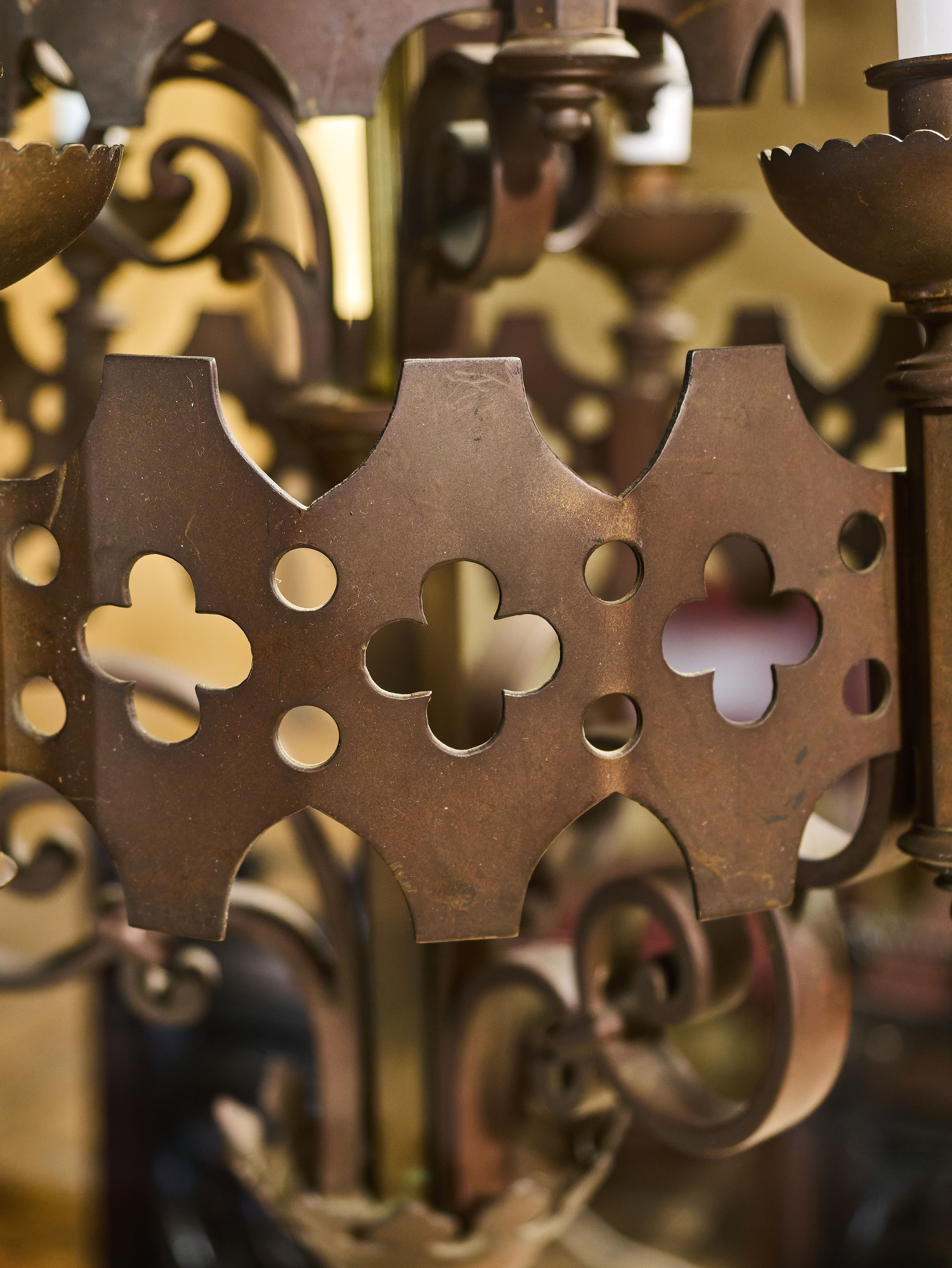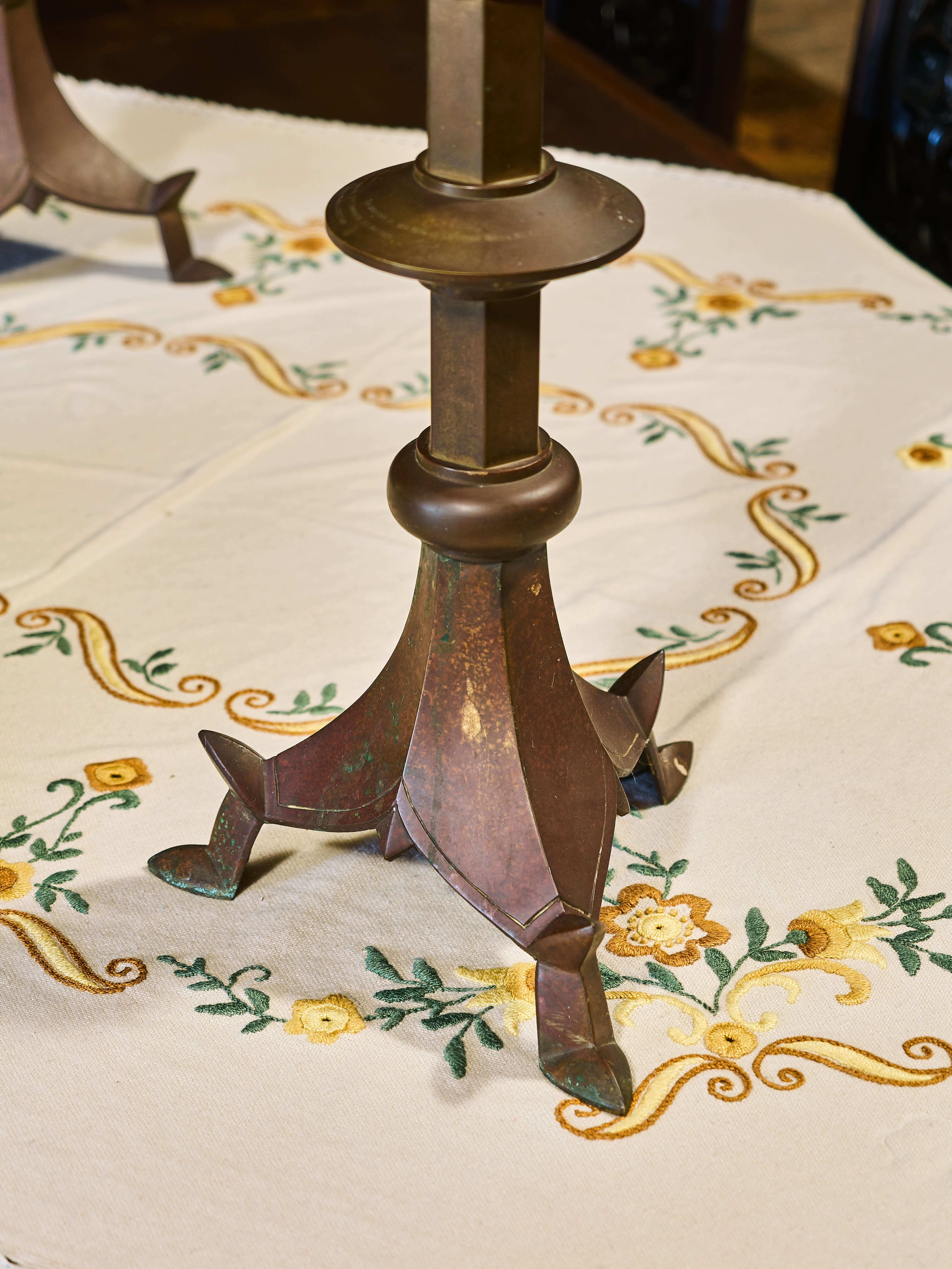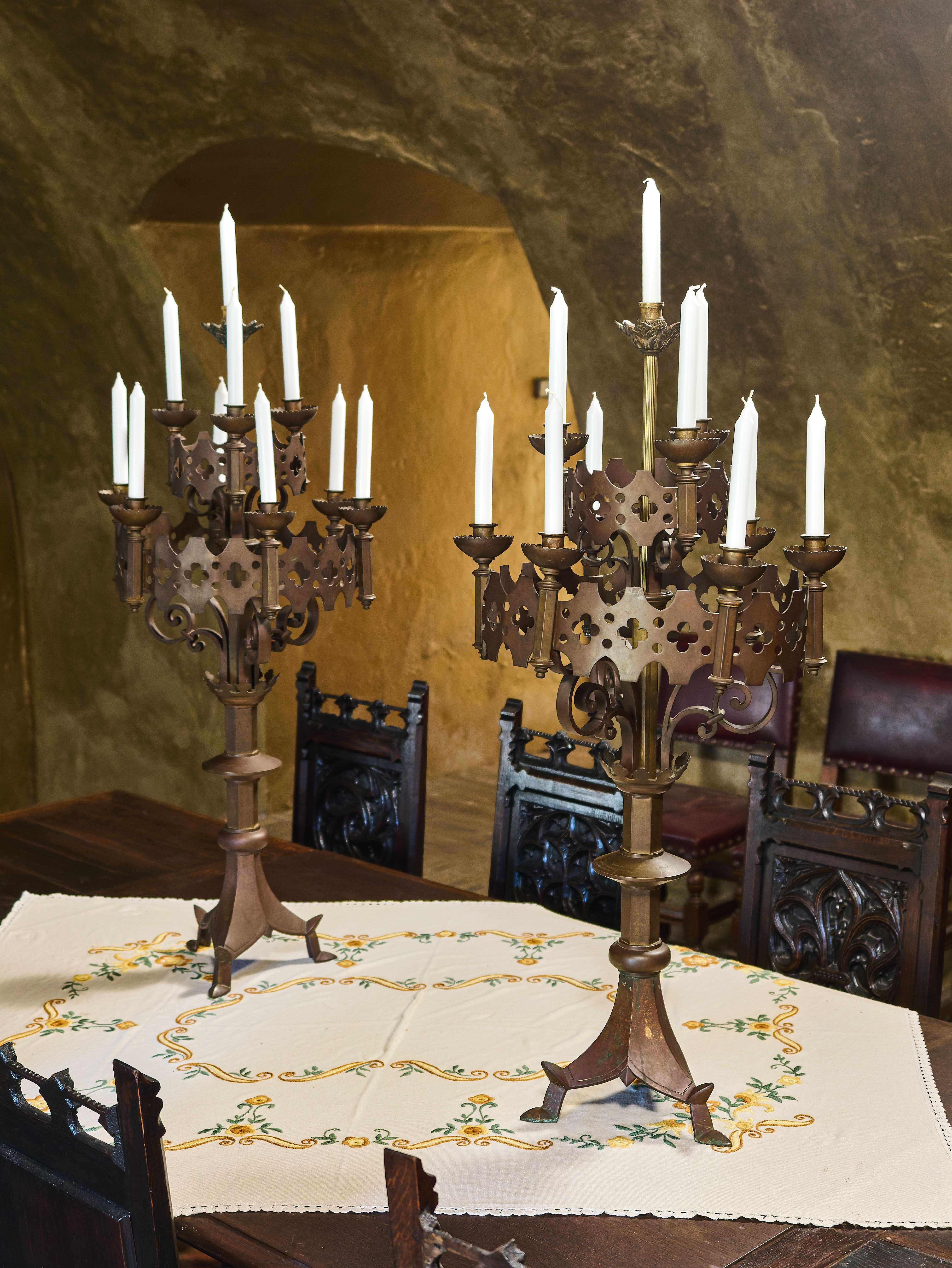 Výjimečný pár monumentálních svícnů v neogotickém stylu, vyrobených z bronzu. Precizní kovářská a slévárenská práce se projevuje v bohatě zdobených detailech s gotizujícími motivy, perforovanými prvky a dekorativními kovanými spirálami. Každý svícen nese několik ramen pro umístění svící, což zajišťuje působivý světelný efekt. Stabilní trojnohá základna dodává svícnům pevnost a zdůrazňuje jejich architektonický charakter. Tyto svícny jsou vhodné nejen jako funkční historické osvětlení, ale také jako reprezentativní dekorativní prvek do zámeckého nebo historického interiéru.
