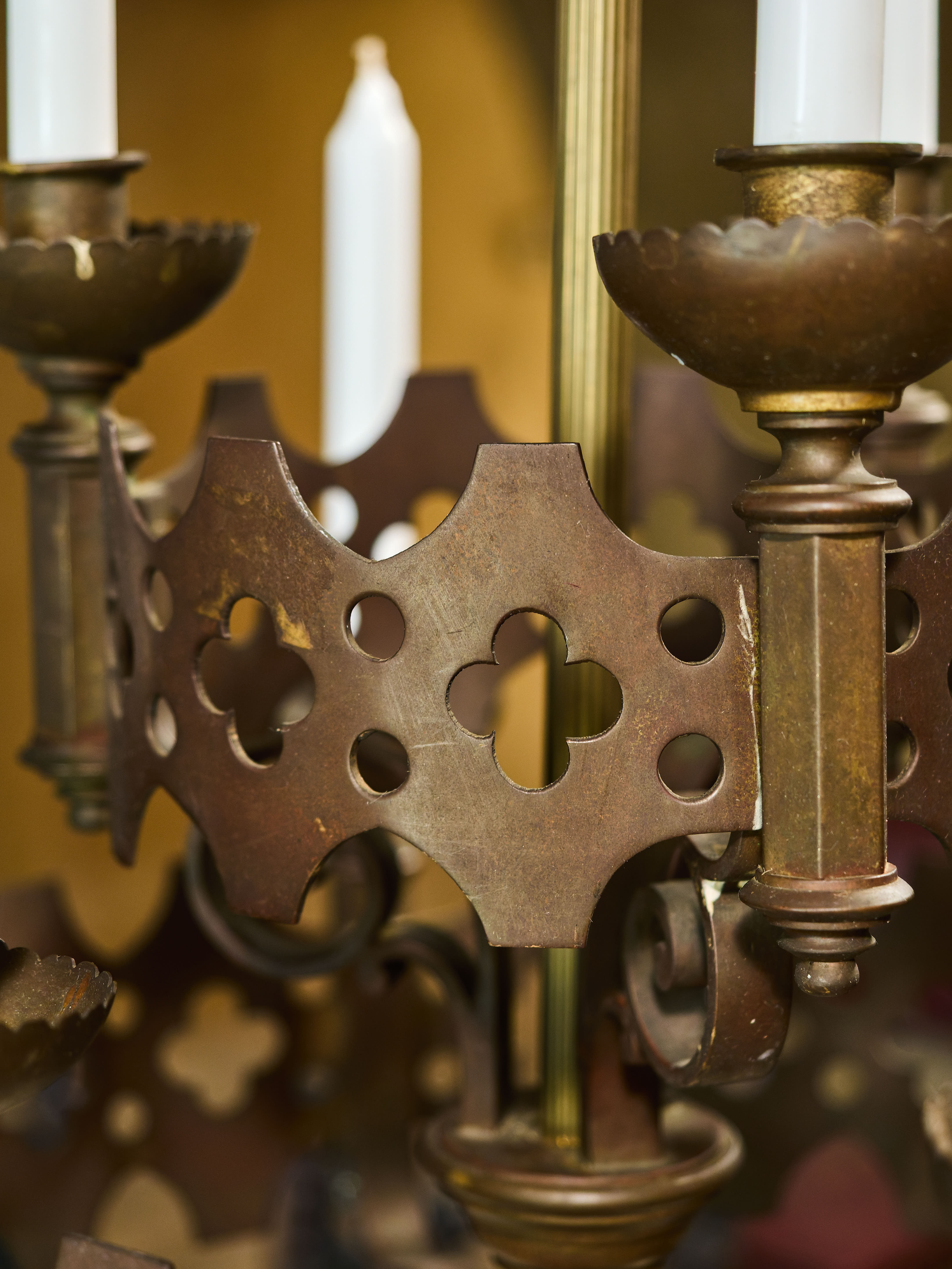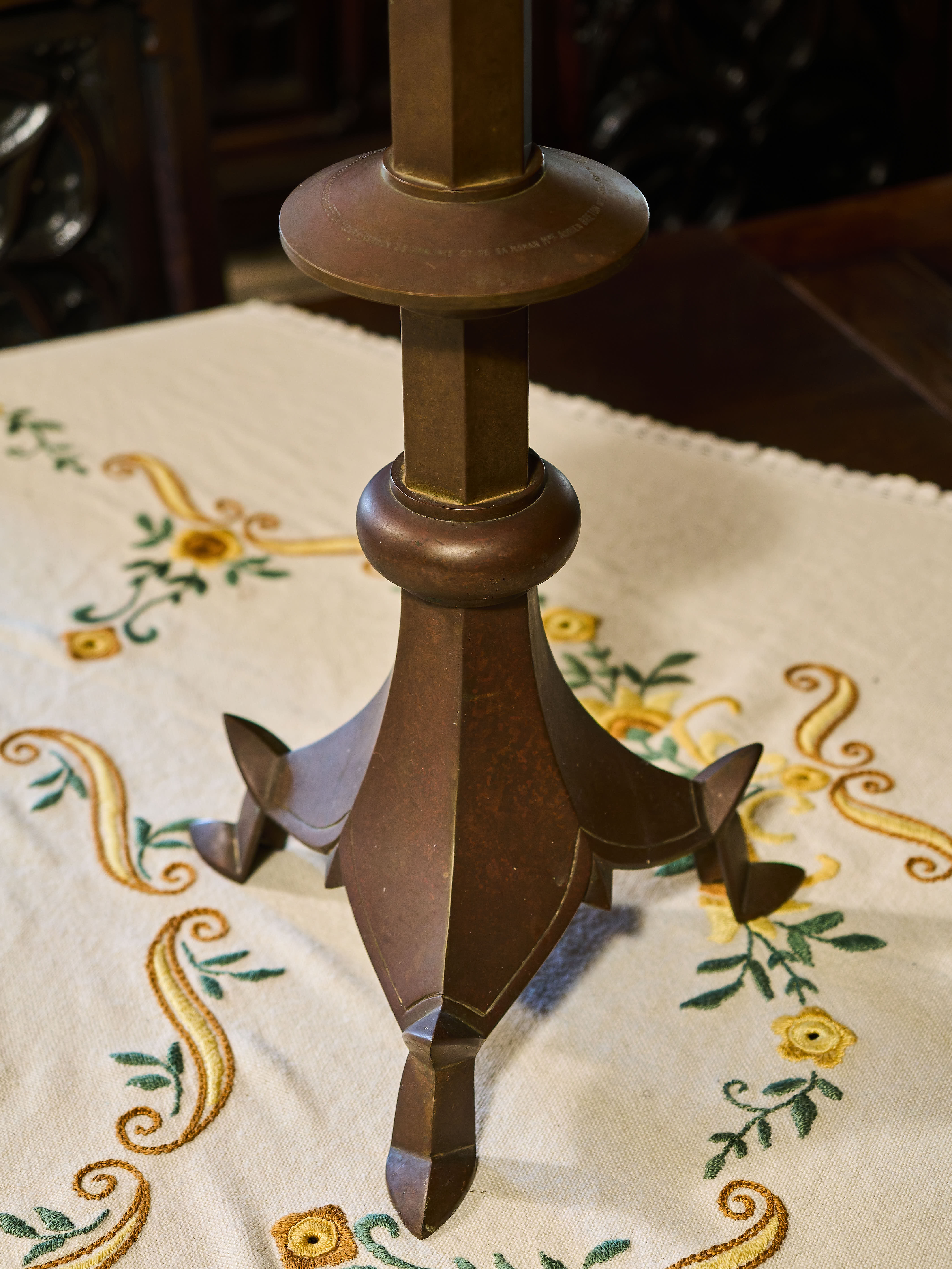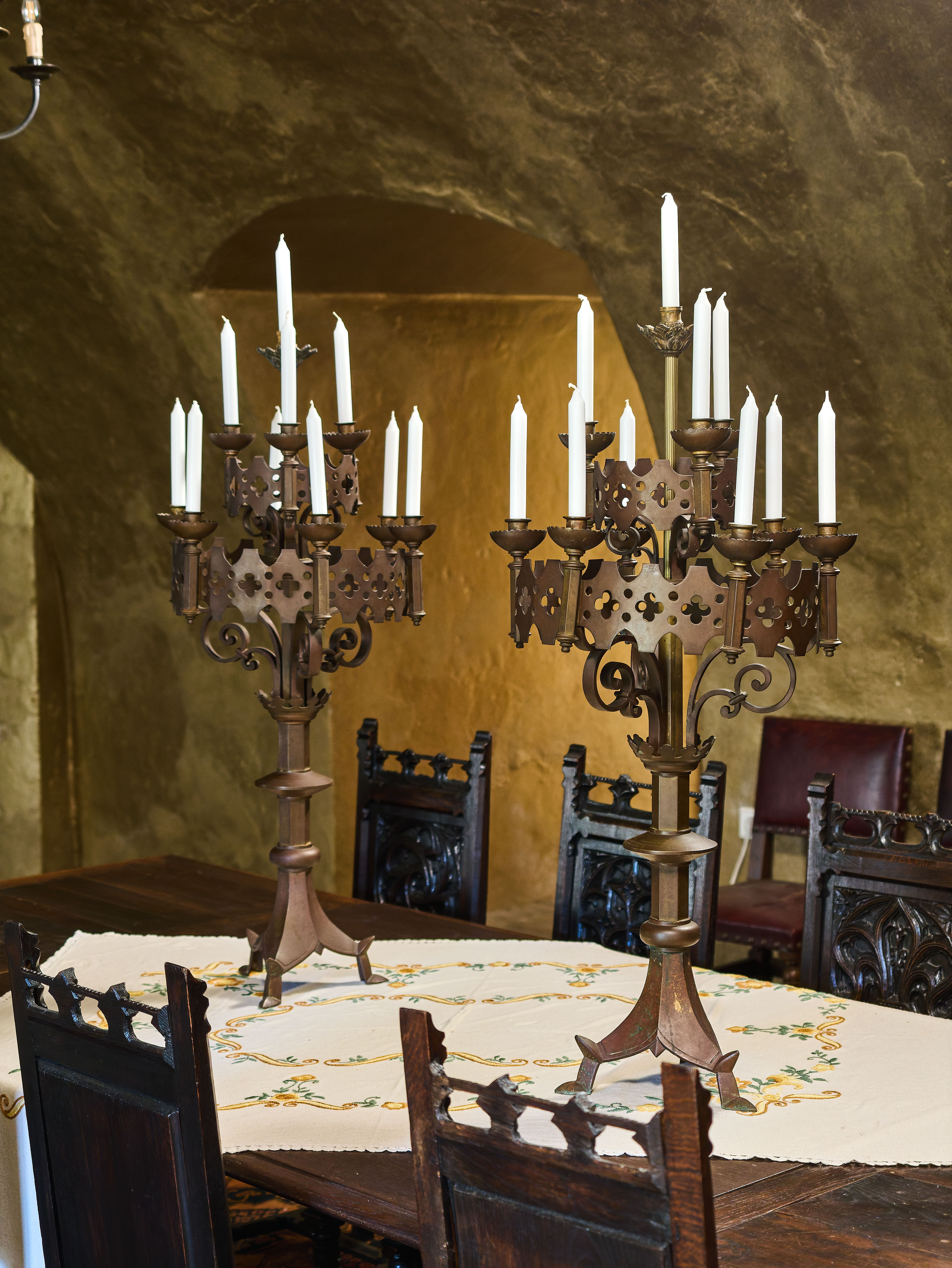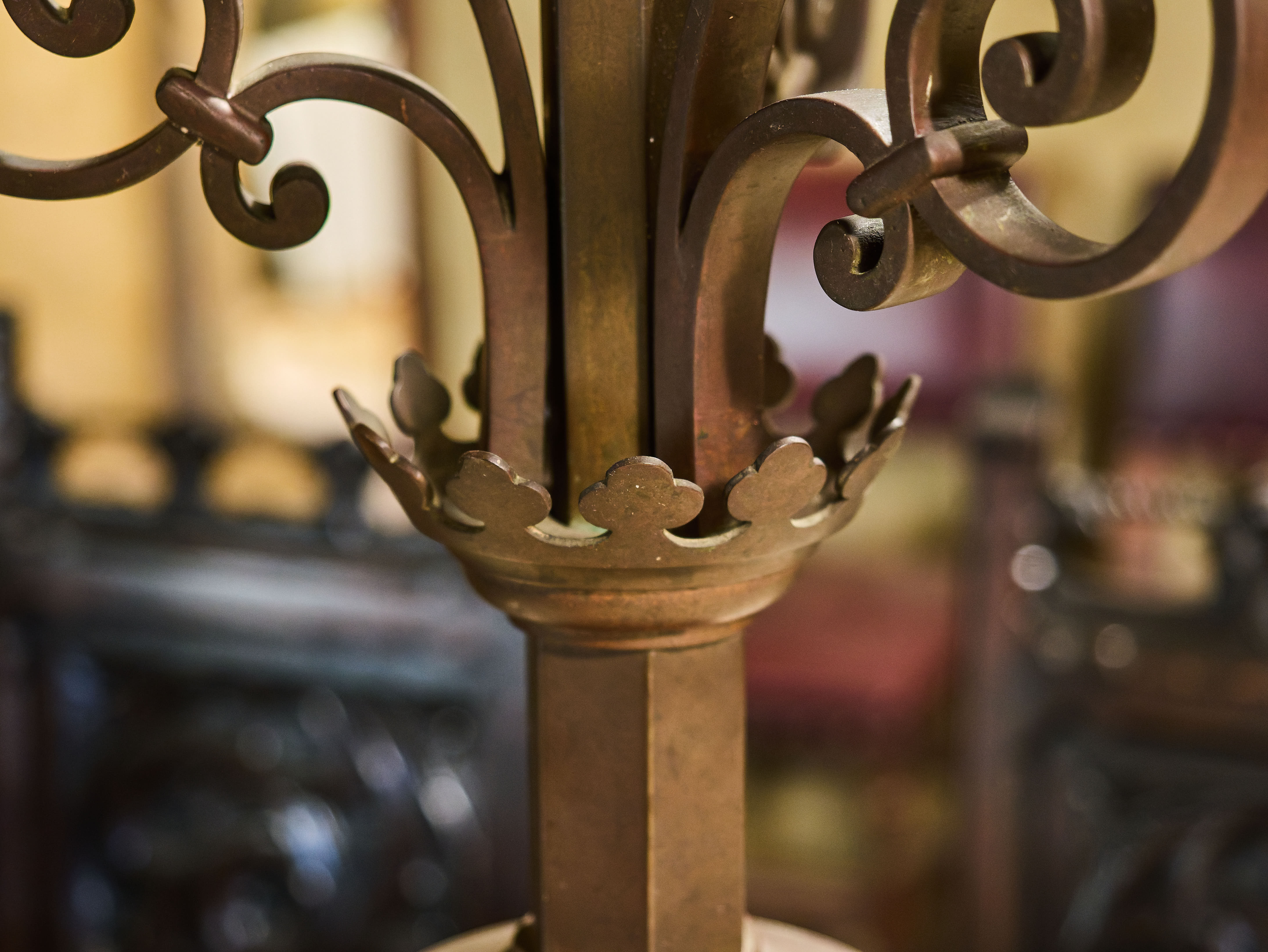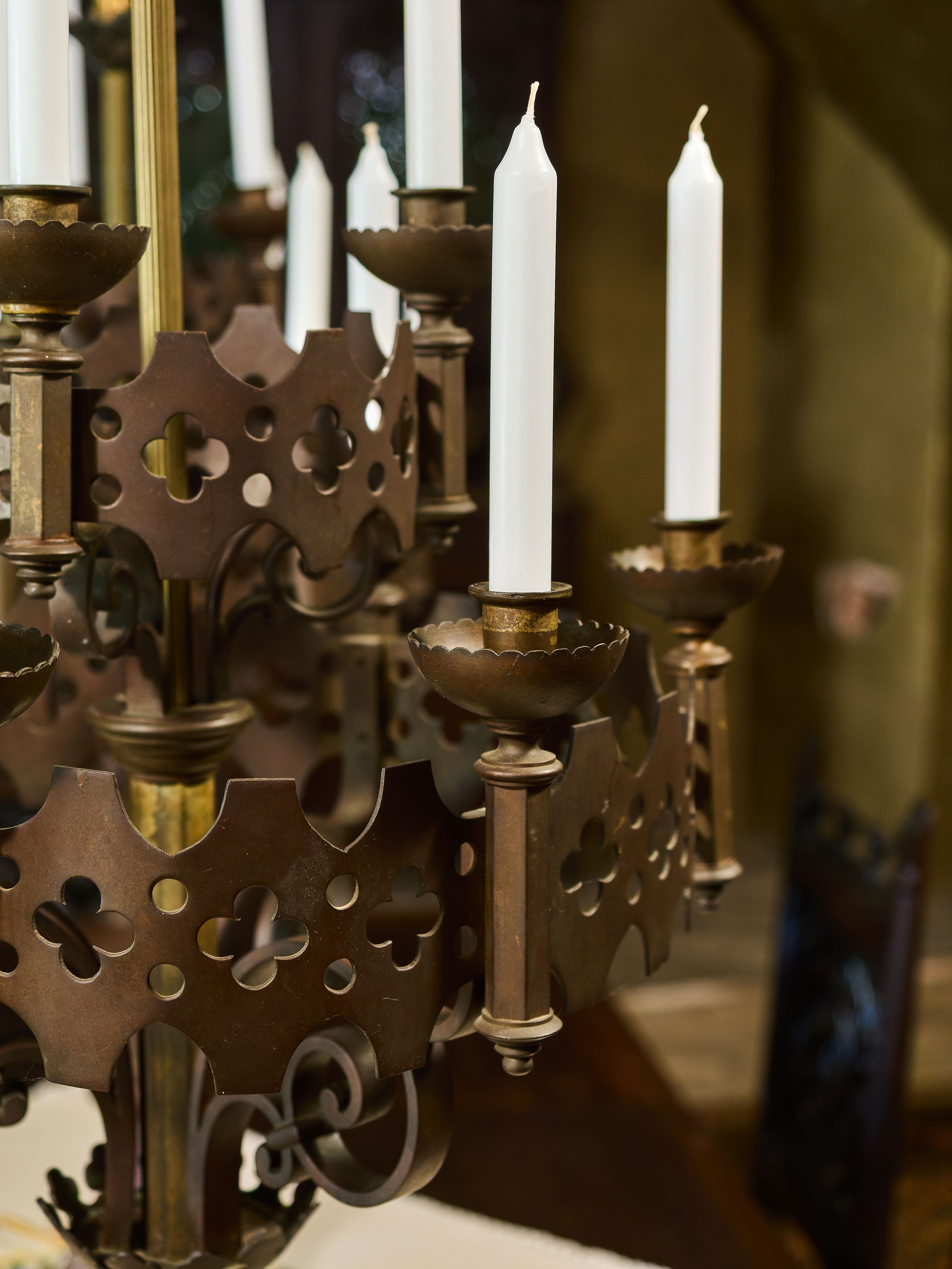 Výjimečný pár monumentálních svícnů v neogotickém stylu, vyrobených z bronzu. Precizní kovářská a slévárenská práce se projevuje v bohatě zdobených detailech s gotizujícími motivy, perforovanými prvky a dekorativními kovanými spirálami. Každý svícen nese několik ramen pro umístění svící, což zajišťuje působivý světelný efekt. Stabilní trojnohá základna dodává svícnům pevnost a zdůrazňuje jejich architektonický charakter. Tyto svícny jsou vhodné nejen jako funkční historické osvětlení, ale také jako reprezentativní dekorativní prvek do zámeckého nebo historického interiéru.