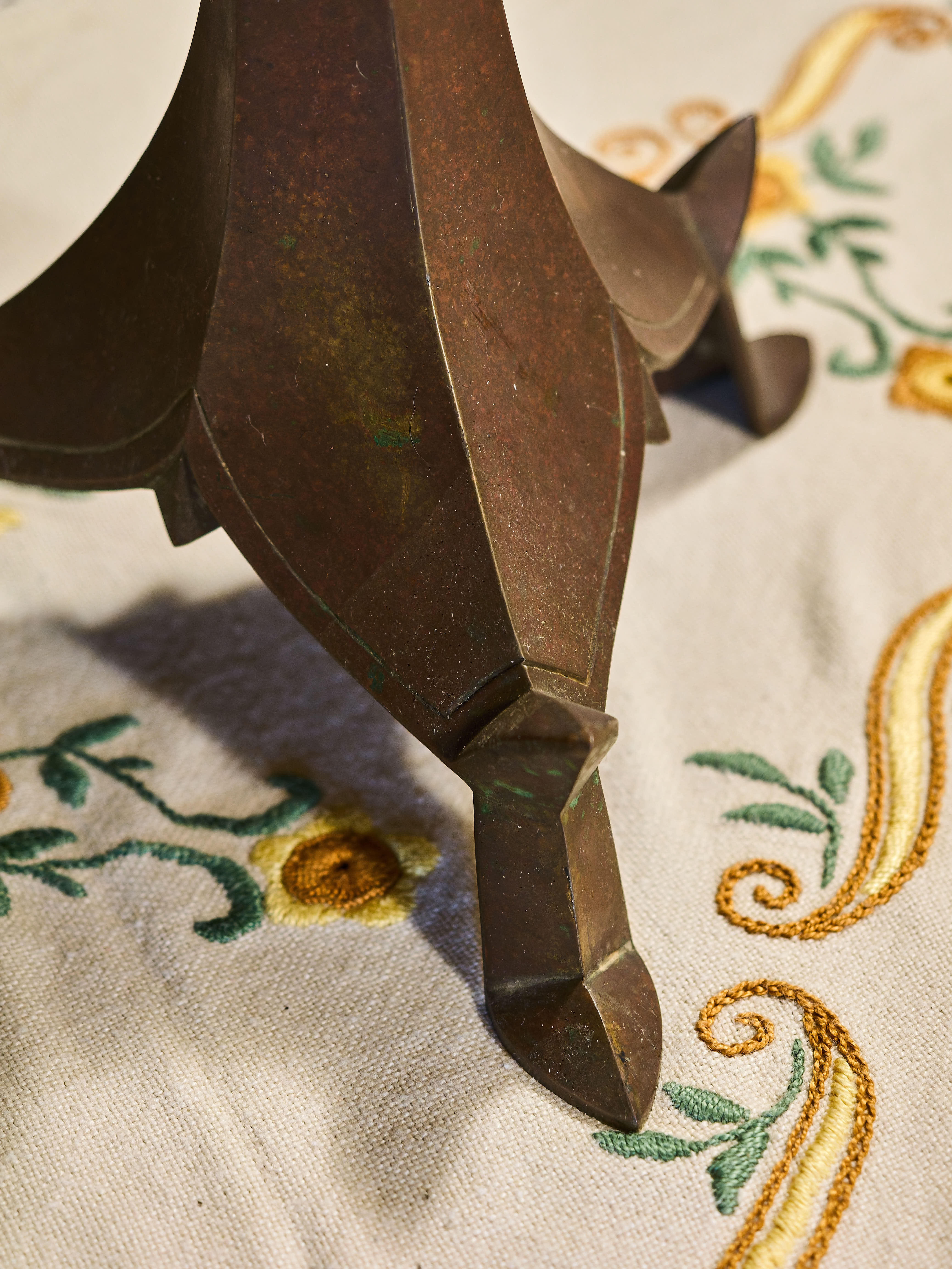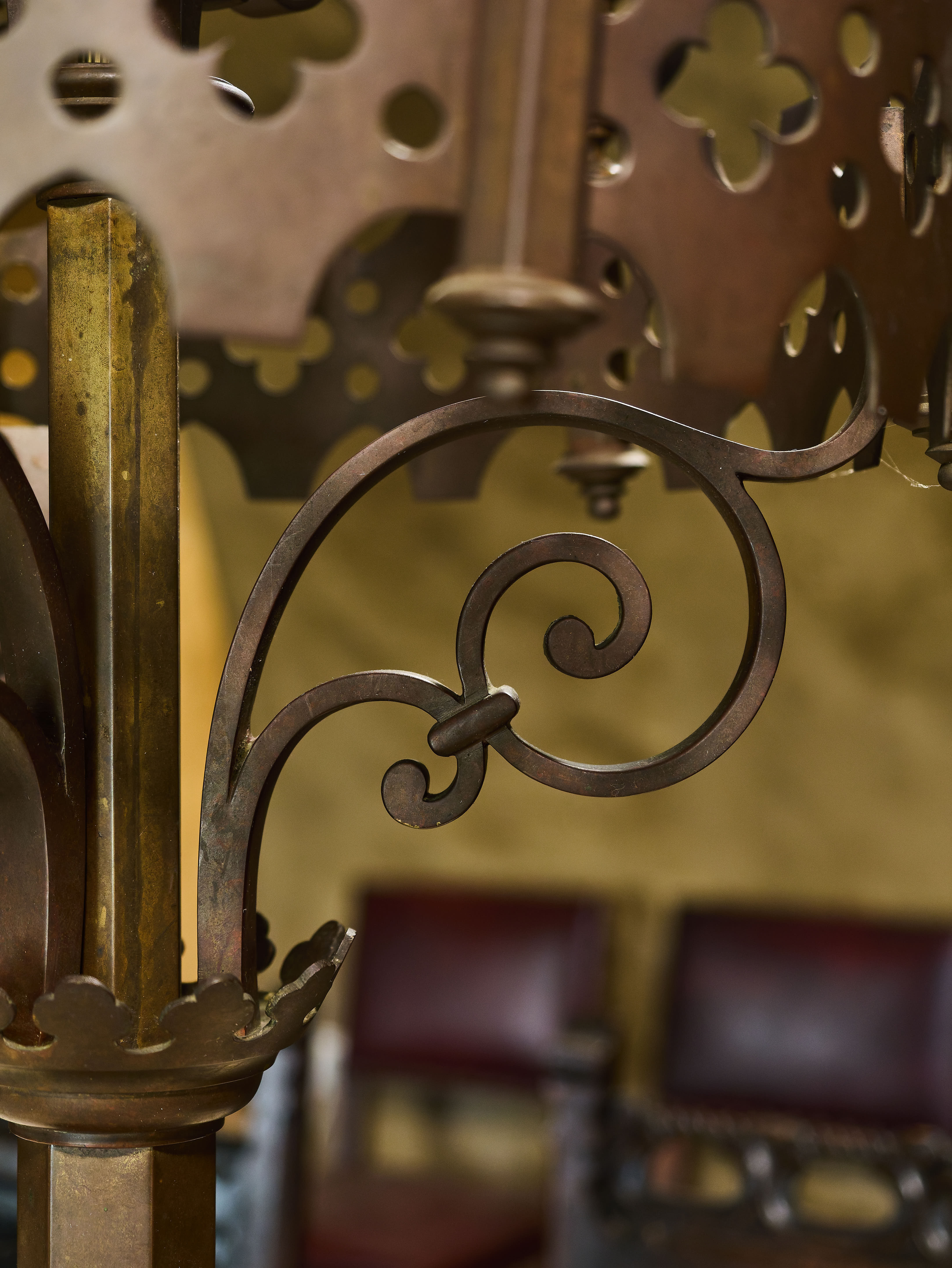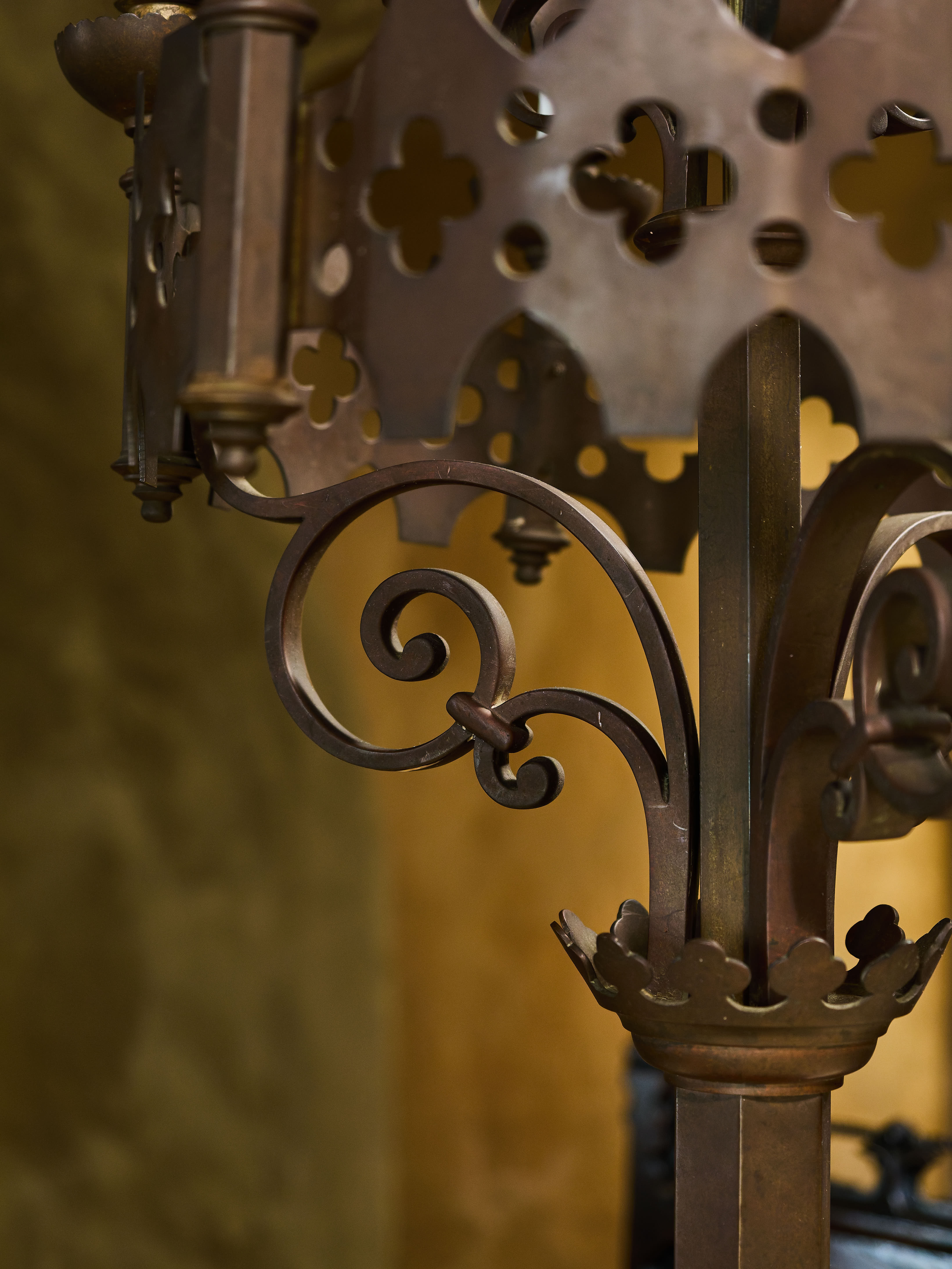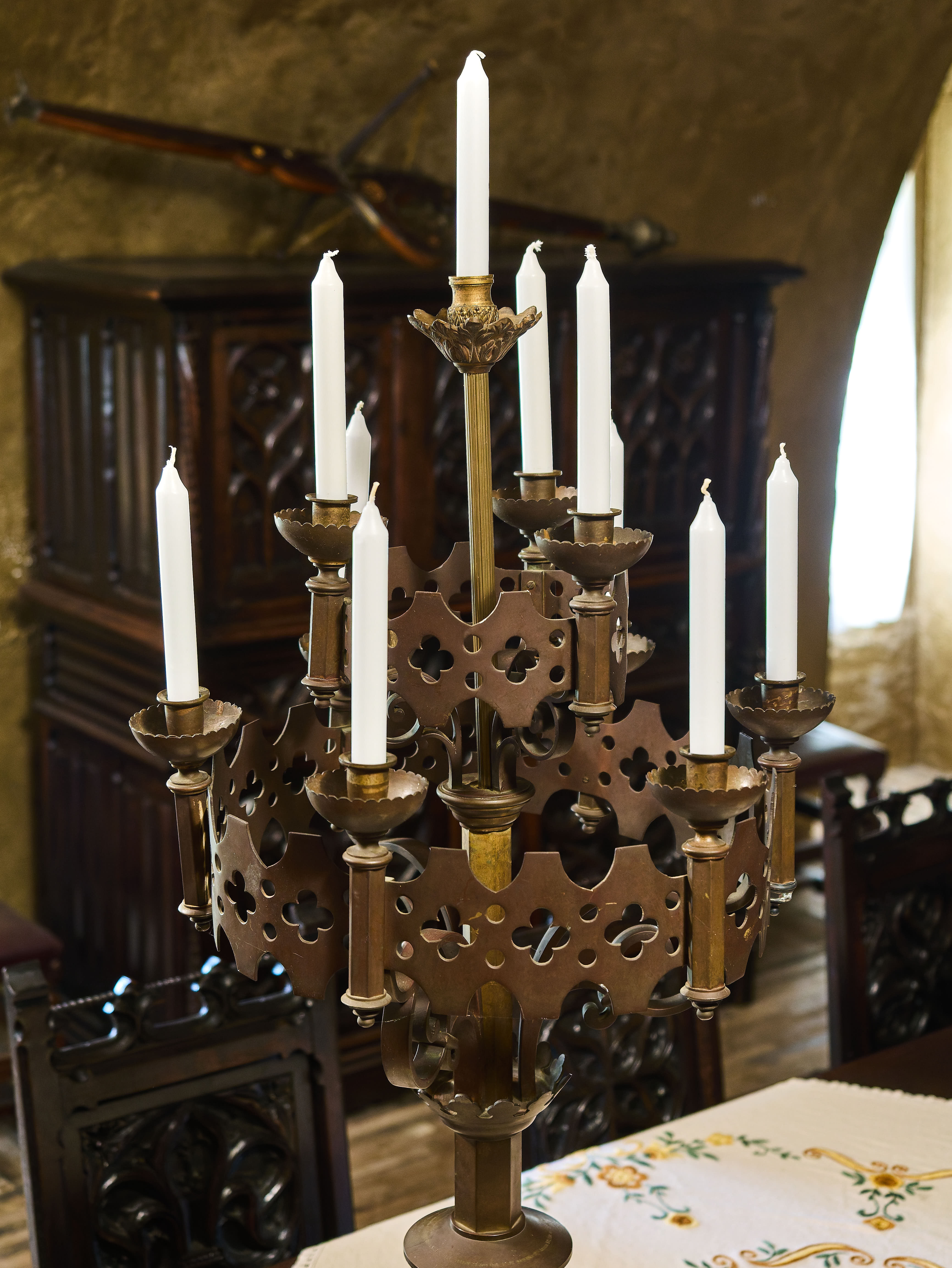 Výjimečný pár monumentálních svícnů v neogotickém stylu, vyrobených z bronzu. Precizní kovářská a slévárenská práce se projevuje v bohatě zdobených detailech s gotizujícími motivy, perforovanými prvky a dekorativními kovanými spirálami. Každý svícen nese několik ramen pro umístění svící, což zajišťuje působivý světelný efekt. Stabilní trojnohá základna dodává svícnům pevnost a zdůrazňuje jejich architektonický charakter. Tyto svícny jsou vhodné nejen jako funkční historické osvětlení, ale také jako reprezentativní dekorativní prvek do zámeckého nebo historického interiéru.
