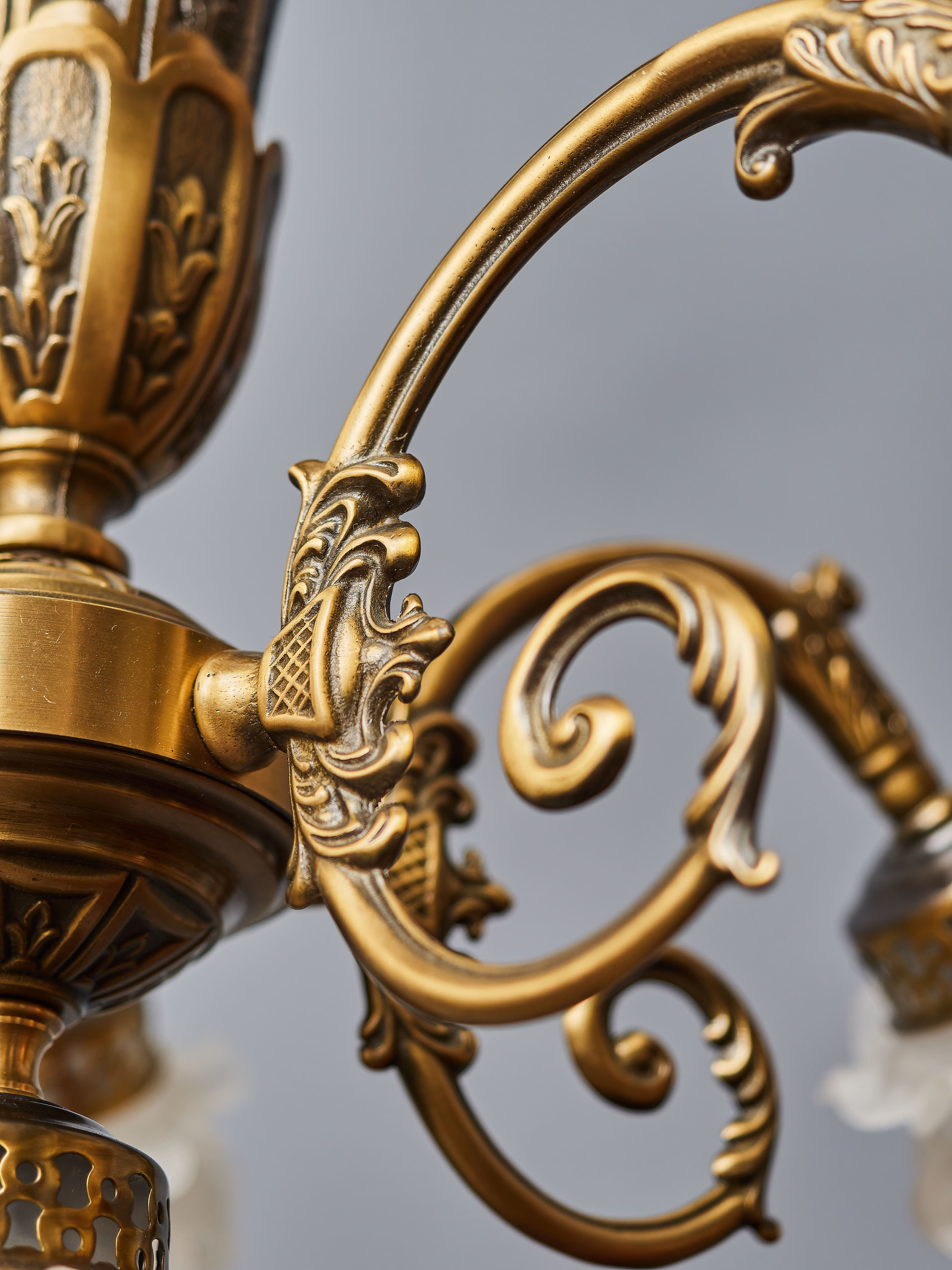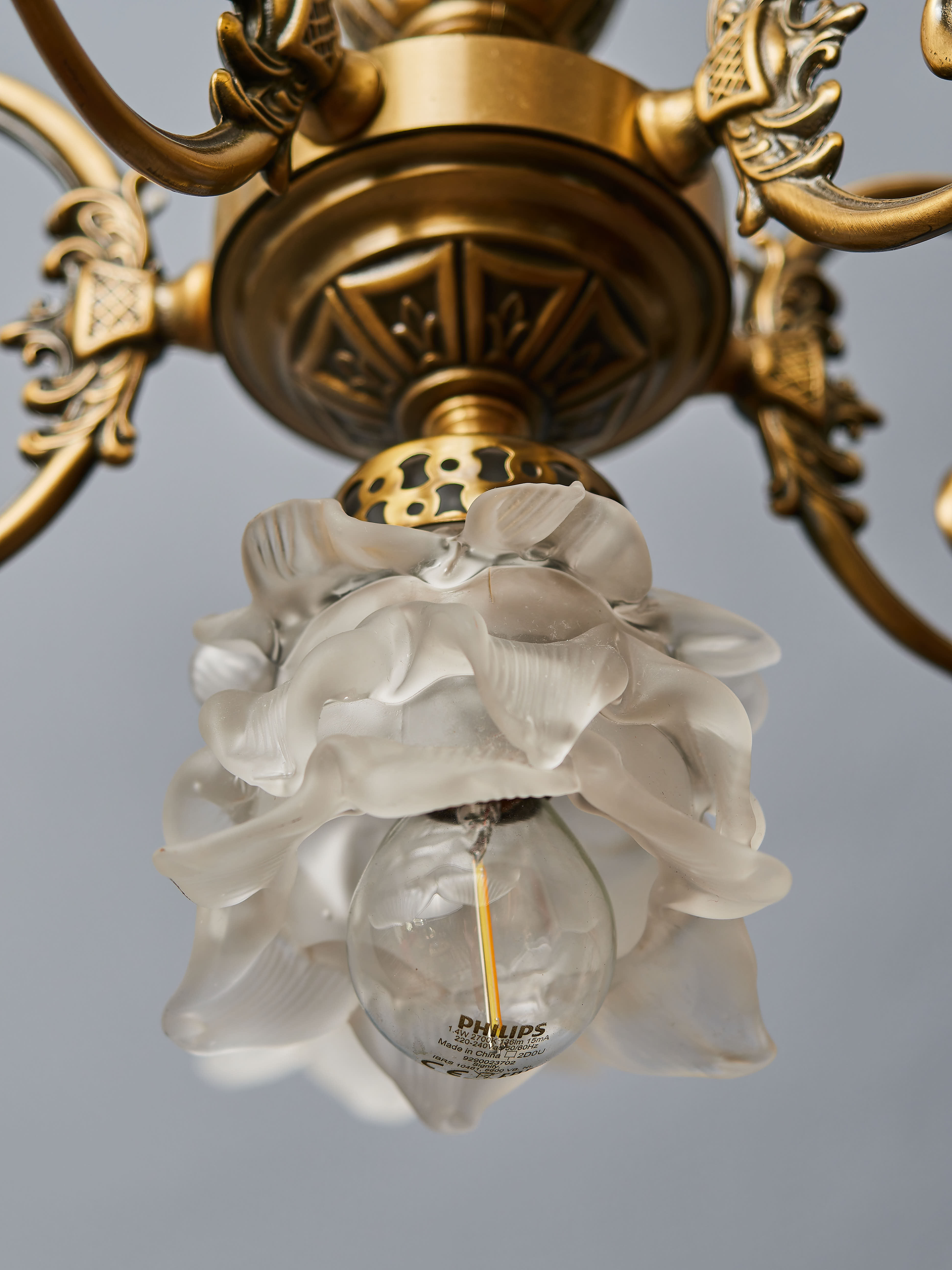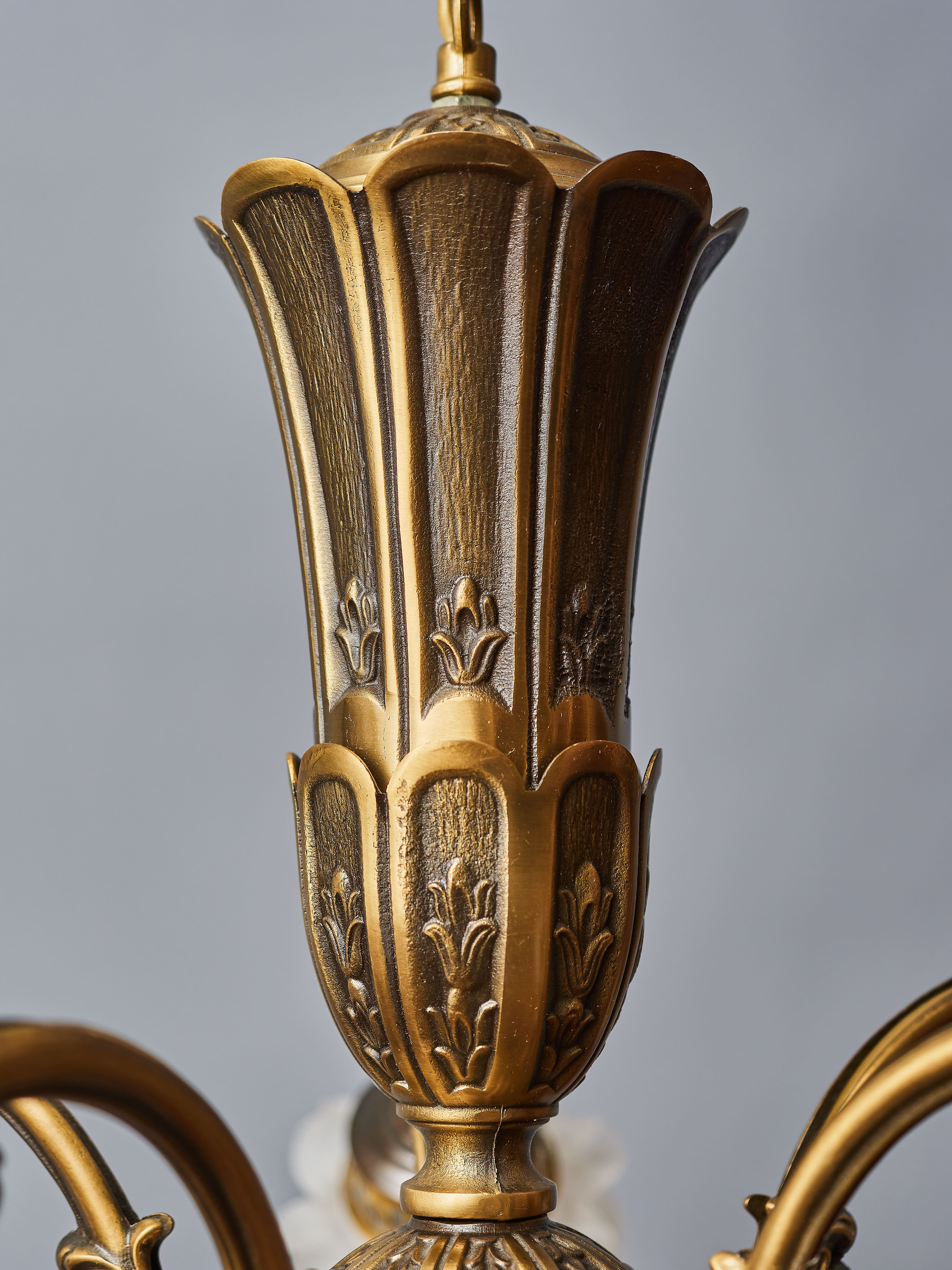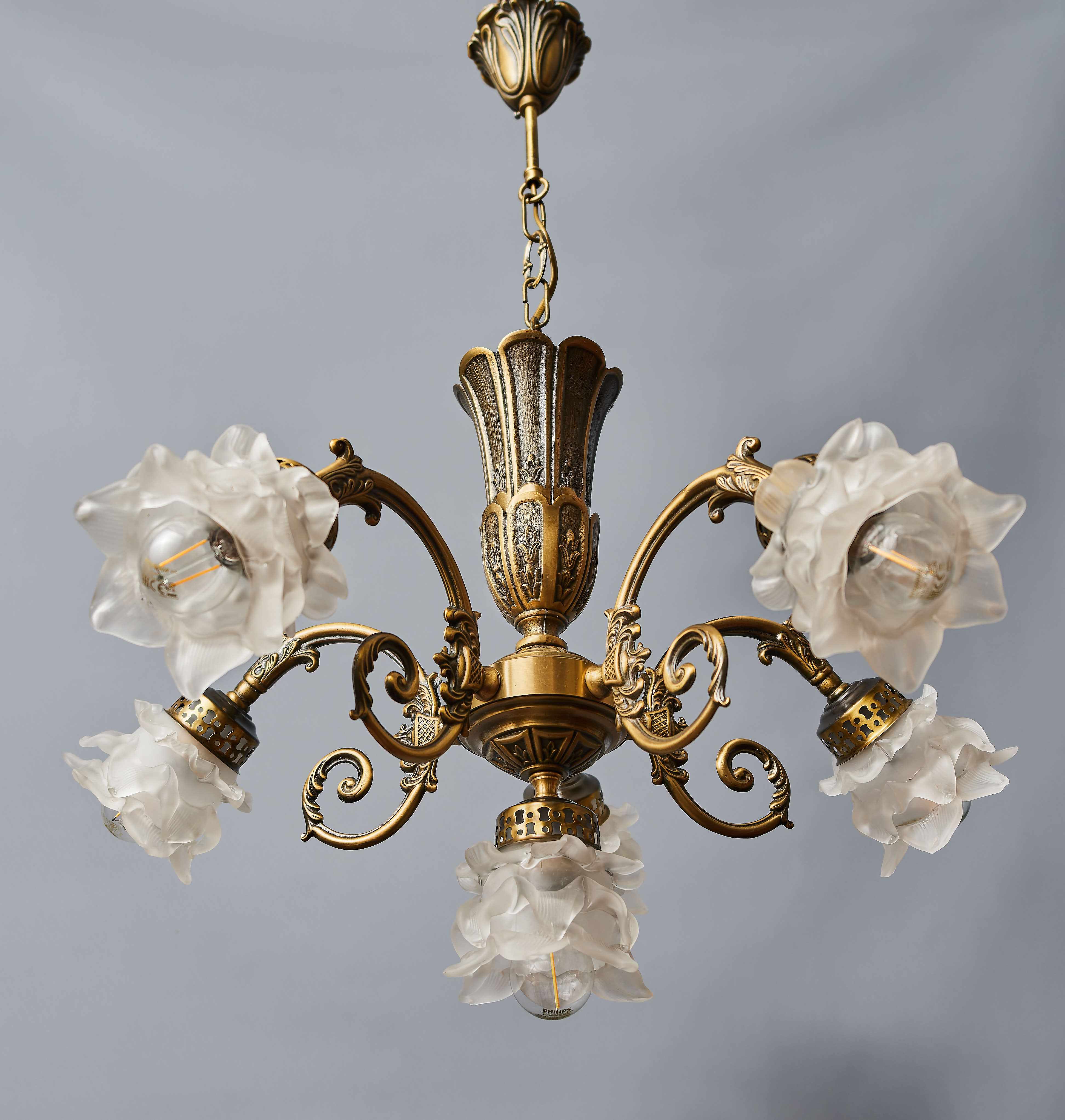 Elegantní mosazný lustr s šesti rameny, vyrobený kolem roku 1970. Lustr je zdoben detailně tvarovanými květinovými skleněnými stínidly z matného skla, která dodávají světlu jemný rozptyl a romantický charakter. Kovové prvky jsou zhotoveny z mosazi, zdobené dekorativními motivy a kroucenými rameny, které podtrhují klasický styl svítidla. Lustr prošel renovací elektroinstalace, díky čemuž je plně funkční a bezpečný pro použití. Díky svým rozměrům a váze působí reprezentativně a je vhodný pro historické i stylové interiéry.