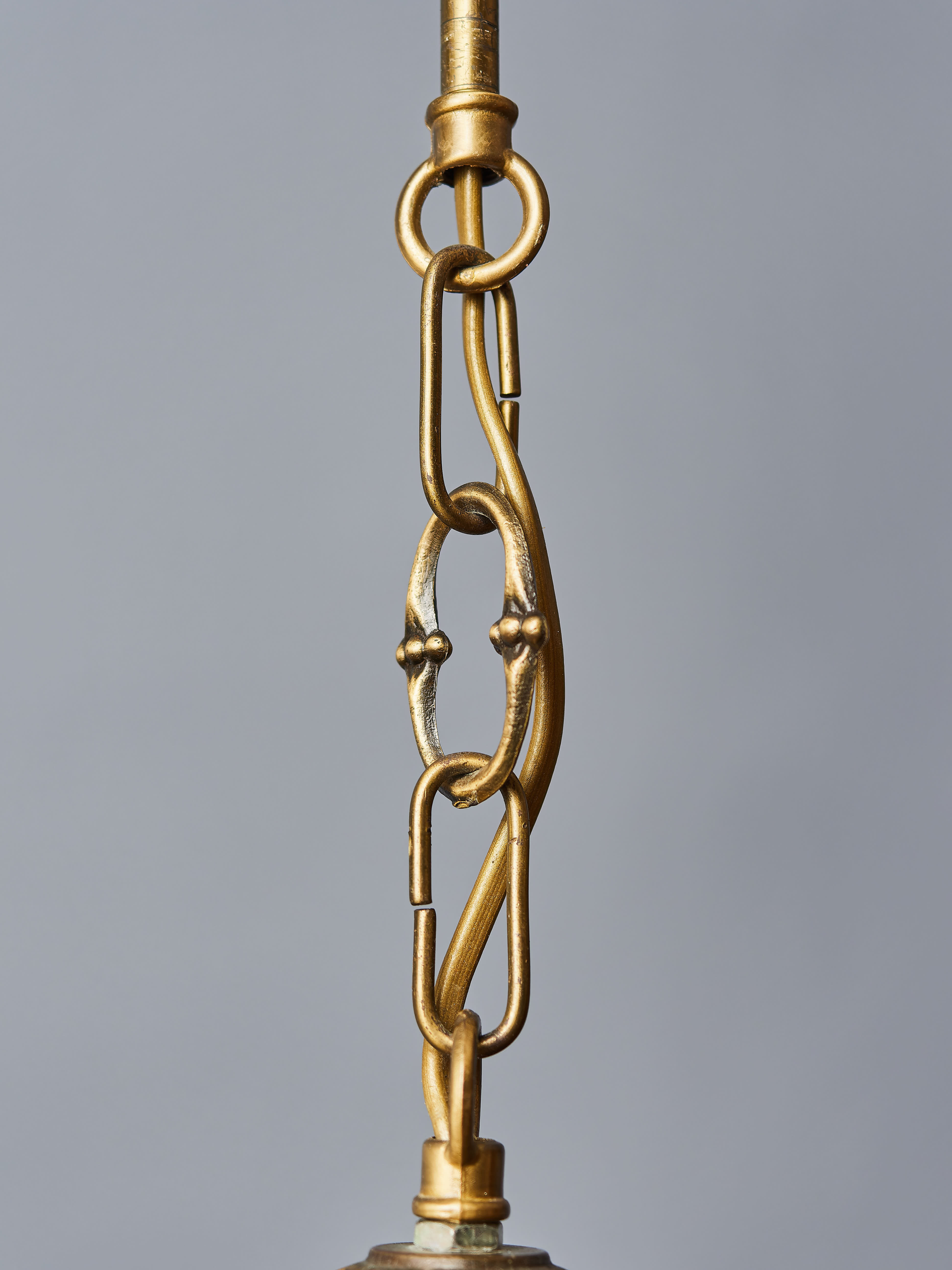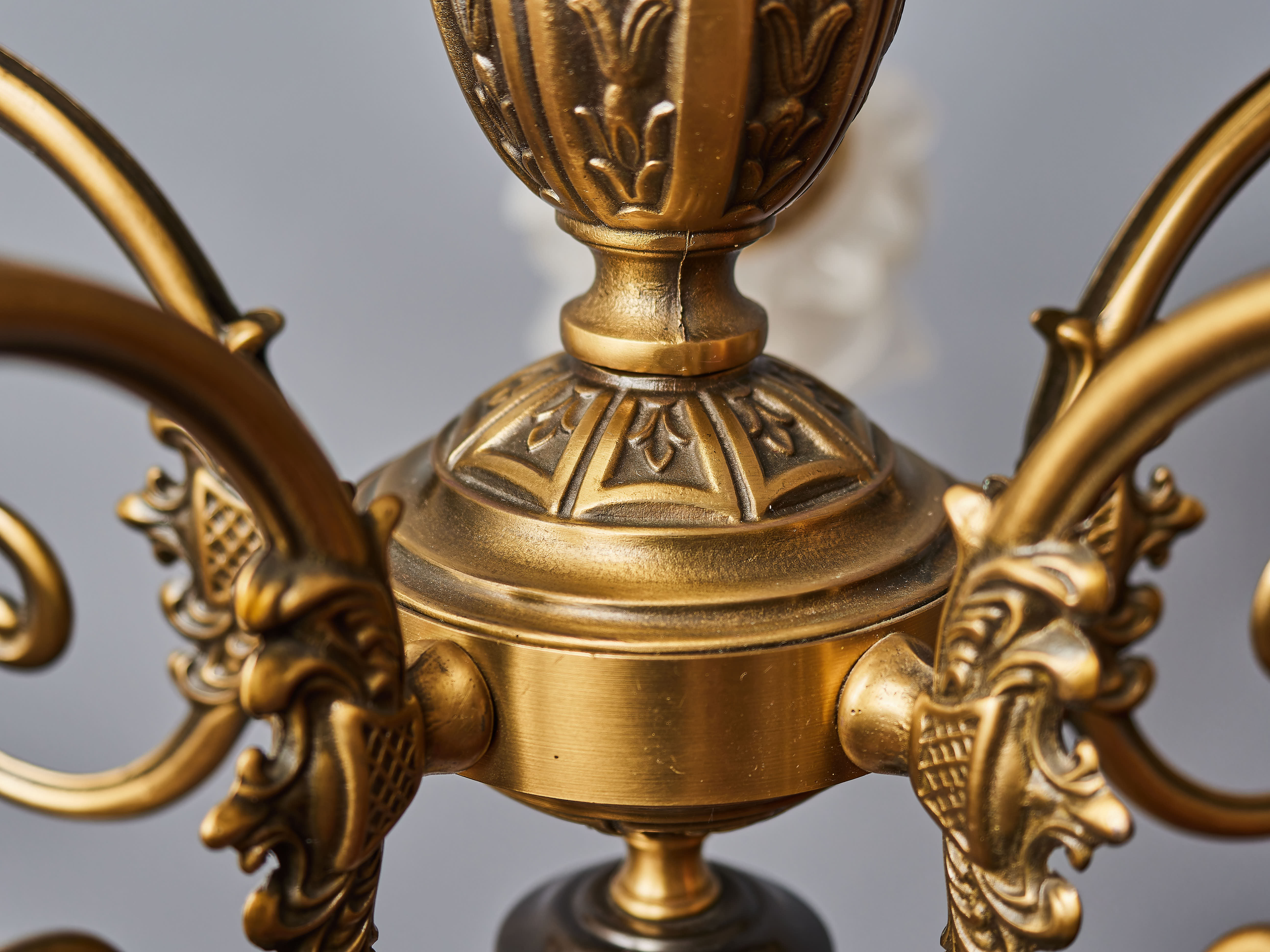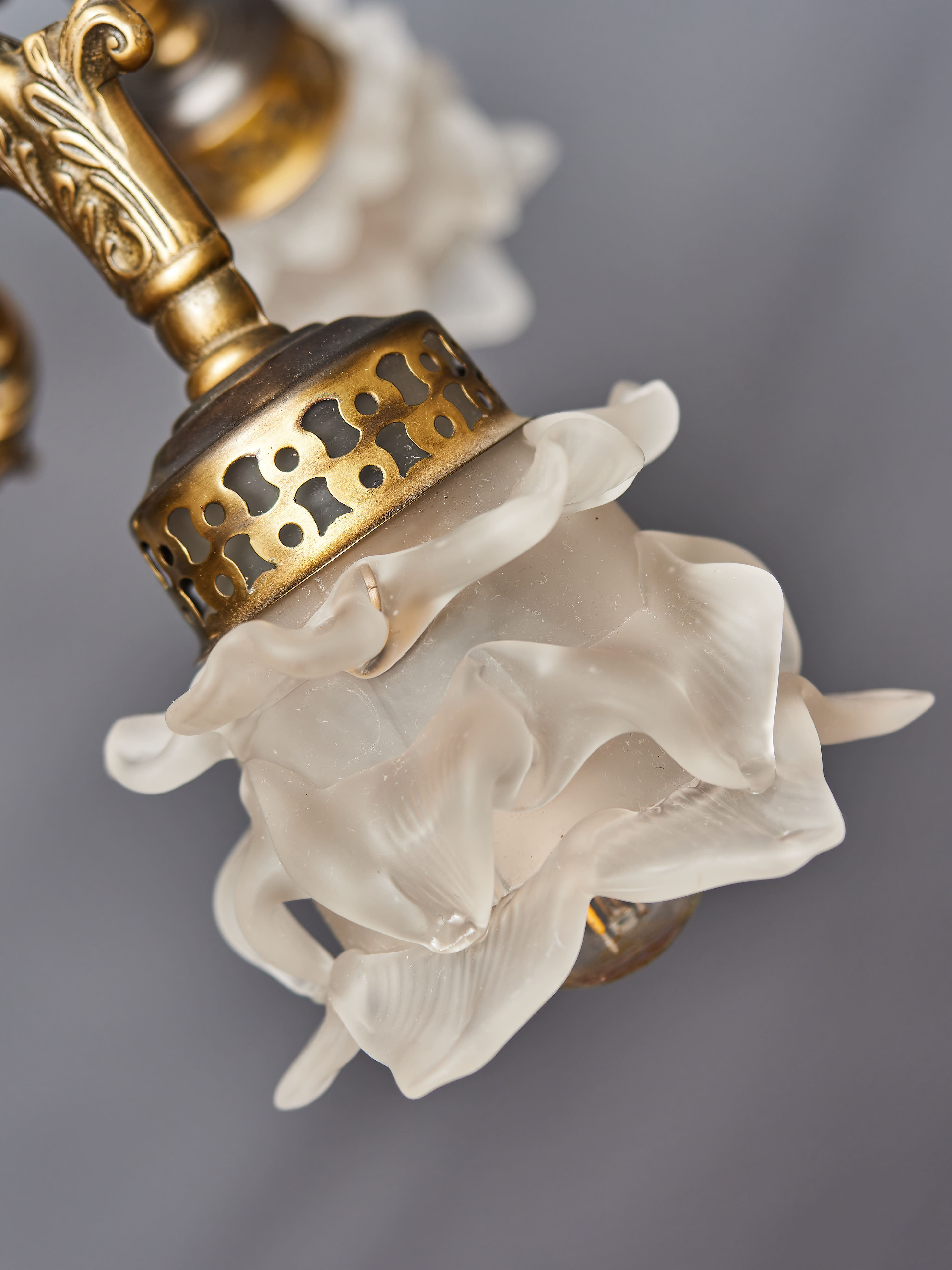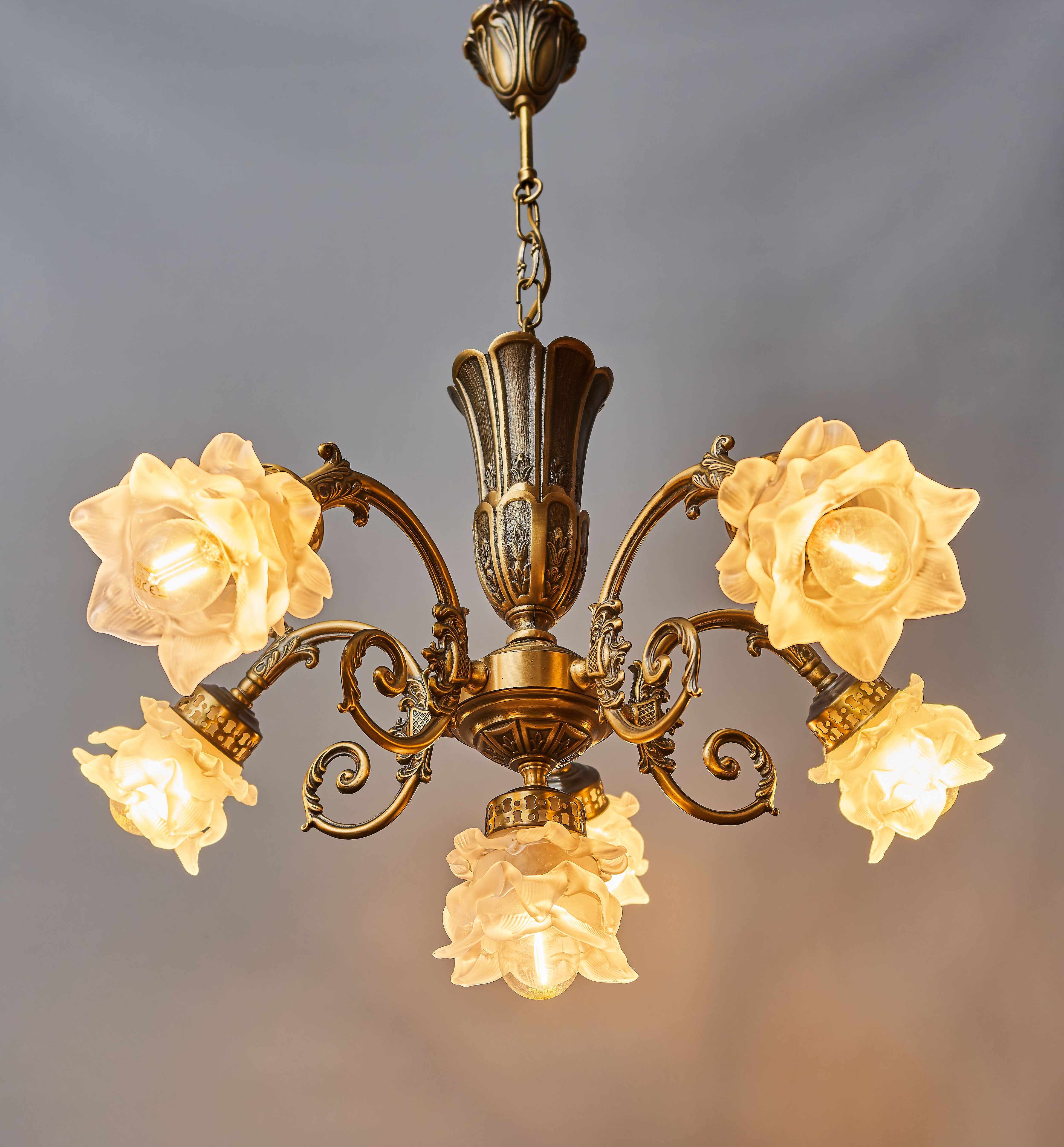 Elegantní mosazný lustr s šesti rameny, vyrobený kolem roku 1970. Lustr je zdoben detailně tvarovanými květinovými skleněnými stínidly z matného skla, která dodávají světlu jemný rozptyl a romantický charakter. Kovové prvky jsou zhotoveny z mosazi, zdobené dekorativními motivy a kroucenými rameny, které podtrhují klasický styl svítidla. Lustr prošel renovací elektroinstalace, díky čemuž je plně funkční a bezpečný pro použití. Díky svým rozměrům a váze působí reprezentativně a je vhodný pro historické i stylové interiéry.