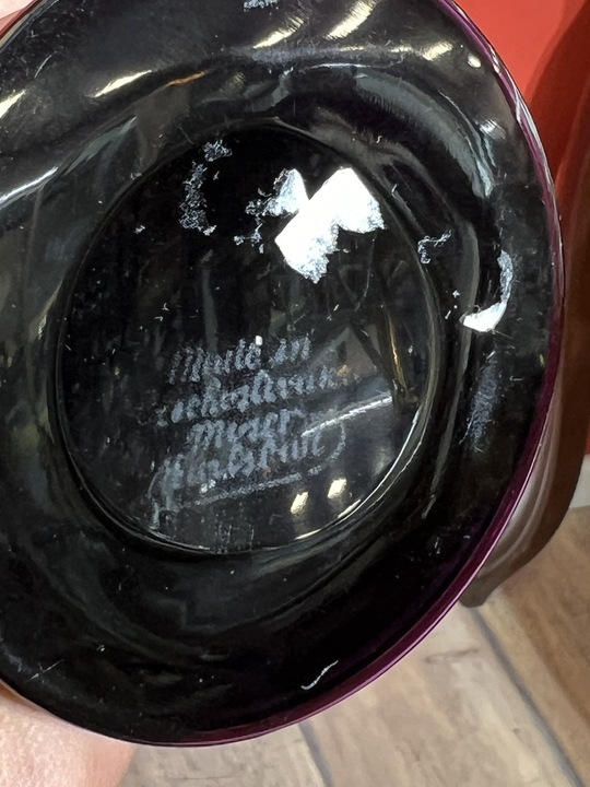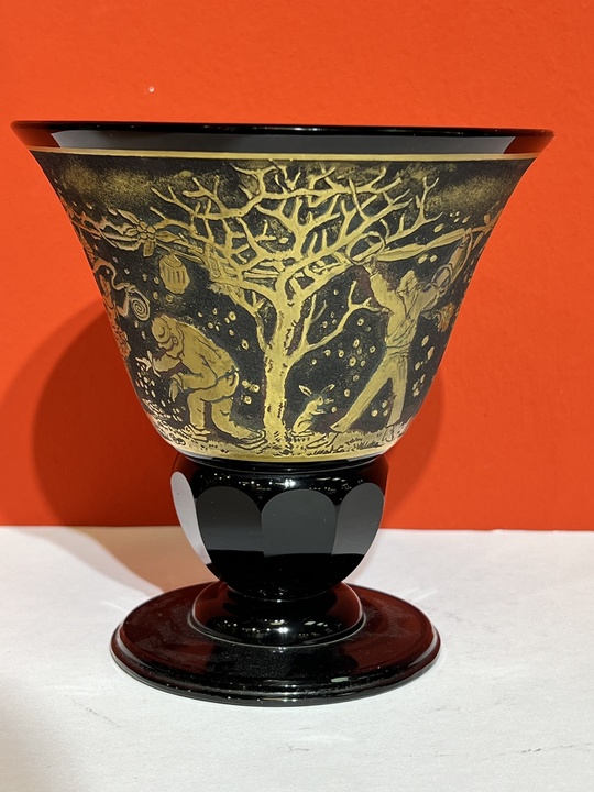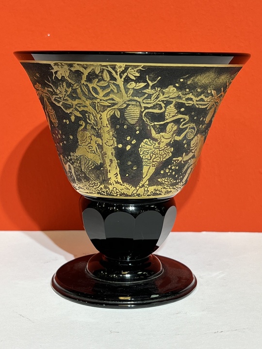 váza z tmavě ametystového skla zdobená zlacenou oroplastikou s motivem zhasínačů lamp,