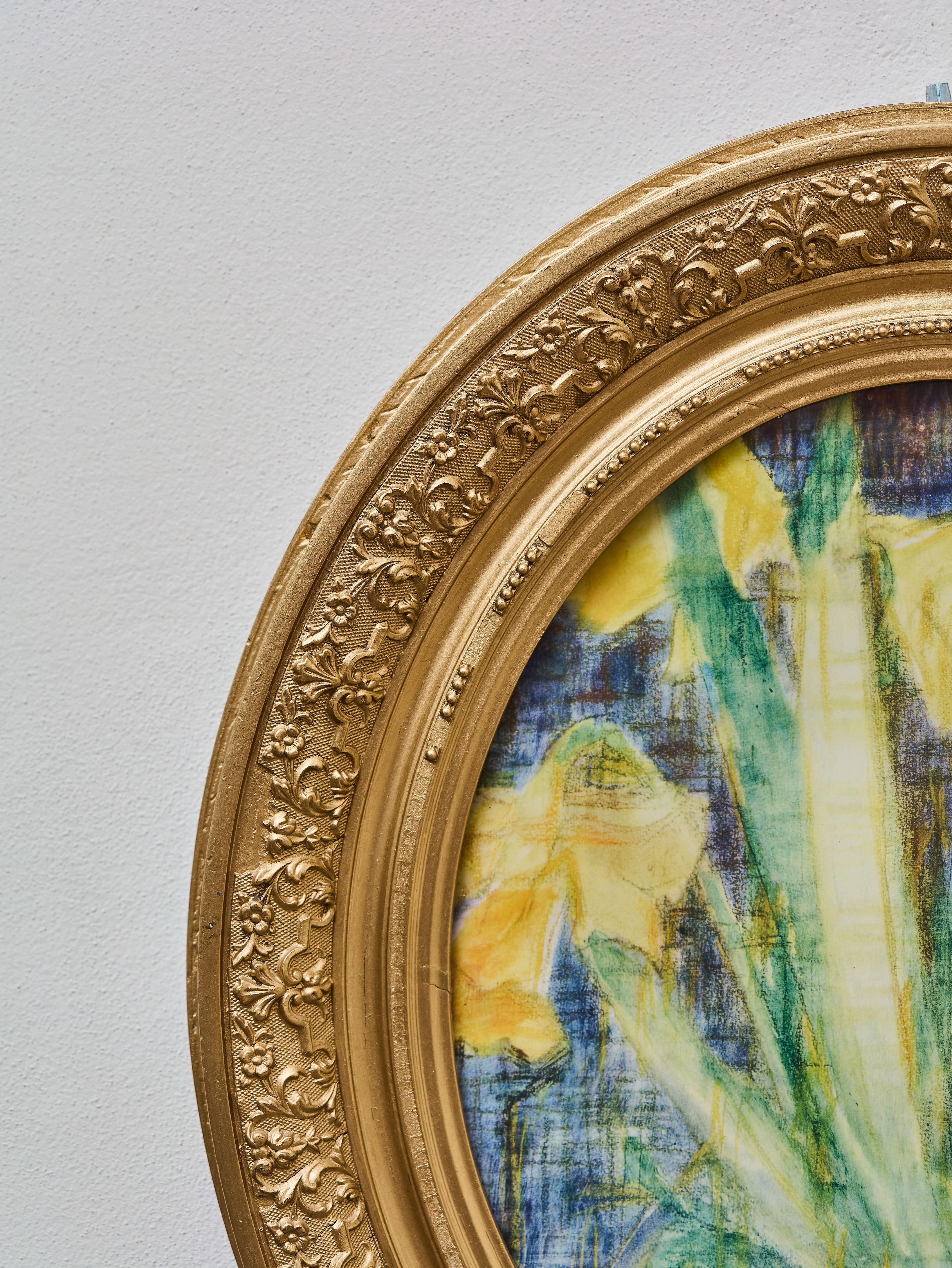 Obraz je zasazen do krásného oválného rámu s plastickým zlaceným dekorem, který podtrhuje jeho estetickou hodnotu a dodává mu elegantní vzhled. Díky svým rozměrům se hodí jak do menšího salonu či ložnice, tak i jako výrazný doplněk většího interiéru.