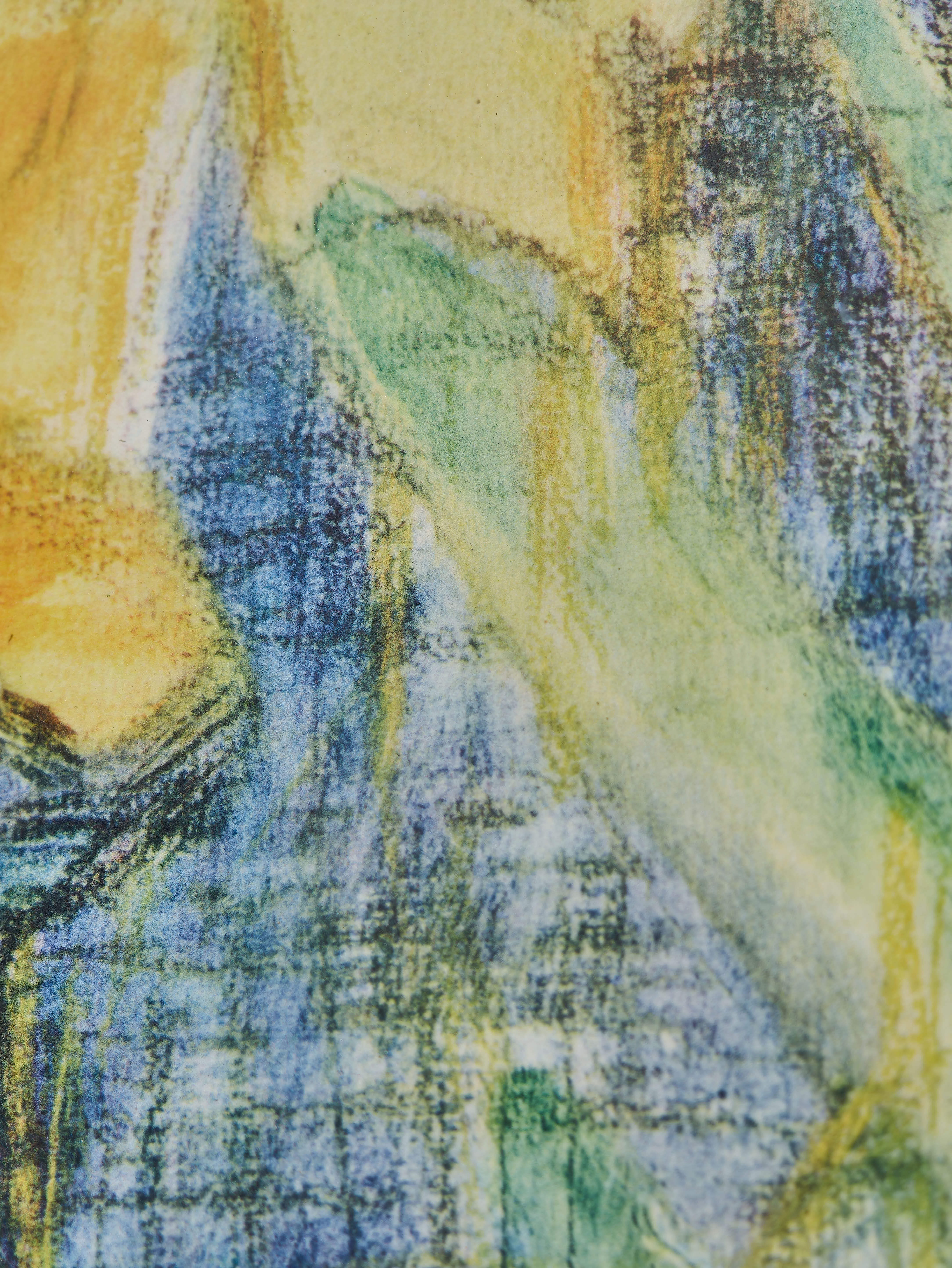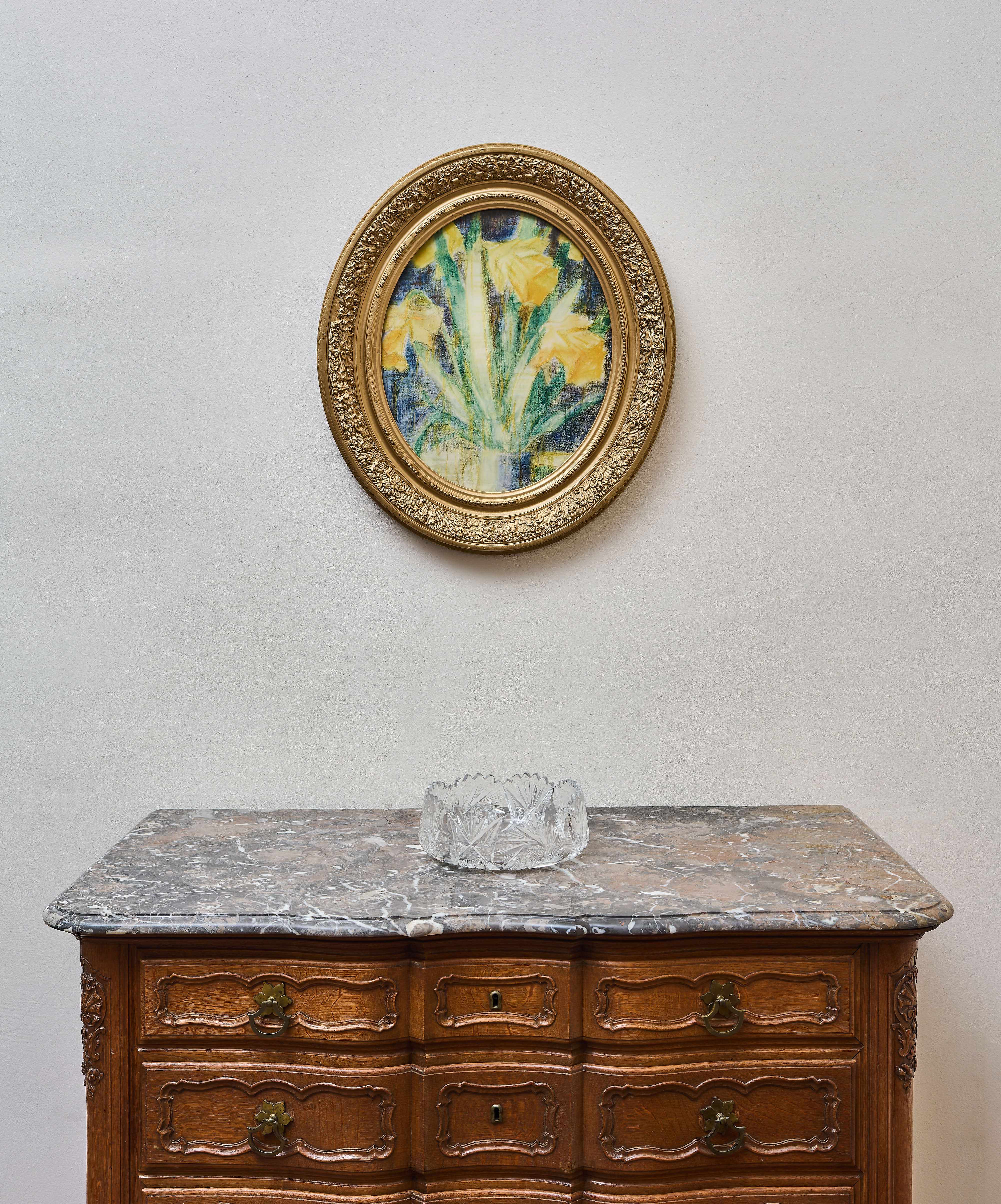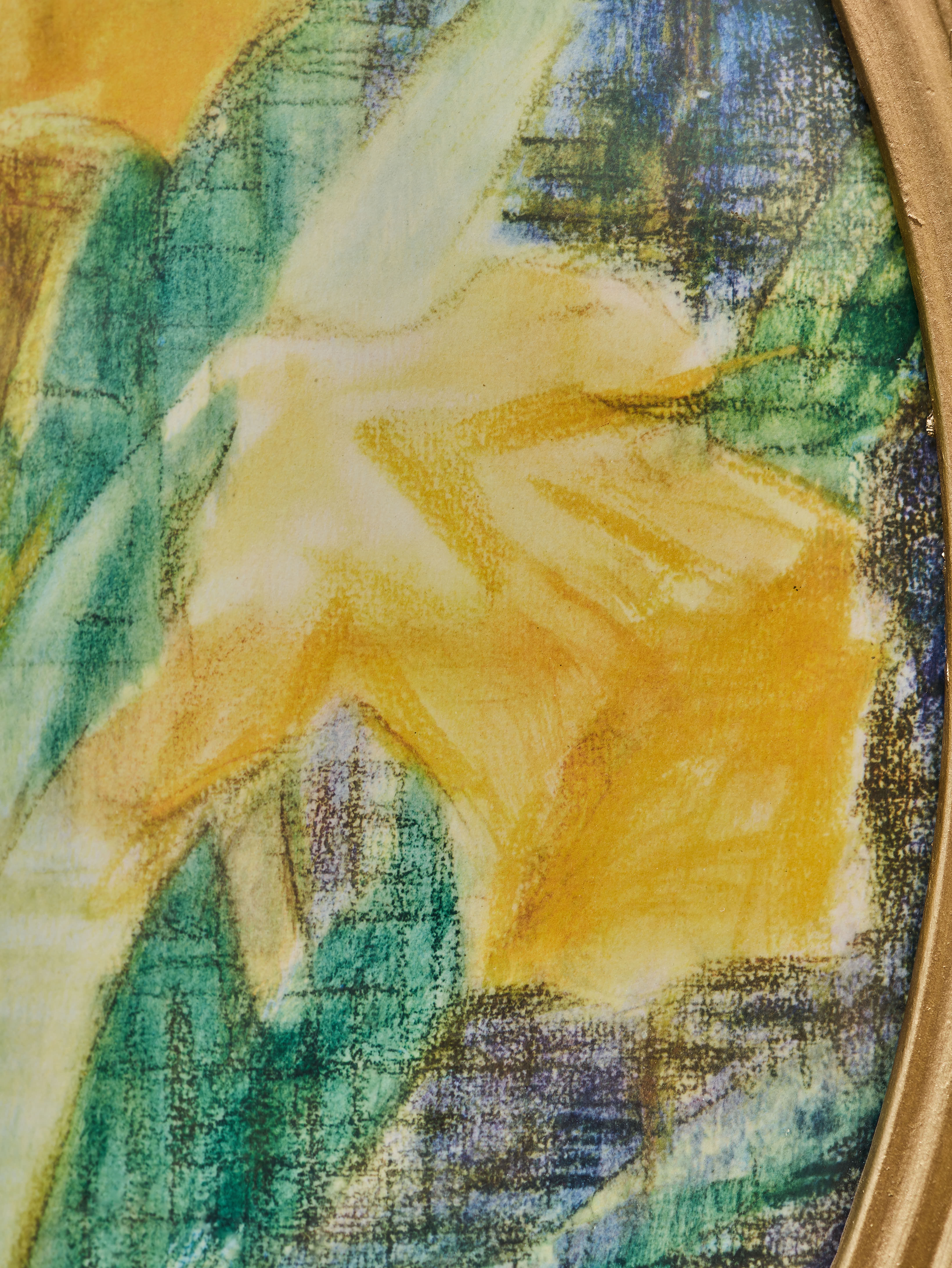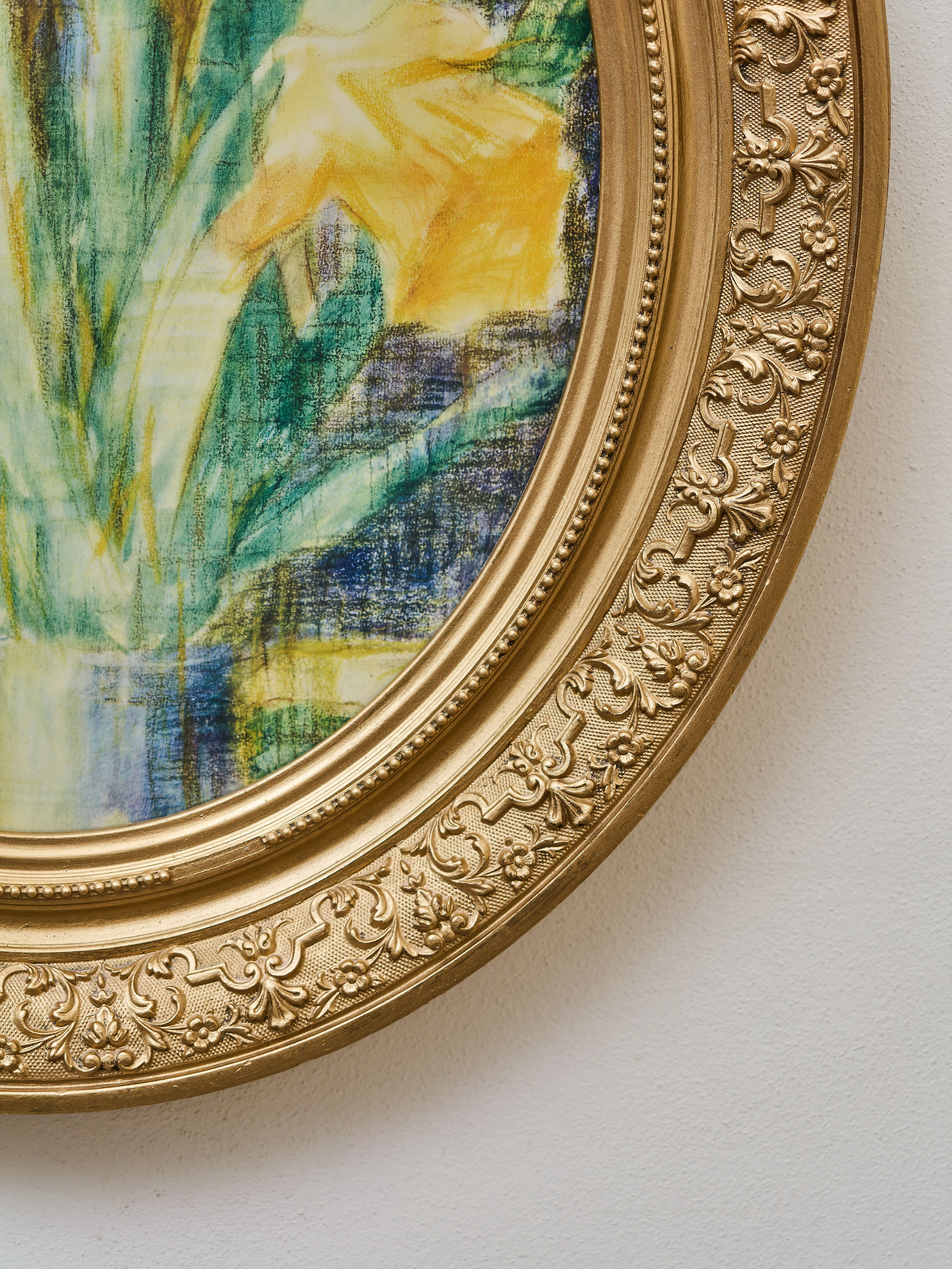 Jemně laděná malba zachycuje svazek rozkvetlých žlutých narcisů ve váze, podaných s lehkostí a uměleckou zkratkou. Kombinace sytých odstínů žluté, zelené a modré vytváří harmonickou kompozici, která vyzařuje svěžest a optimismus. Dílo působí moderně, avšak s klasickým výtvarným cítěním.