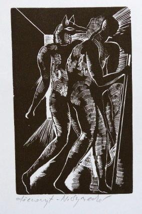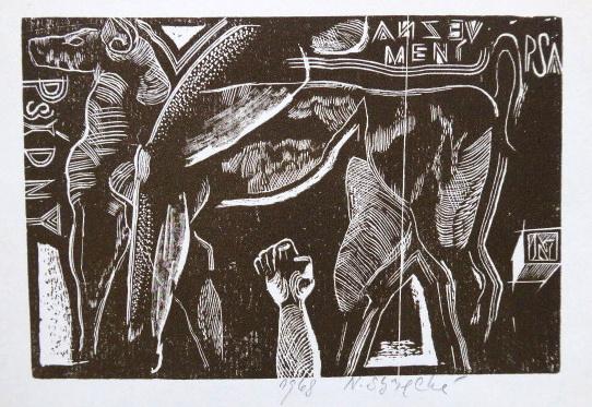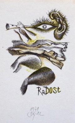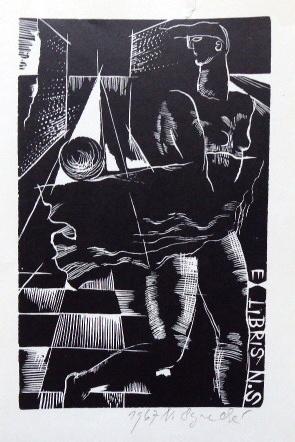 3 x dřevoryt na papíře ( 1 x mírně natržený papír v horní části ) 14 x 9 cm, 10 x 15 cm, 14 x 9 cm. Signováno tužkou vpravo dole, datováno 1967 a 1968. Ve znamení psa – psí dny, Ex libris N. S. , dřevoryt – Synecká. 2 x barevná litografie na papíře 10 x 7 cm, 12,5 x 7 cm. Signováno tužkou vlevo dole, uprostřed dole, datováno 1971. 1 x název grafického listu v desce – Radost. Naděžda Synecká ( 23. 6. 1926 Praha ) studium: Officina Pragensis škola Jaroslava Švába v Praze 1944 – 1946, Akademie výtvarných umění v Praze 1946 – 1950 prof. Vladimír Silovský. člen: Sdružení českých umělců grafiků Hollar, Nové sdružení pražských umělců, Český fond výtvarných umění.
