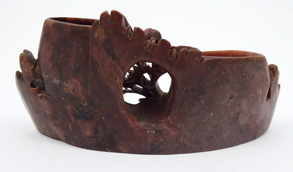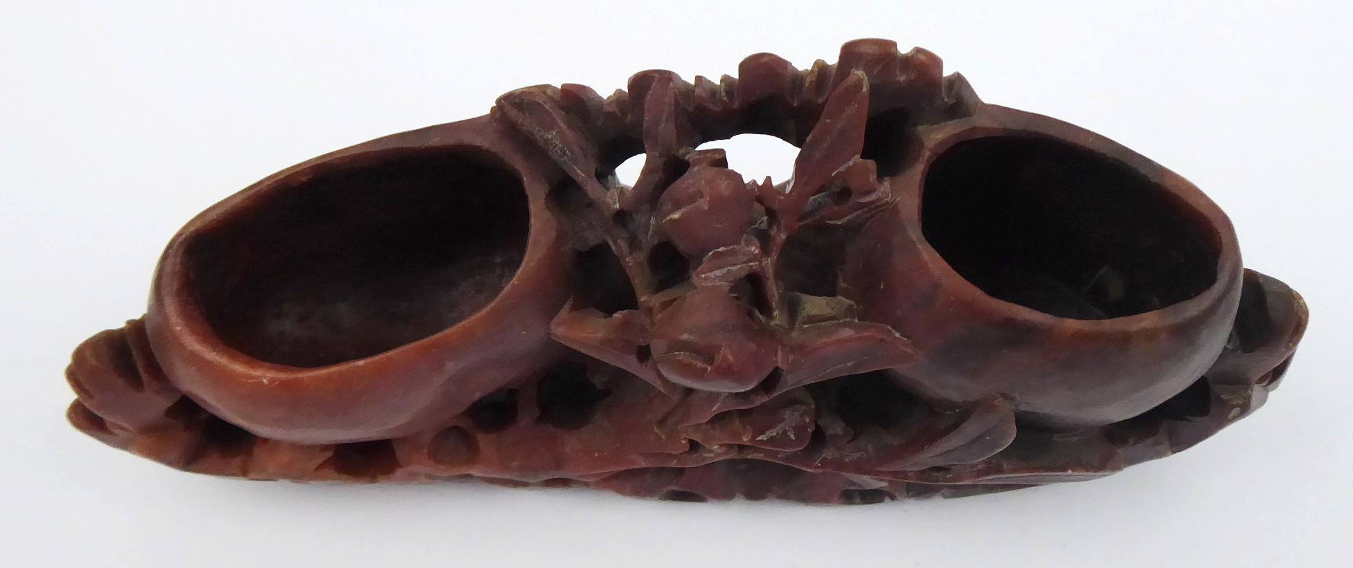 Steatit (mastek) ručně řezbovaný. V tradičním čínském stylu. Ručně řezbovaná dvojitá nádobka na tuš oválného tvaru ze steatitu v tradičním čínském stylu dekorovaná vinoucími se úponky s listy a poupaty květů. Čína, minulé století. Výška 7 cm, šířka 16 cm.