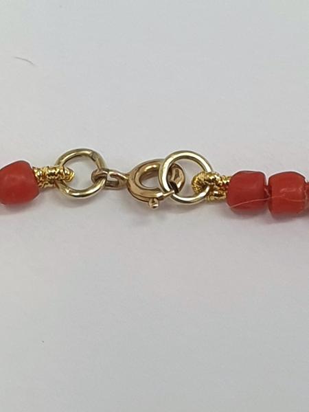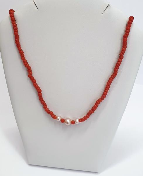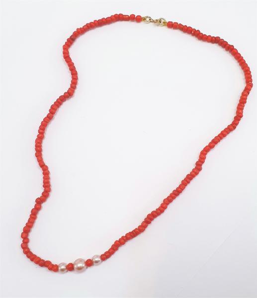 Náhrdelník z pravých mořských korálů v odstínu oranžově-červené barvy doplněné přírodními říčními perličkami, náhrdelník má zapínání ze 14 karátového zlata = ouška + pérový kroužek je AU 585/1000 žluté zlato – jen malá očko přímo na niti je pozlacené.