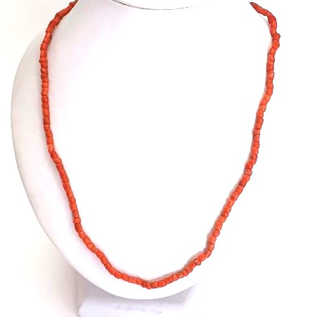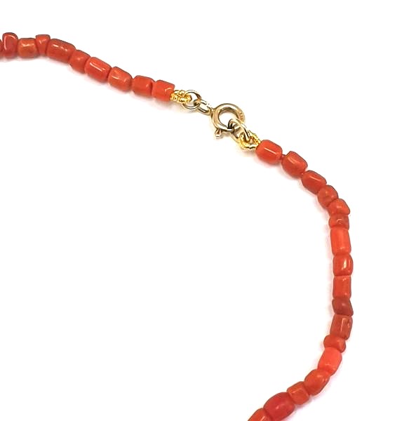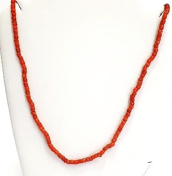 Náhrdelník s pravými mořskými korály v odstínu oranžovo-červené barvy, délka náhrdelníku 49.6 cm. Náhrdelník z období kolem roku 1930 z okolí Makarské v bývalé Jugoslávii. Úchytky šňůrky pozlacené, ale zapínání – pérový kroužek i ouška jsou ze 14 karátového zlata. Váha náhrdelníku brutto 11,60 gramů