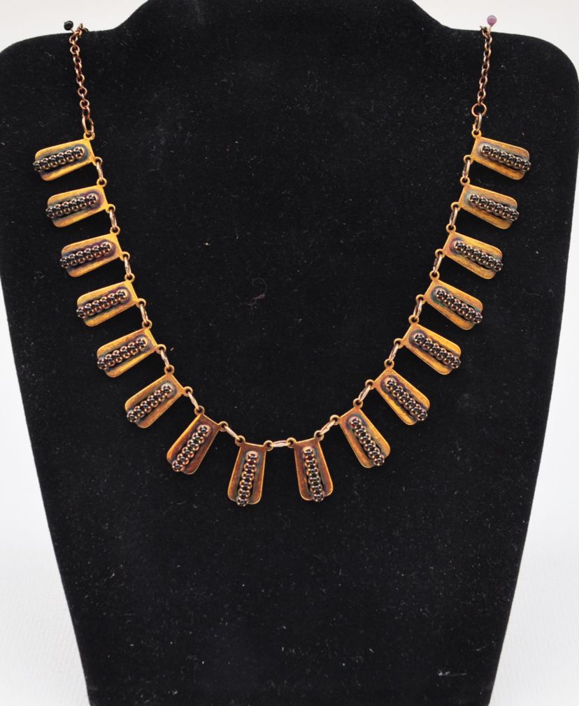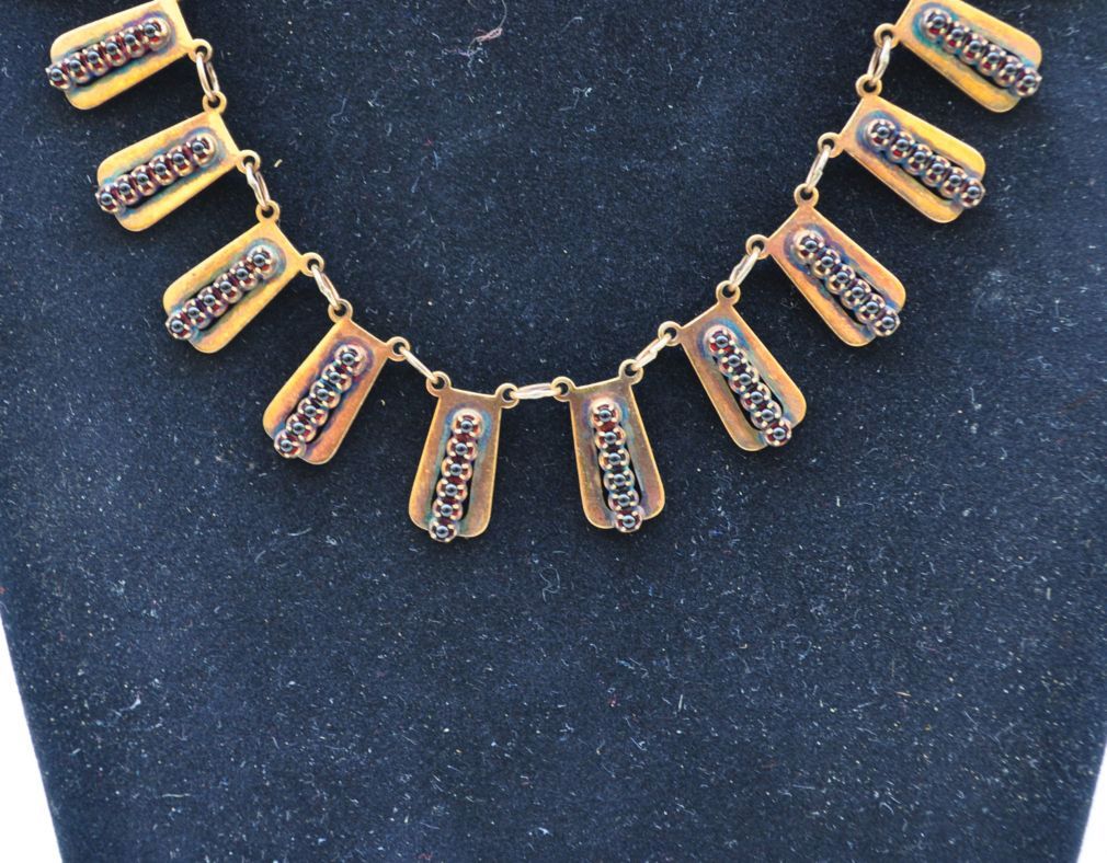 Stříbrný, zlacený náhrdelník s drobnými českými granáty, Ag btto 16,15g/900/000, značeno platnou puncovní značkou, Československo, kolem roku 1970; délka 42,5 cm