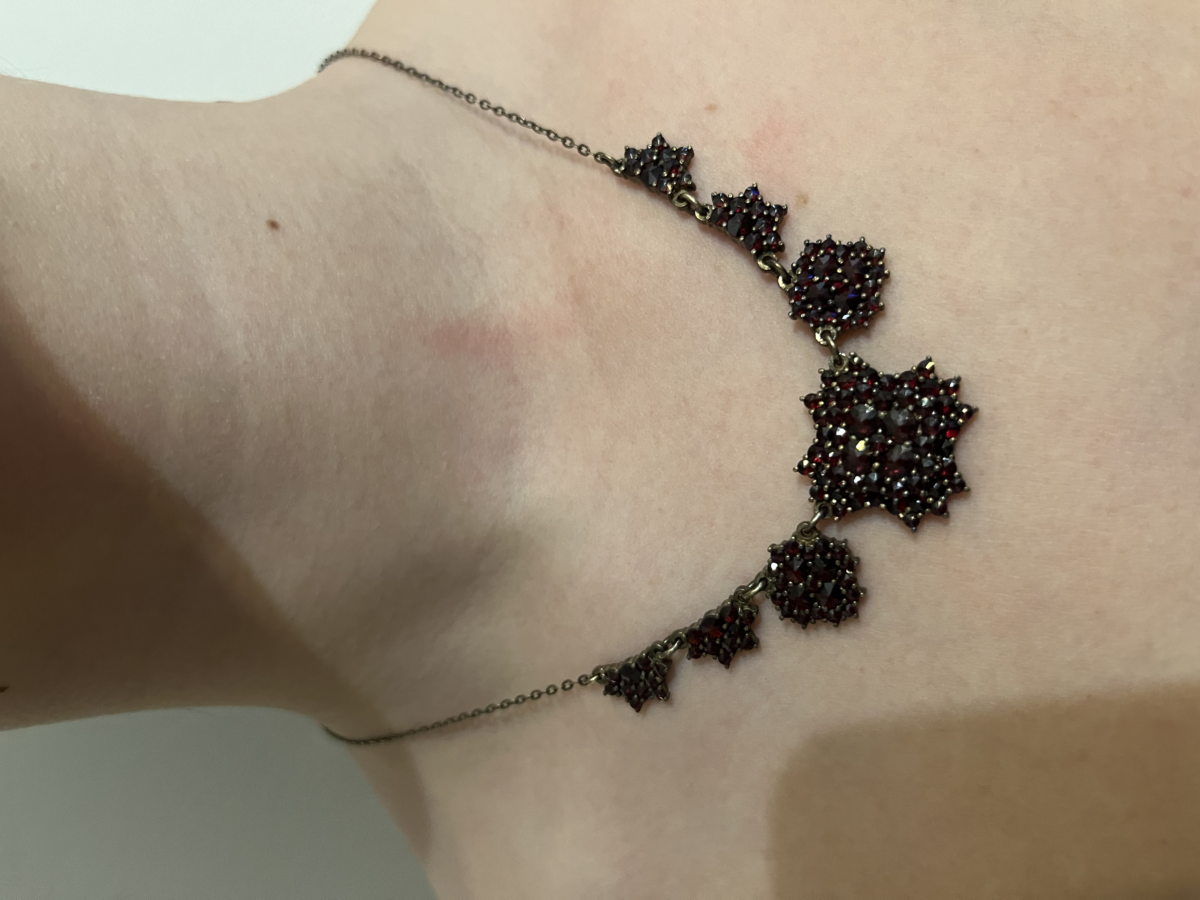 Náhrdelník v perfektní původním stavu, ale není odborně čištěn je zanechaná patina šperku. Na přání lze odborně vyčistit. Kameny jsou české granáty a v centrální části 4 větší kameny přírodní almandiny.