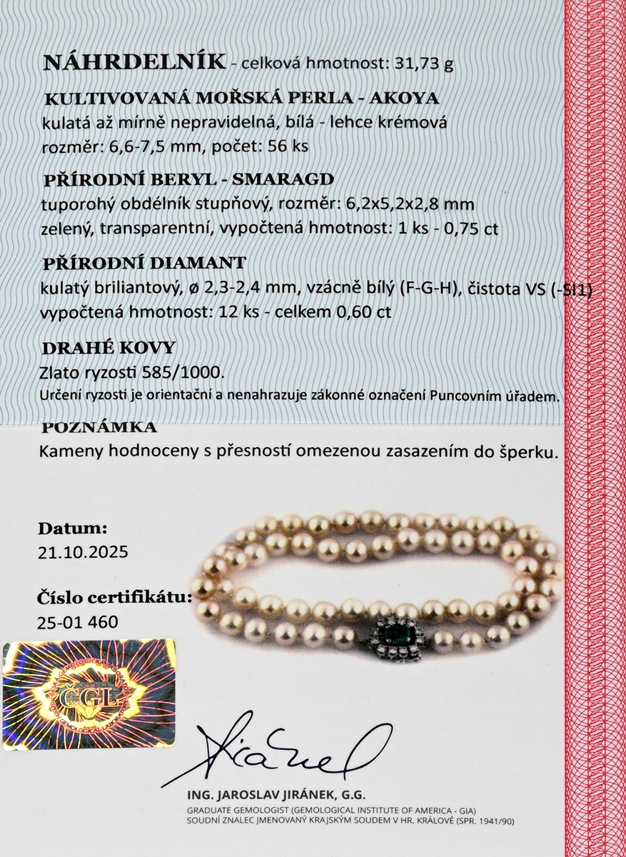 – 56 ks kultivovaných mořských perel Akoya, kulaté až mírně nepravidelné, bílé až lehce krémové, rozměr 6,6–7,5 mm