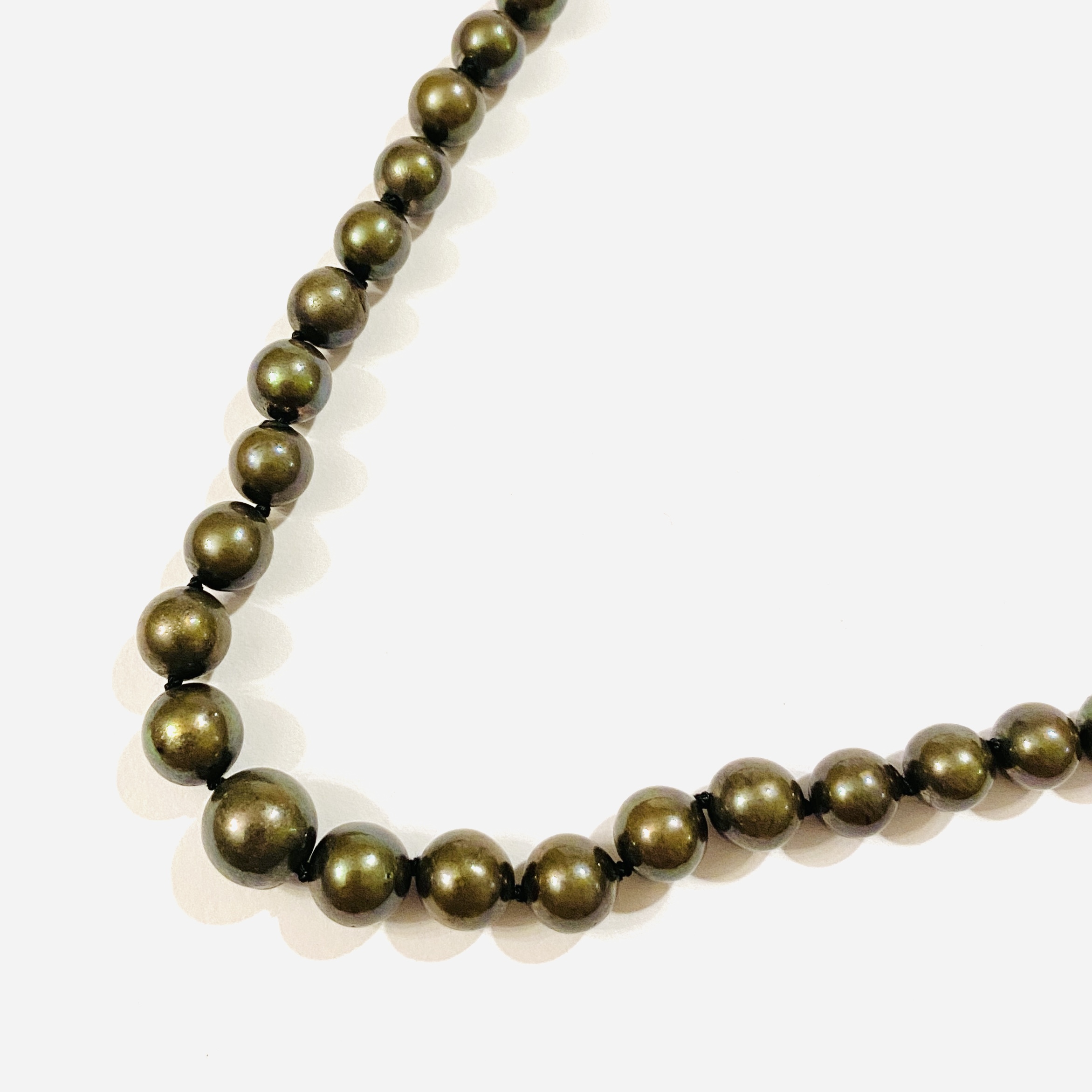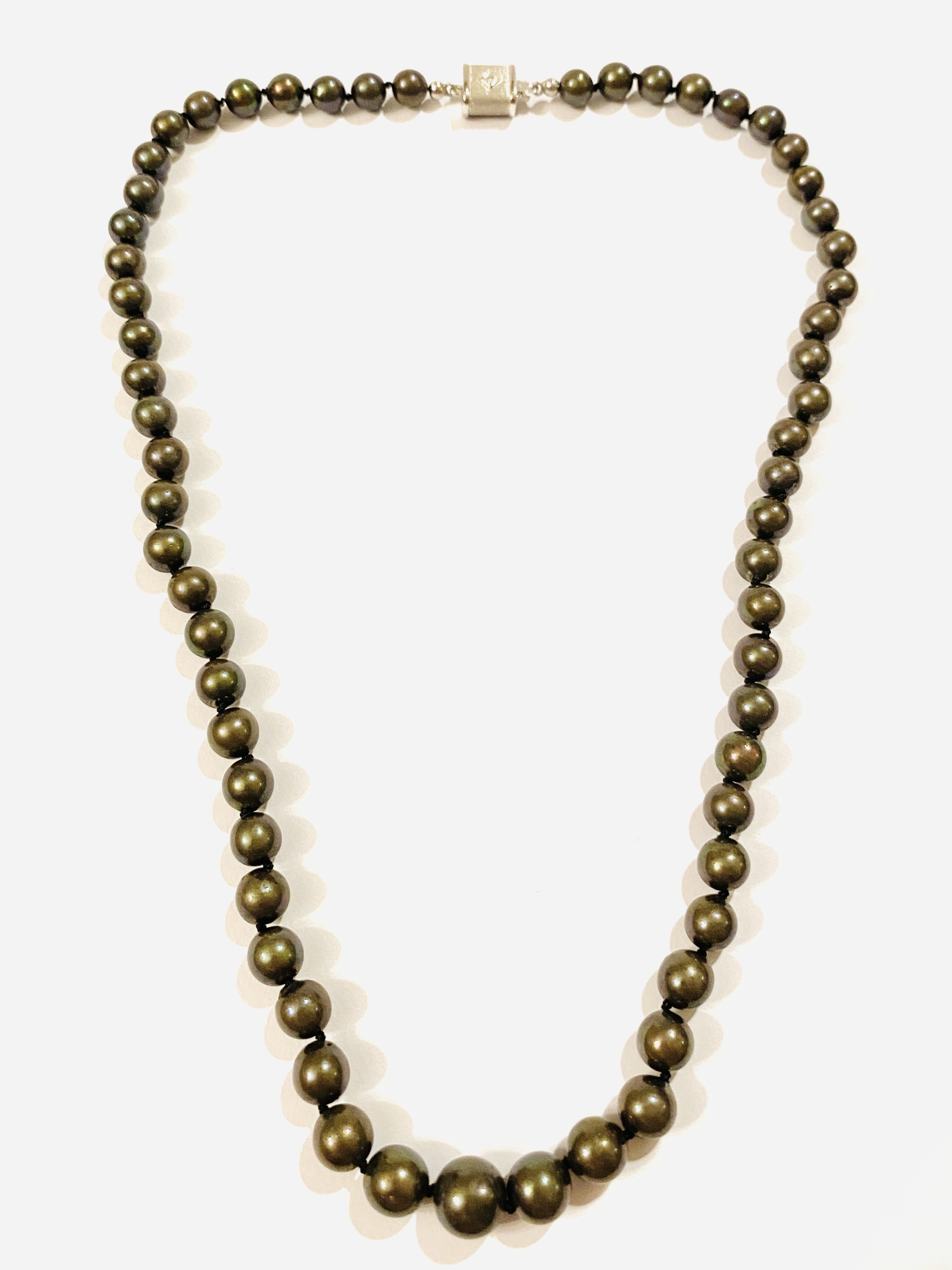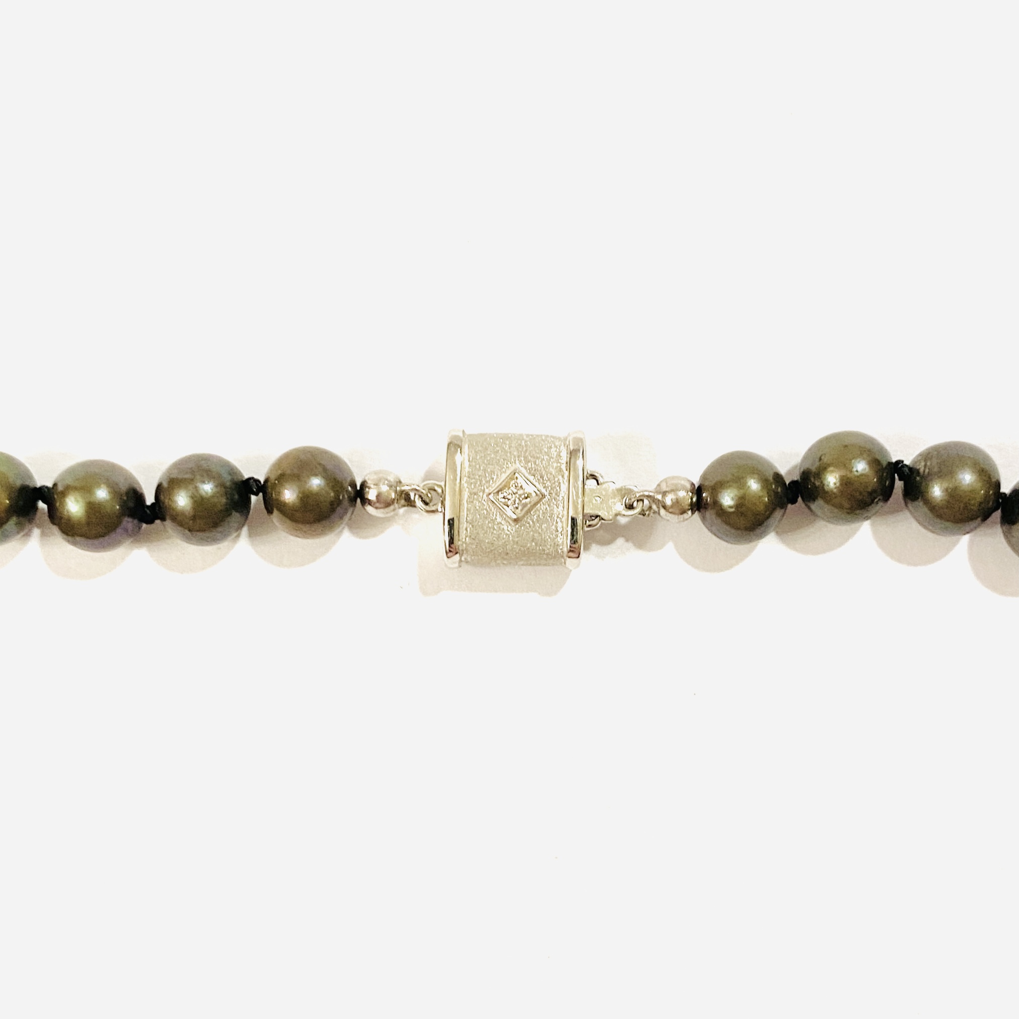 Výrazný náhrdelník ze stupňovité šňůry přírodních kultivovaných thajských perel, které vynikají svou kulatostí a průměrem 6 až 9 mm. Moderní čtvercové zapínání osazeno z obou stran přírodními diamanty kulatého briliantového brusu o celkové váze 0,02 ct (0,01 ct – 2 ks), jež jsou velmi dobré kvality, kontrastní lesklá a pískovaná povrchová úprava kovu. Kvalitní netuzemská práce z poslední pětiny 20. století.