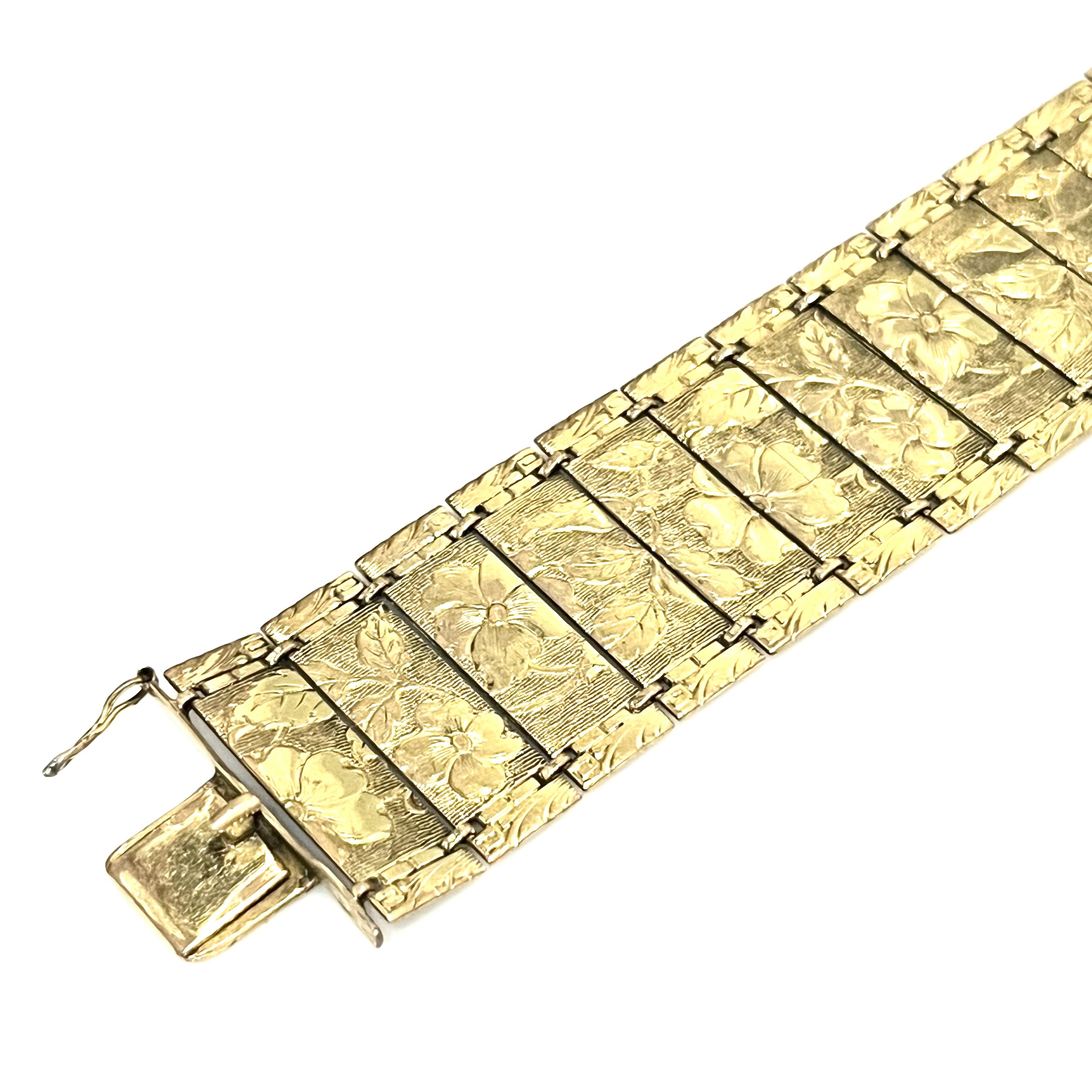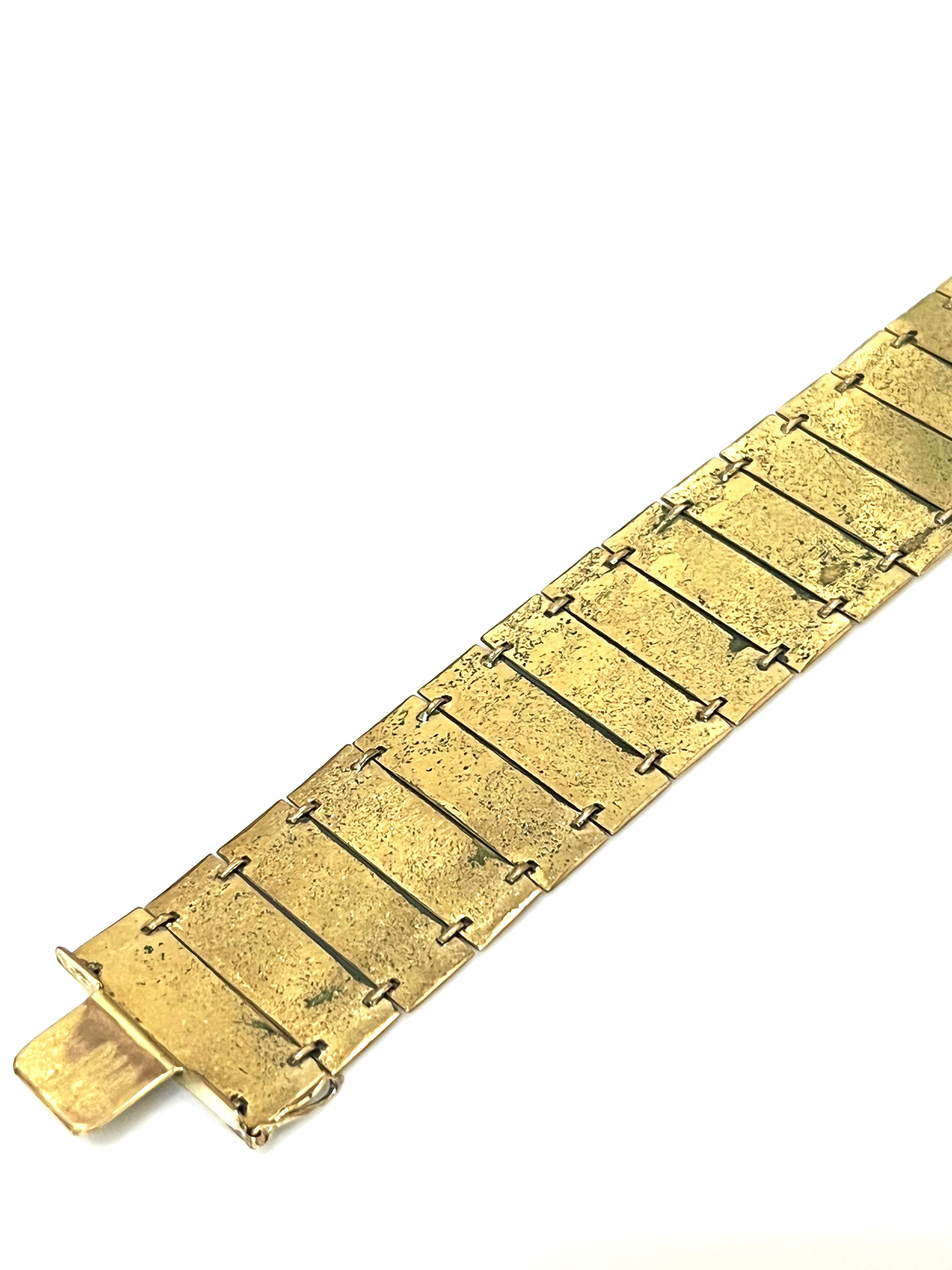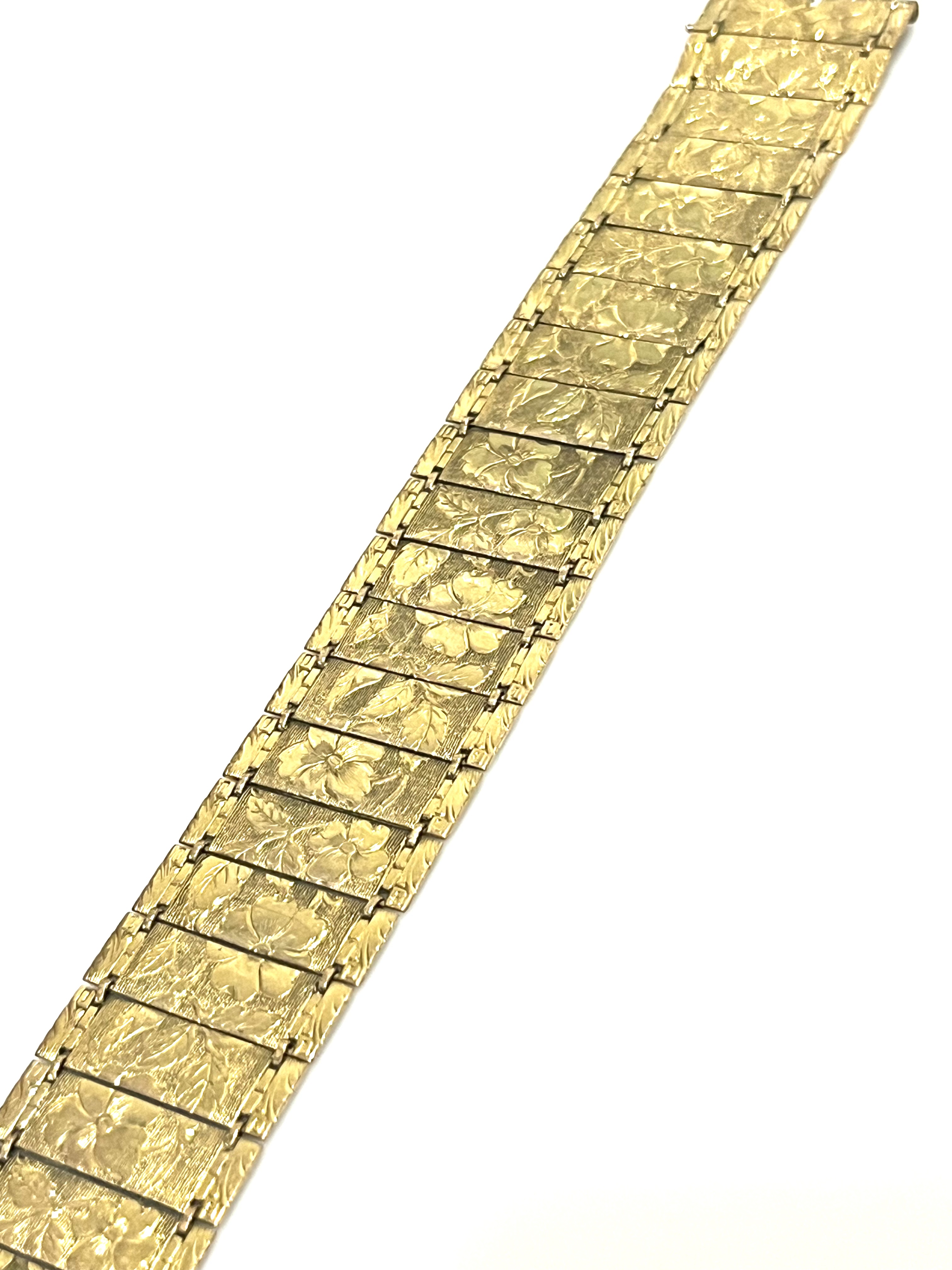 Elegantní široký náramek z období první republiky ČSR, ručně vyrobený a krásně ozdobně gravírovaný. Technicky v dobrém stavu, pouze oxidace uvnitř náramku. Náramek má i pojistku.