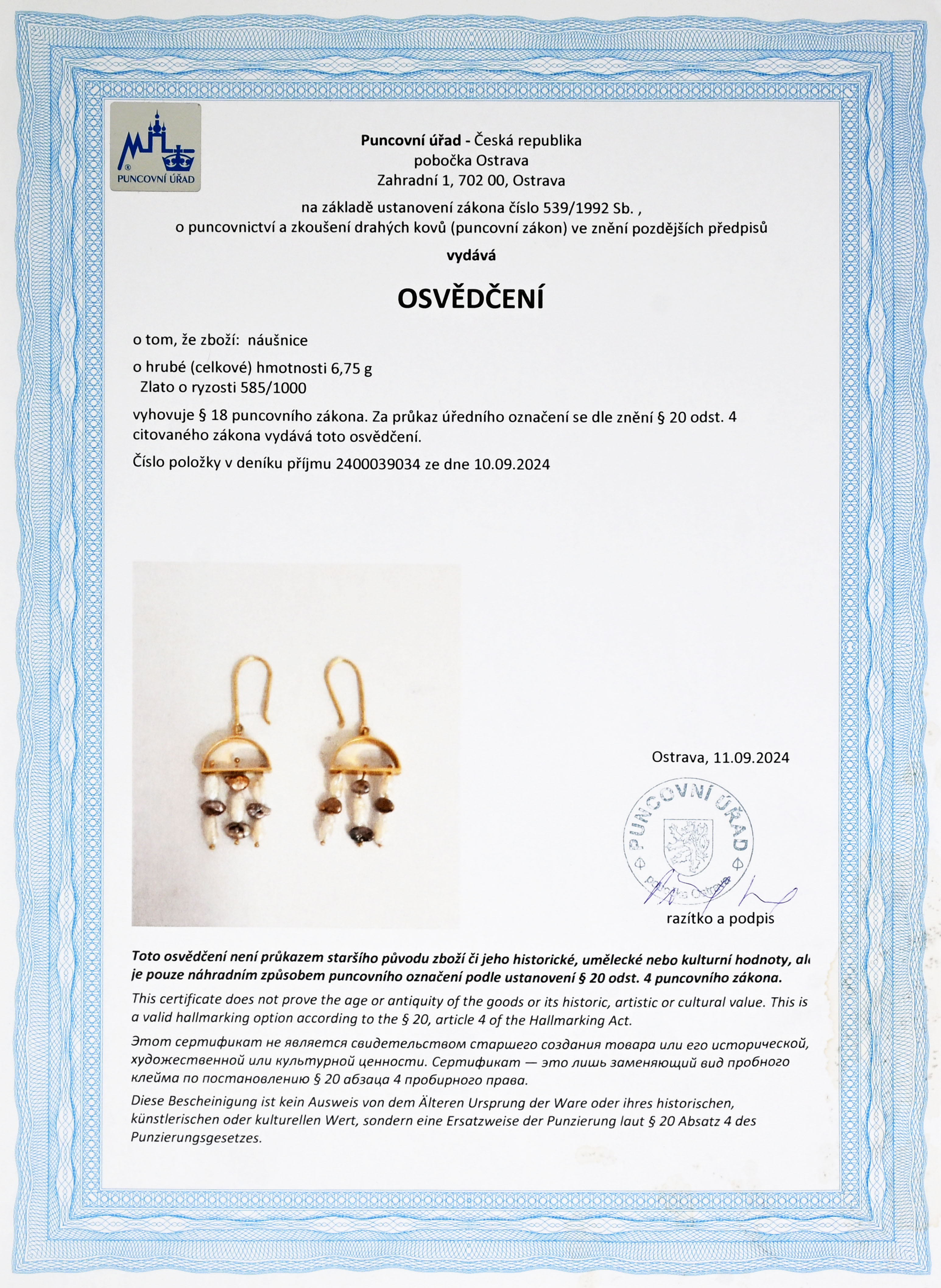 k náušnicím je přiloženo osvědčení vydané puncovním úřadem, které potvrzuje pravost a kvalitu materiálu