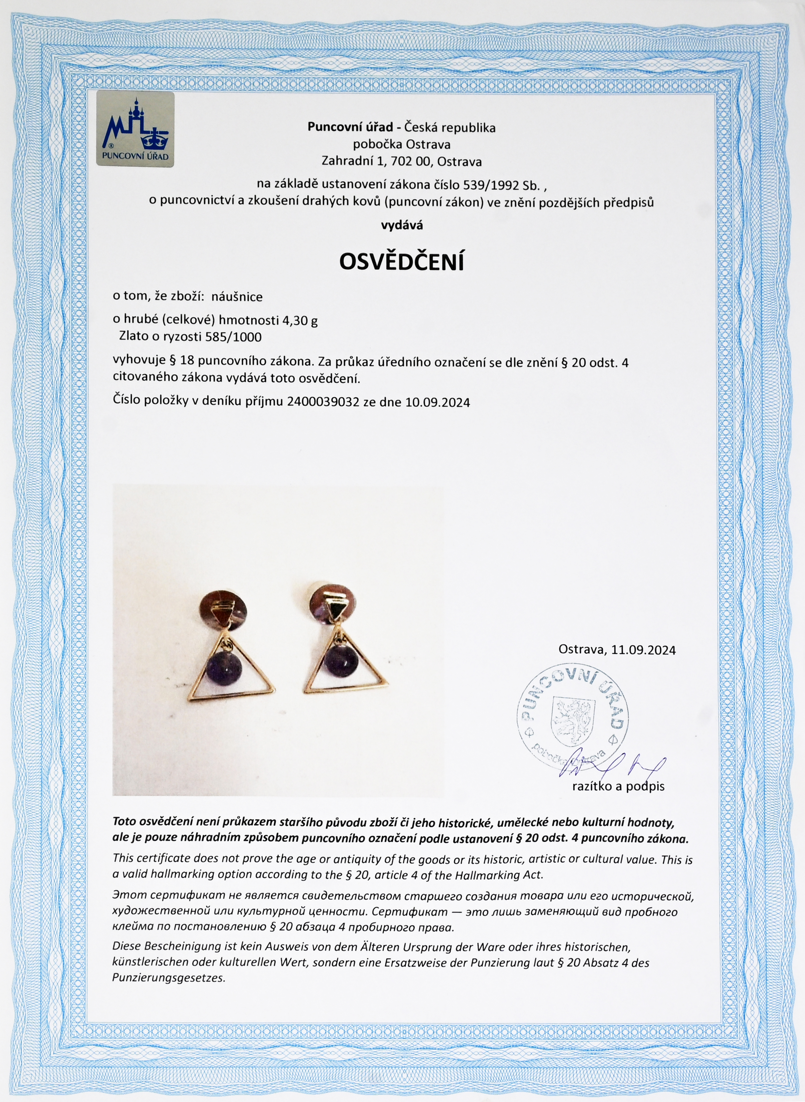 k náušnicím je přiloženo osvědčení vydané puncovním úřadem, které potvrzuje pravost a kvalitu materiálu