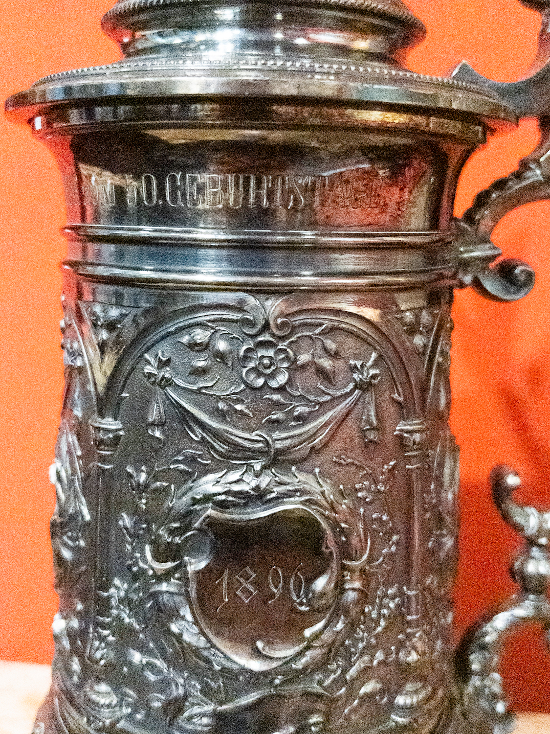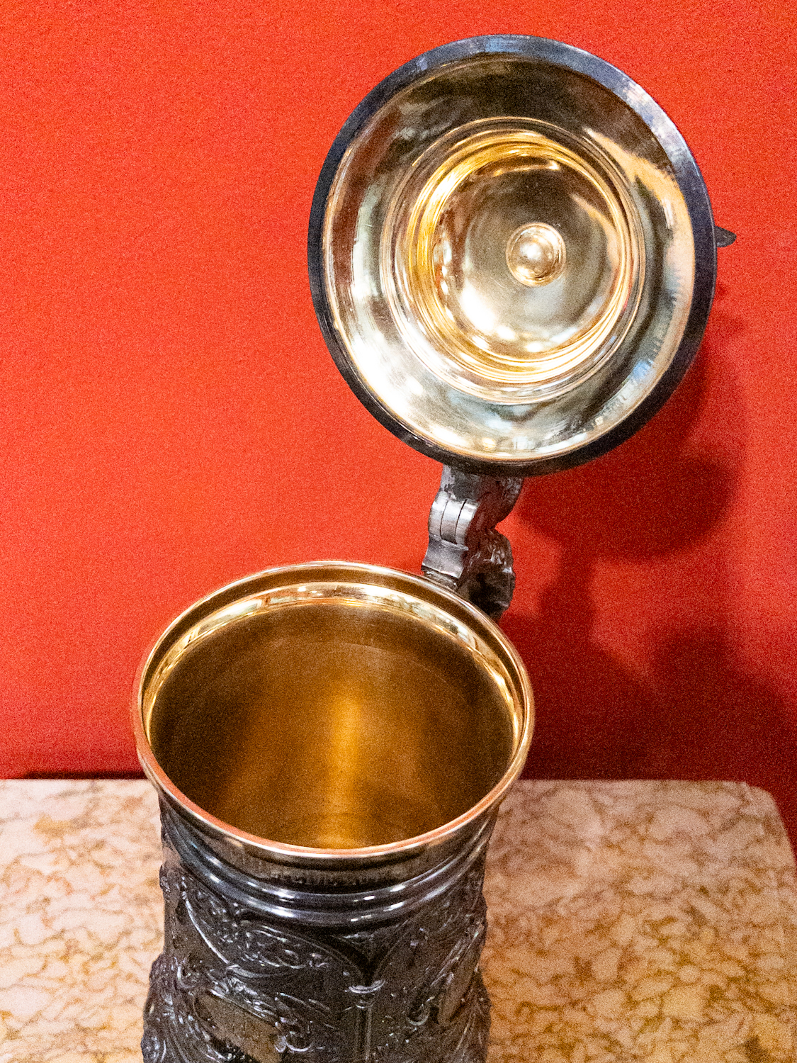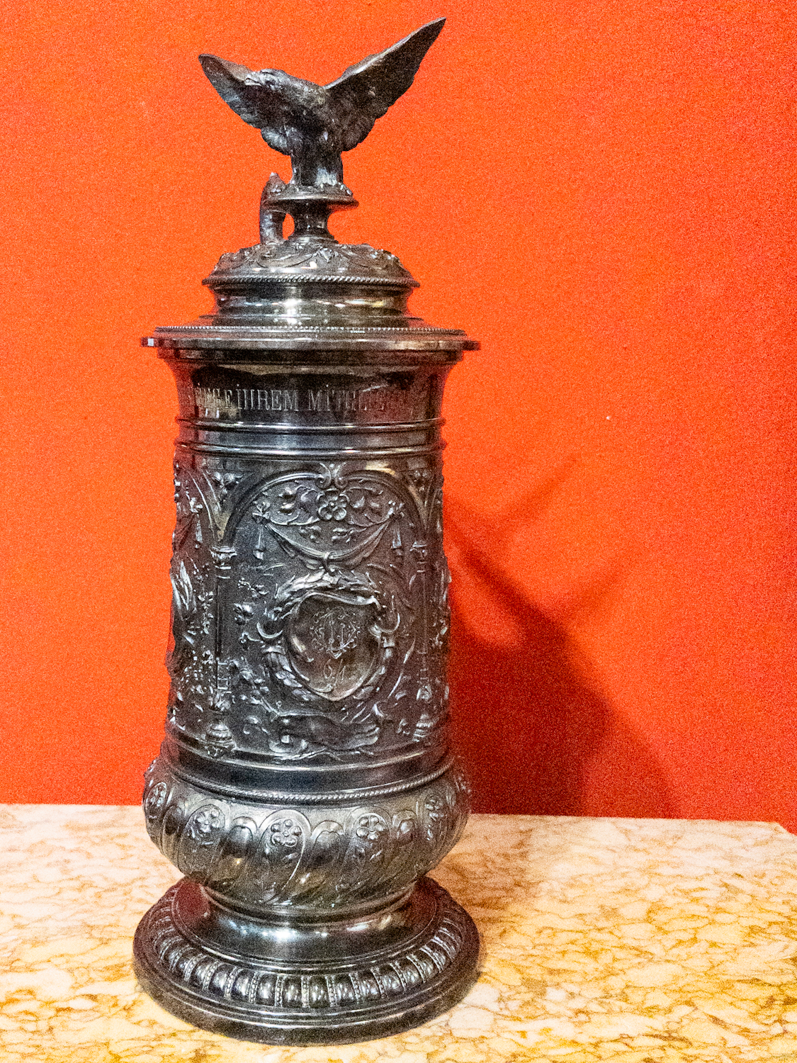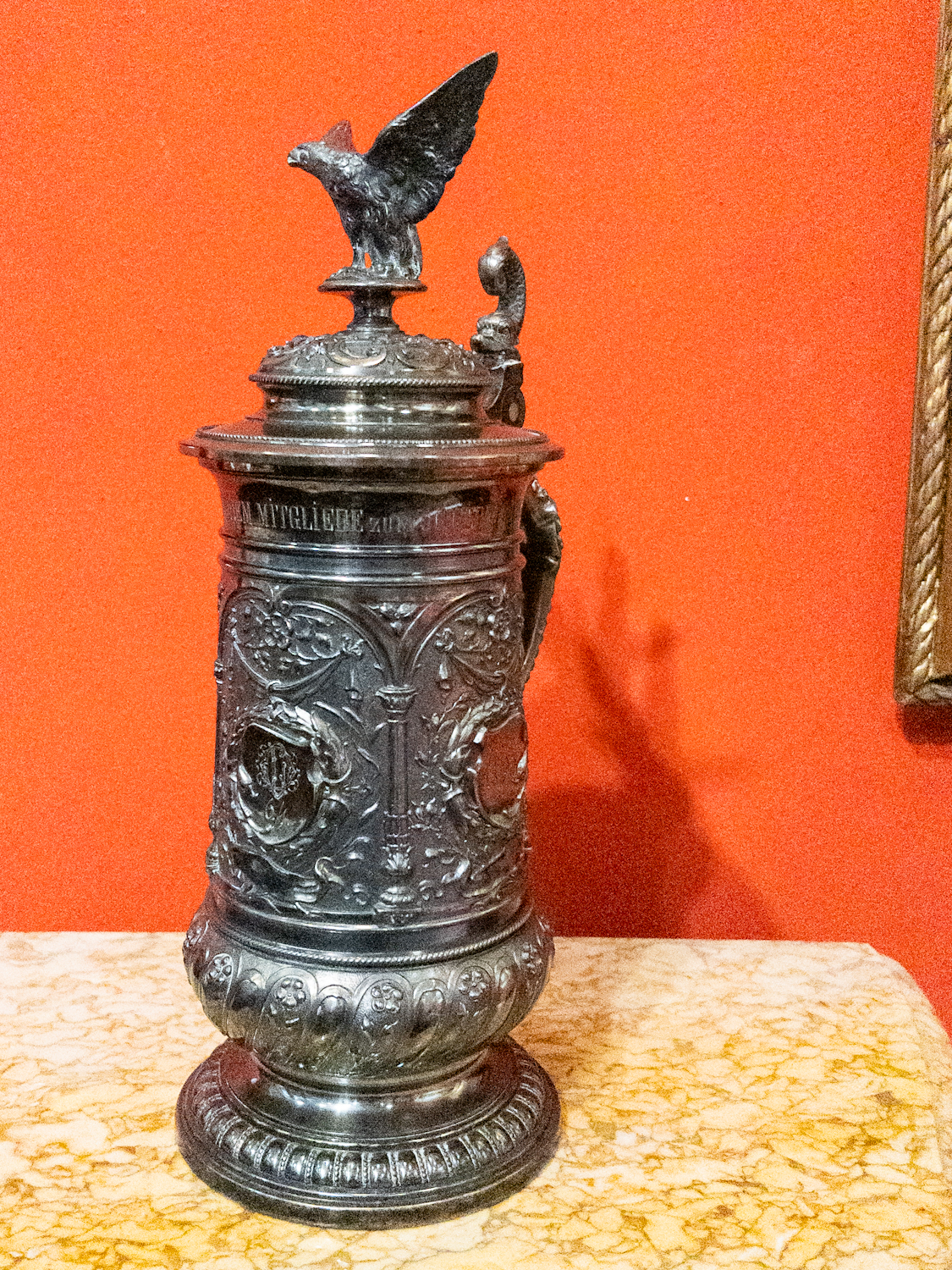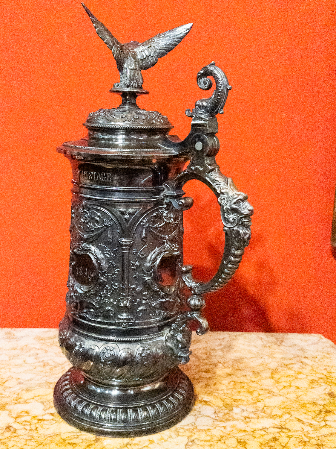 Velmi dekorativní , bohatě repoussovaný korbel s víkem a litou orlicí na vrcholu. Tělo s bohatým ornamentálním reliéfem a elegantní kartuší, uvnitř silně zlacená vložka, charakteristická pro stylové pivní nádobí té doby.