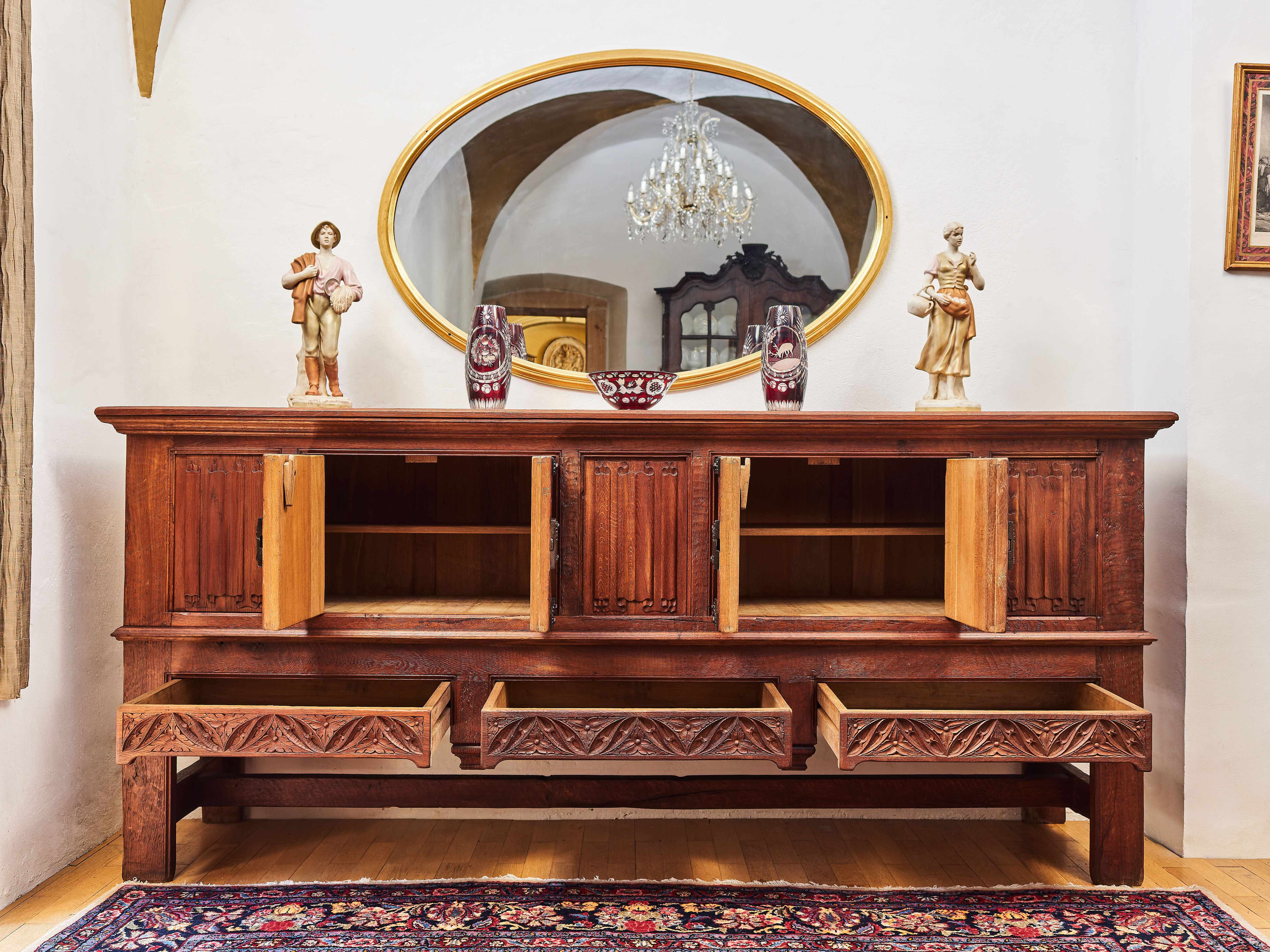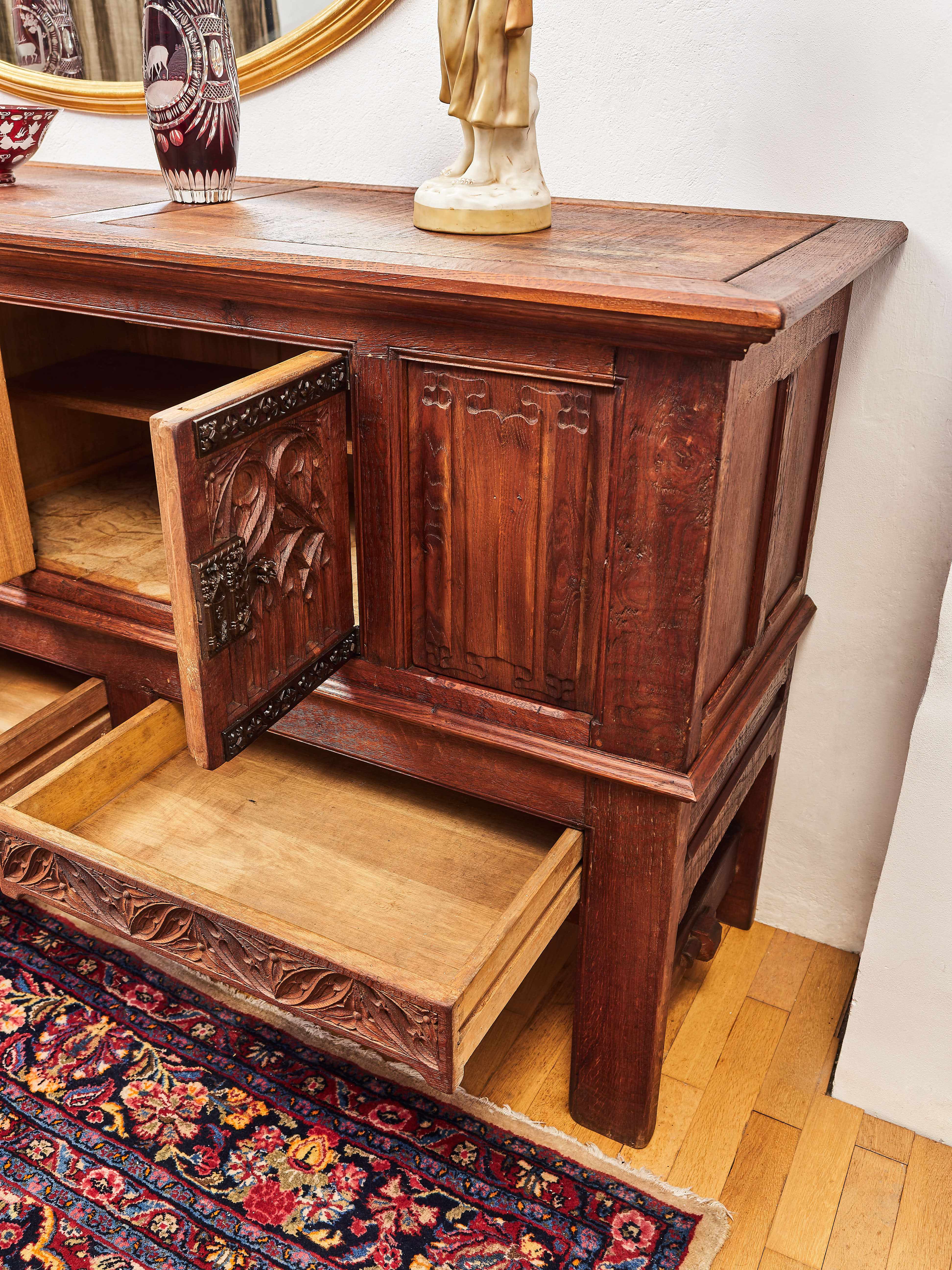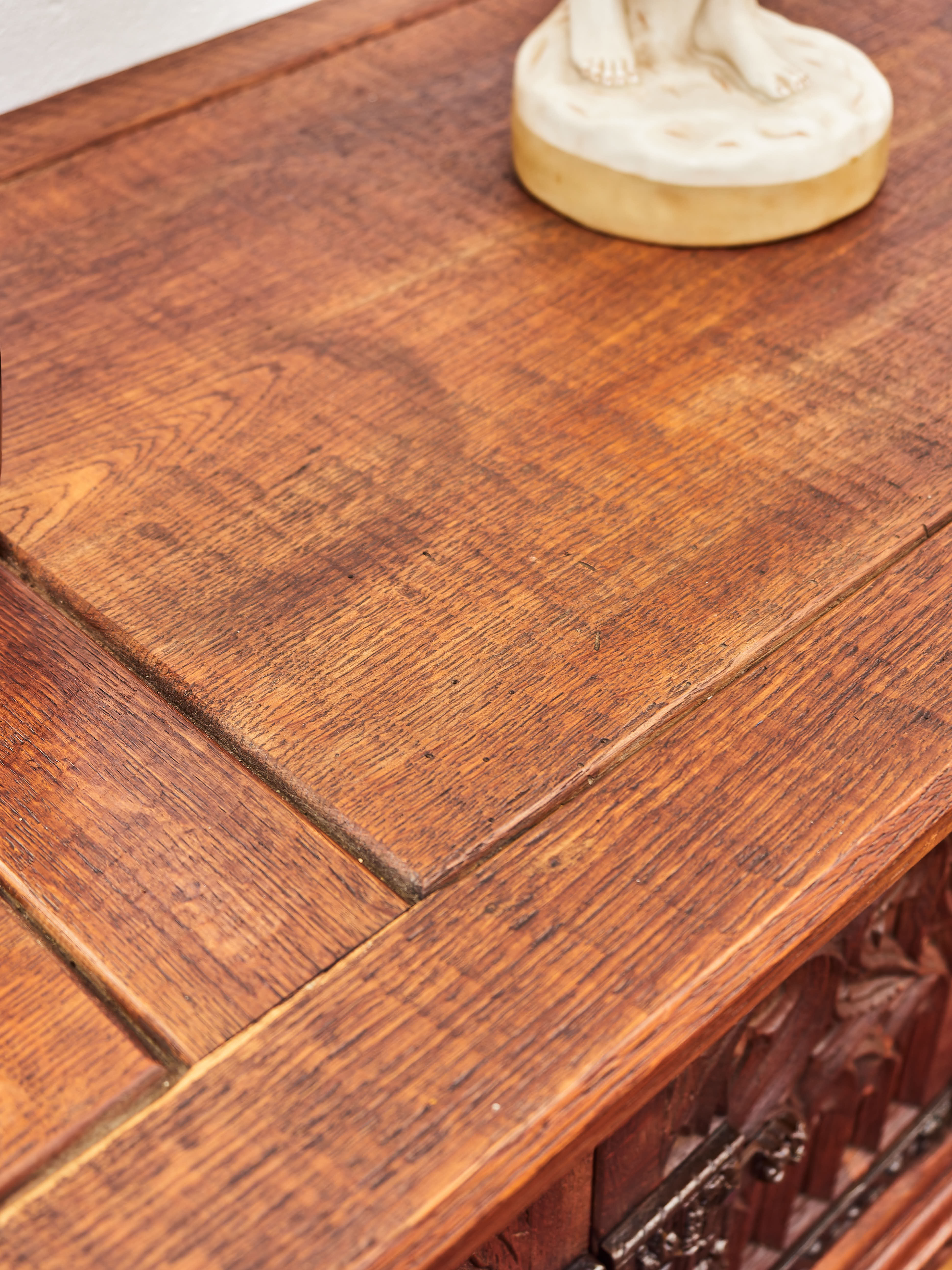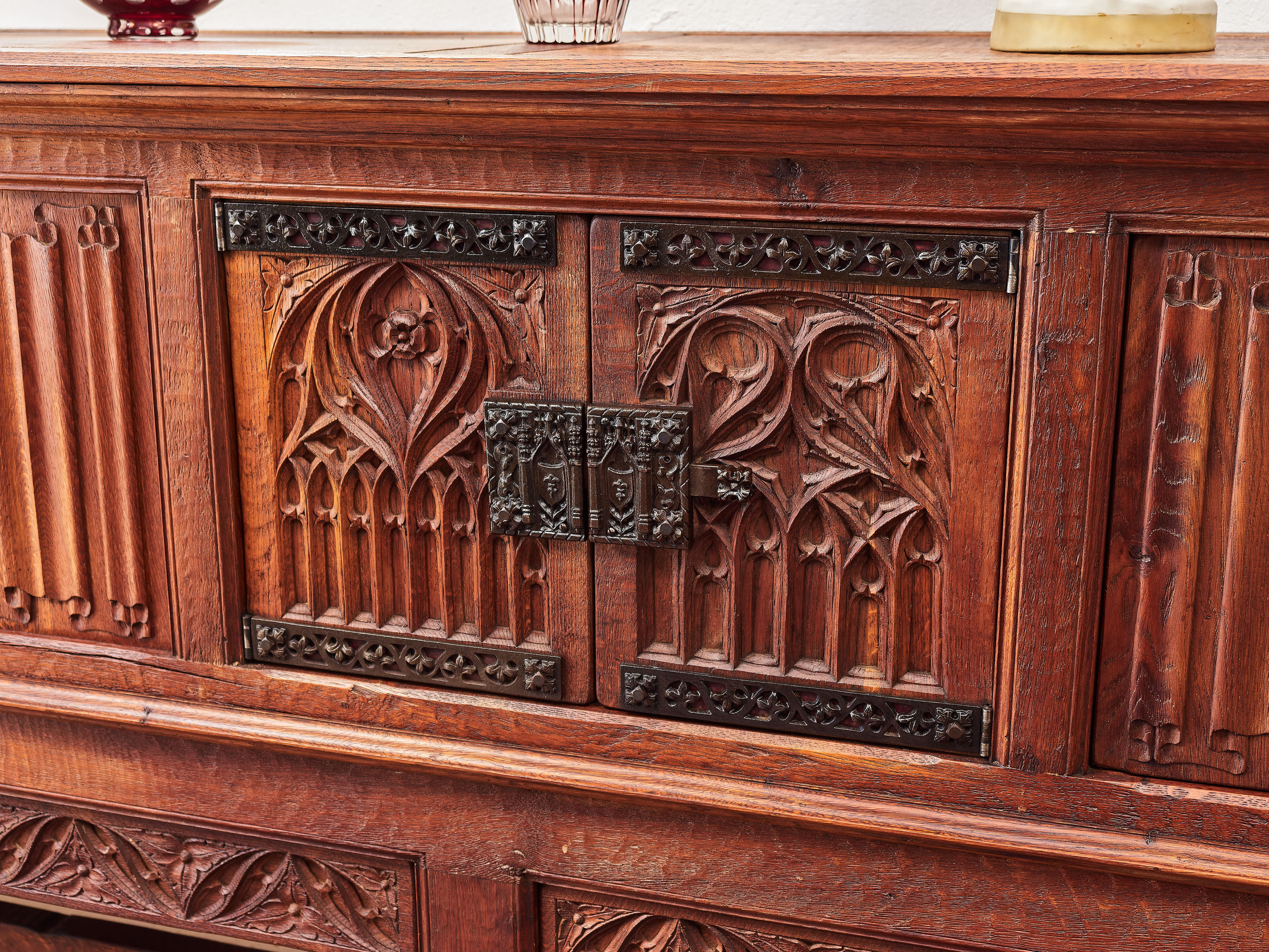 Čelní strana komody je zdobena bohatou řezbou s motivy gotických oblouků a rostlinných ornamentů, které připomínají architekturu středověkých katedrál. Masivní křídla dveří doplňuje dekorativní kování s reliéfními vzory a výrazným centrálním zámkem. Spodní část tvoří tři zásuvky s hlubokou řezbou listů a plodů, které dodávají celému kusu plastický výraz. Nohy komody jsou robustní, pevné a doplněné profilovaným rámem se subtilním dekorem. Horní deska z dubových prken nese přirozenou kresbu dřeva a krásnou patinu, která podtrhuje stáří a charakter nábytku.