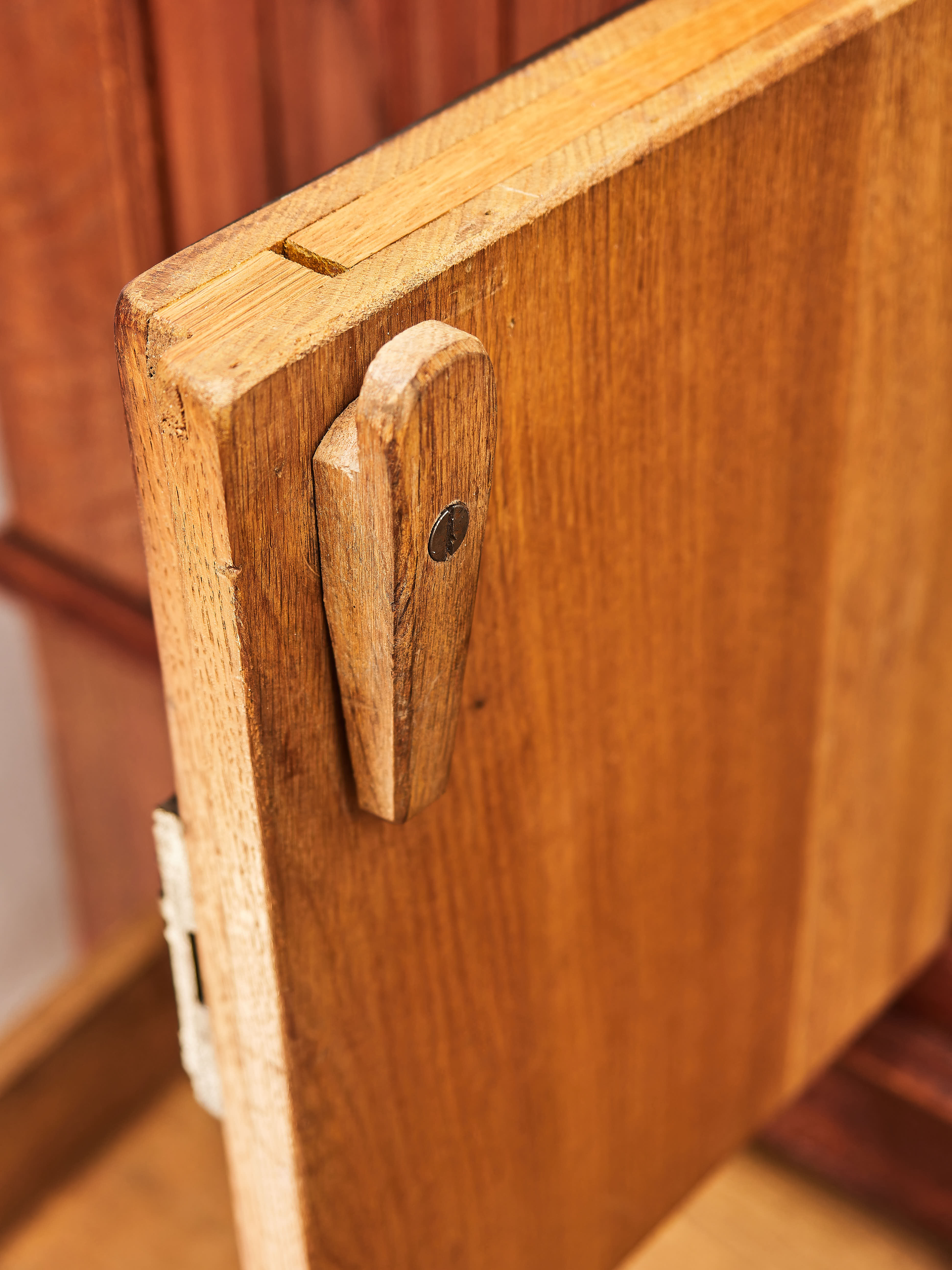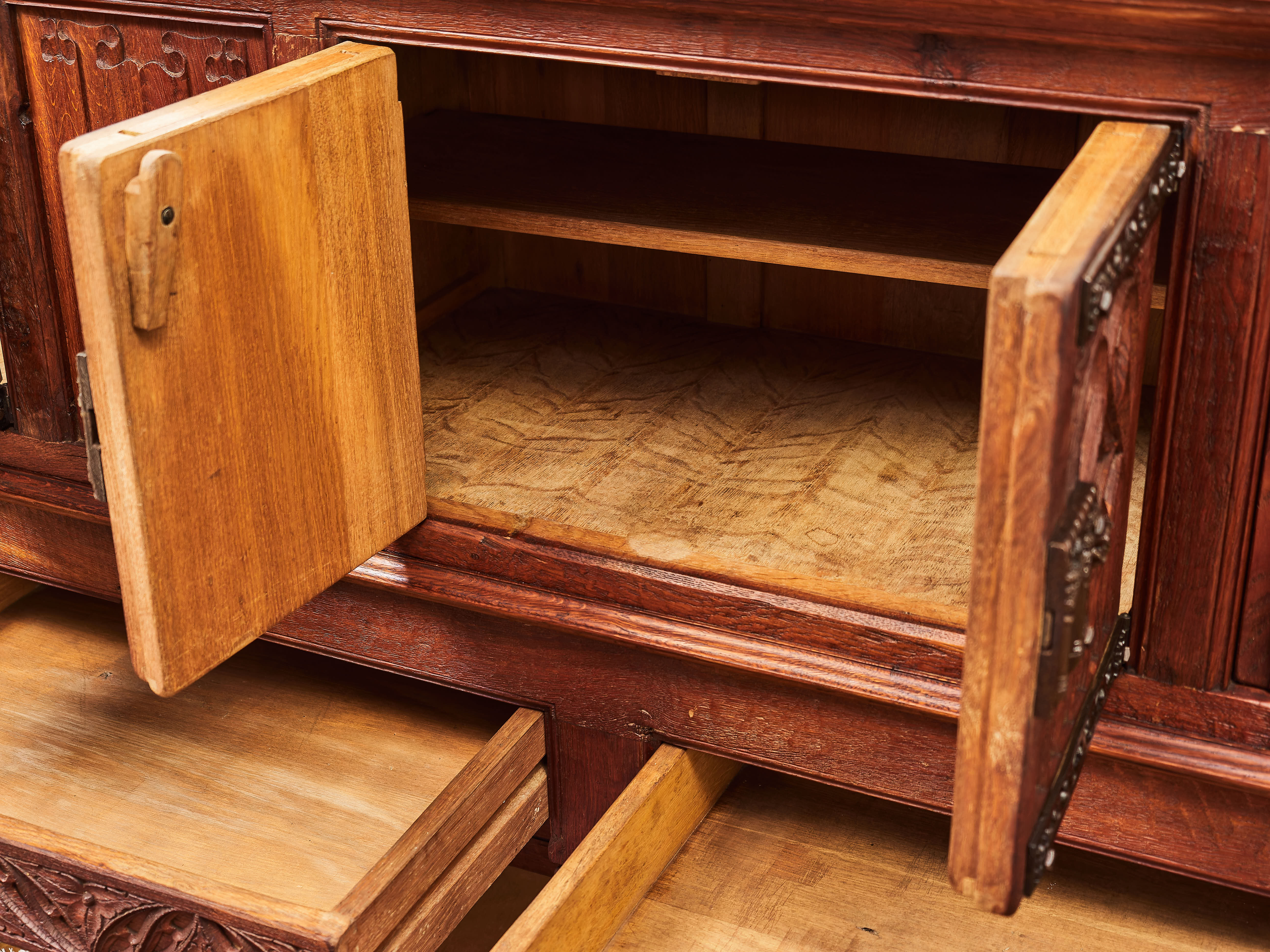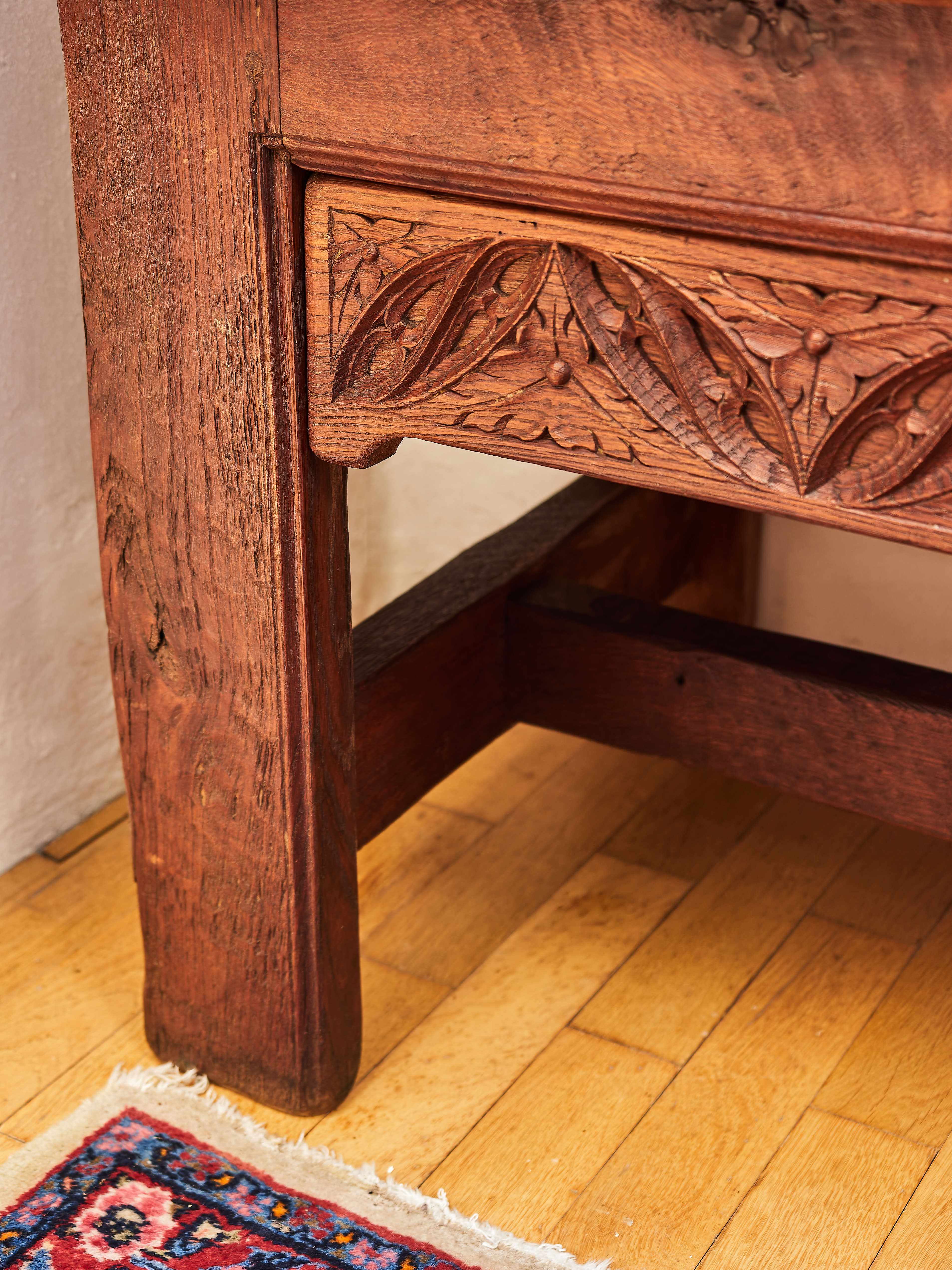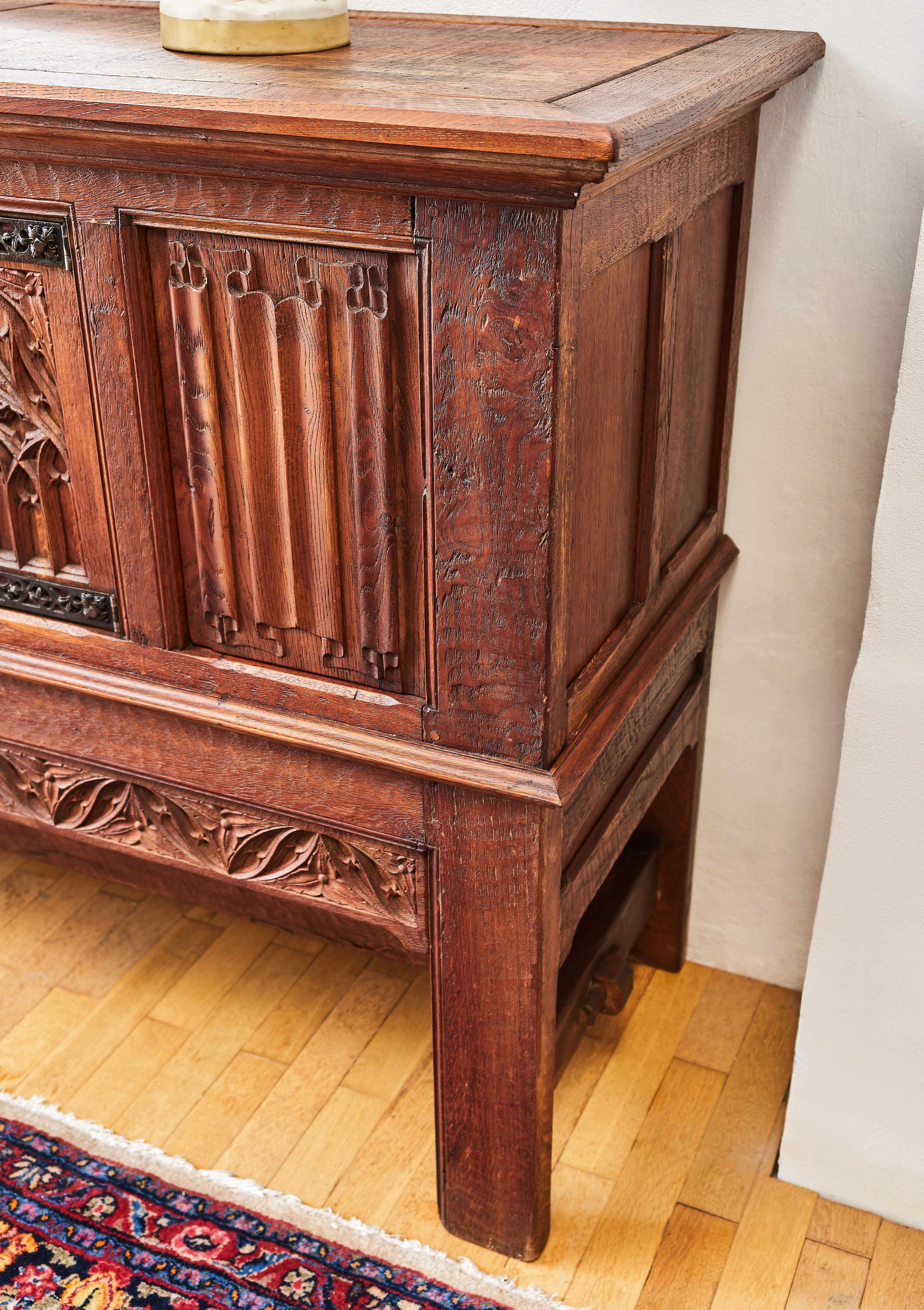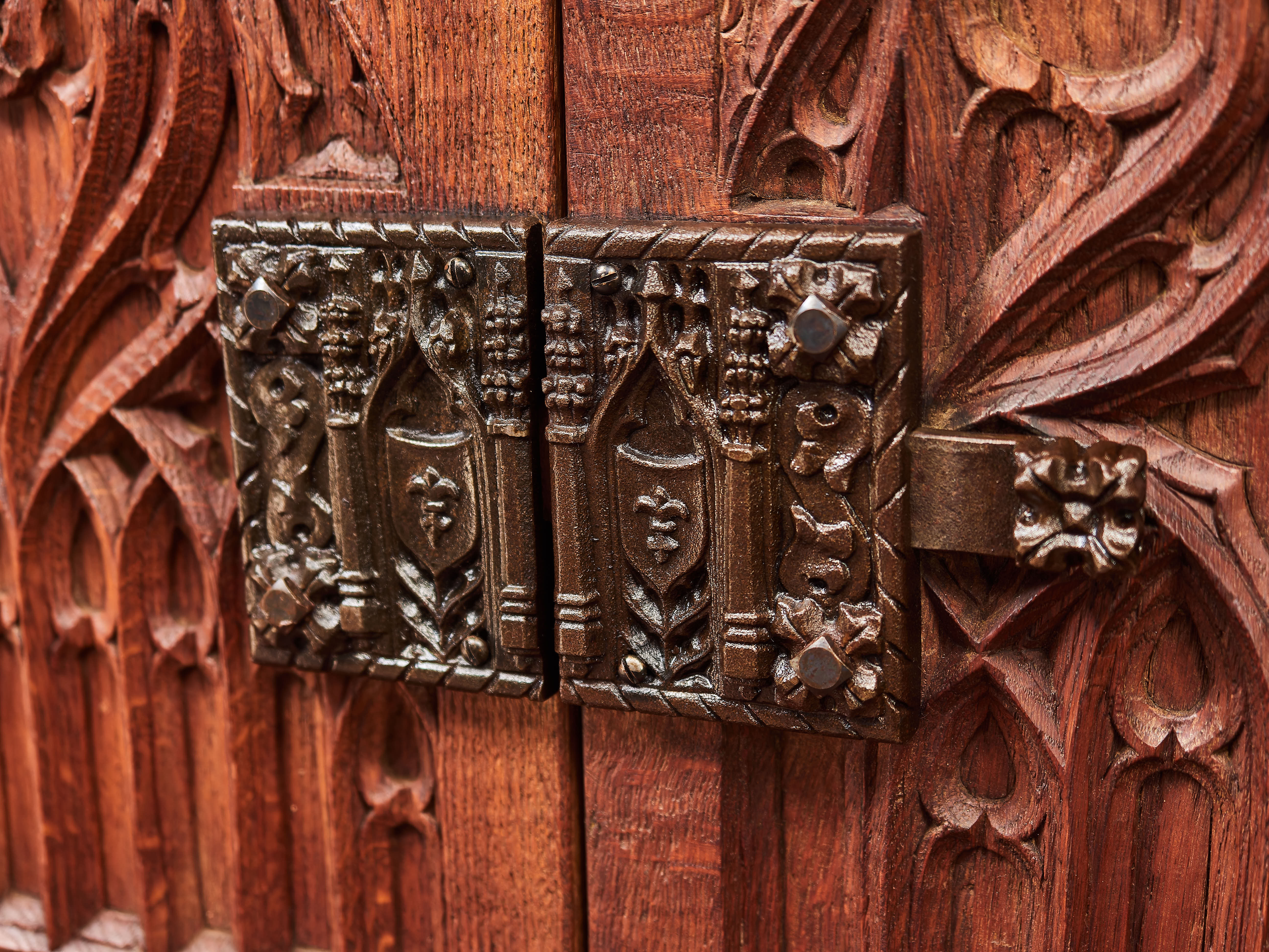 Čelní strana komody je zdobena bohatou řezbou s motivy gotických oblouků a rostlinných ornamentů, které připomínají architekturu středověkých katedrál. Masivní křídla dveří doplňuje dekorativní kování s reliéfními vzory a výrazným centrálním zámkem. Spodní část tvoří tři zásuvky s hlubokou řezbou listů a plodů, které dodávají celému kusu plastický výraz. Nohy komody jsou robustní, pevné a doplněné profilovaným rámem se subtilním dekorem. Horní deska z dubových prken nese přirozenou kresbu dřeva a krásnou patinu, která podtrhuje stáří a charakter nábytku.