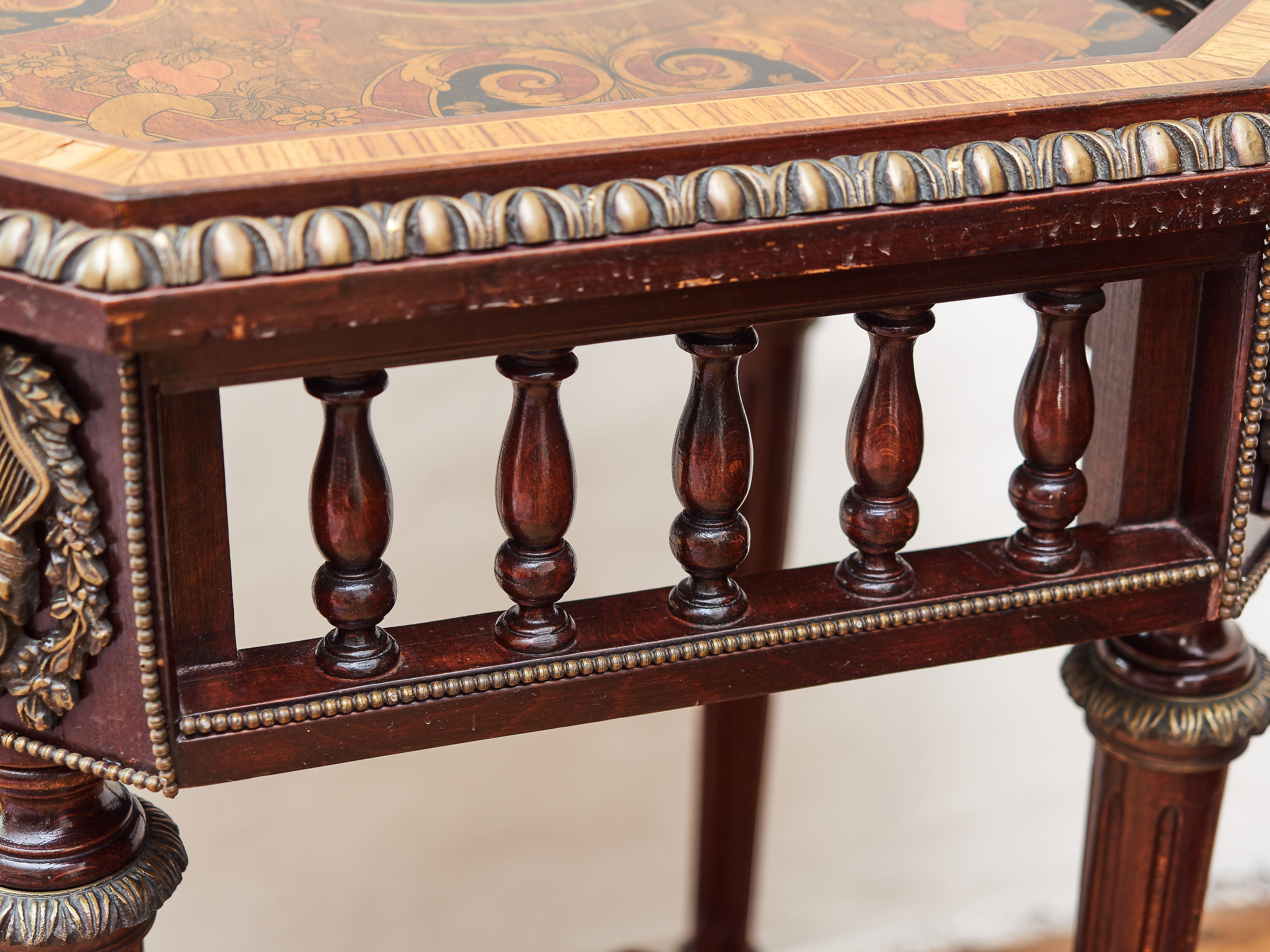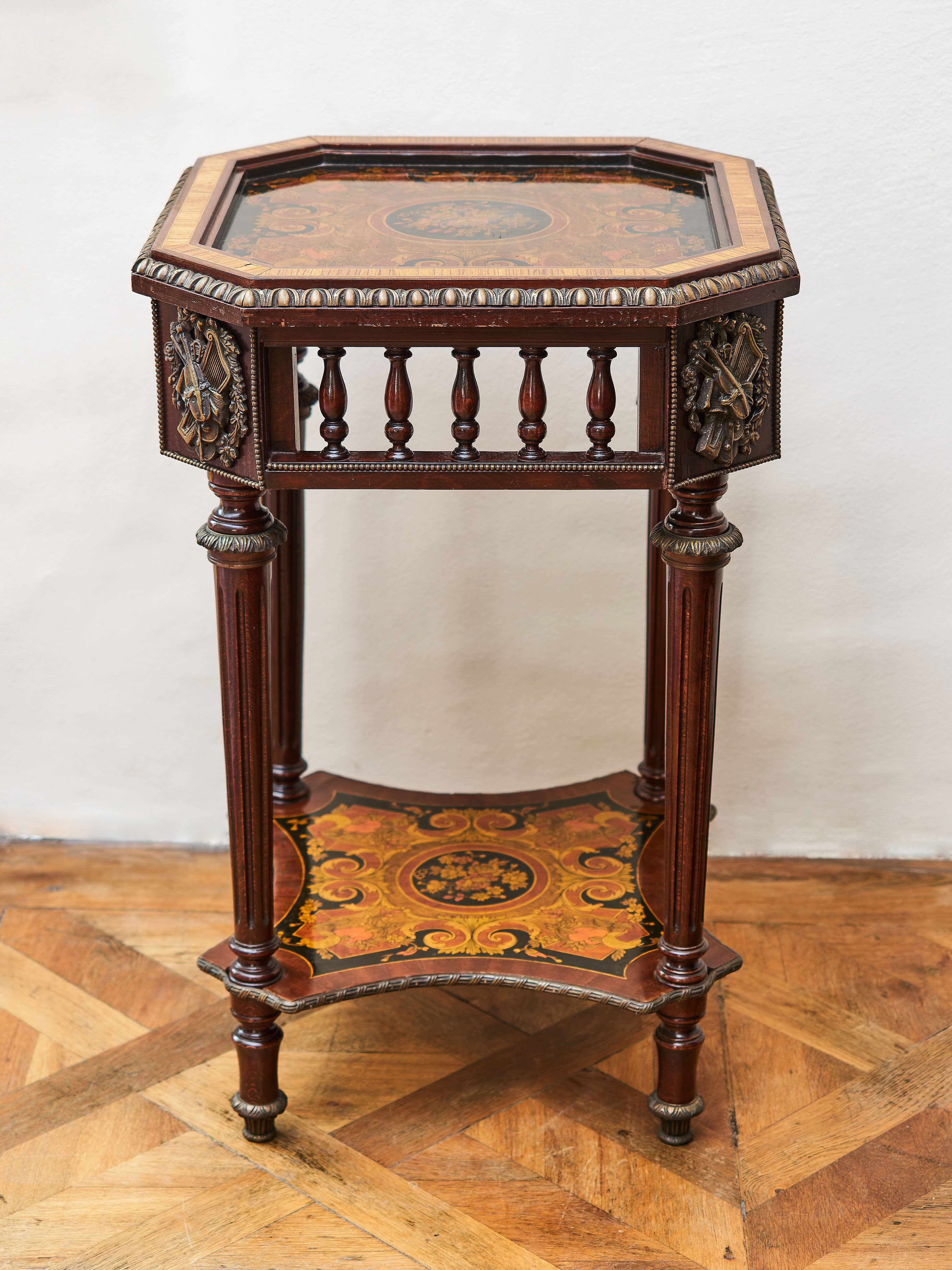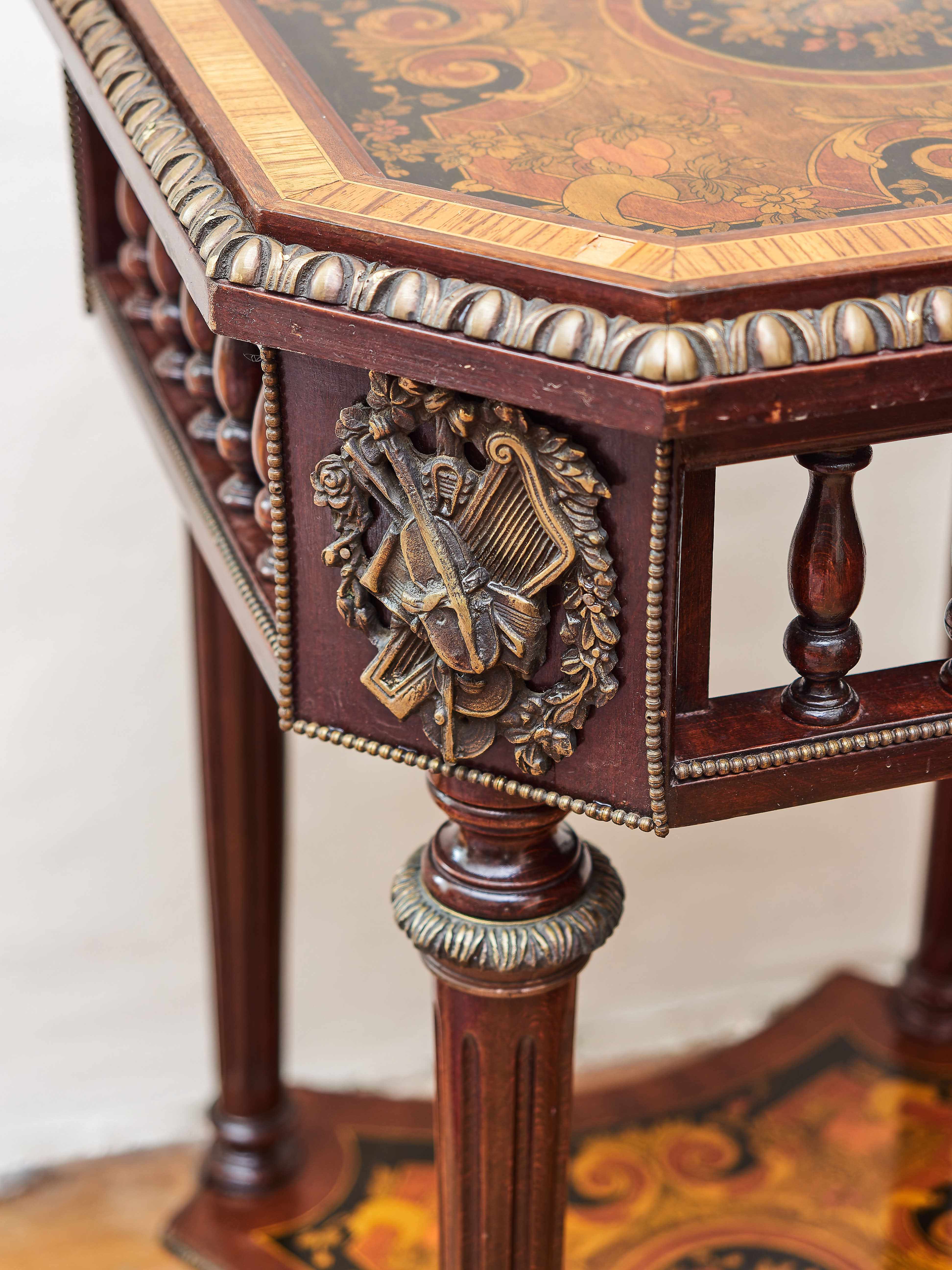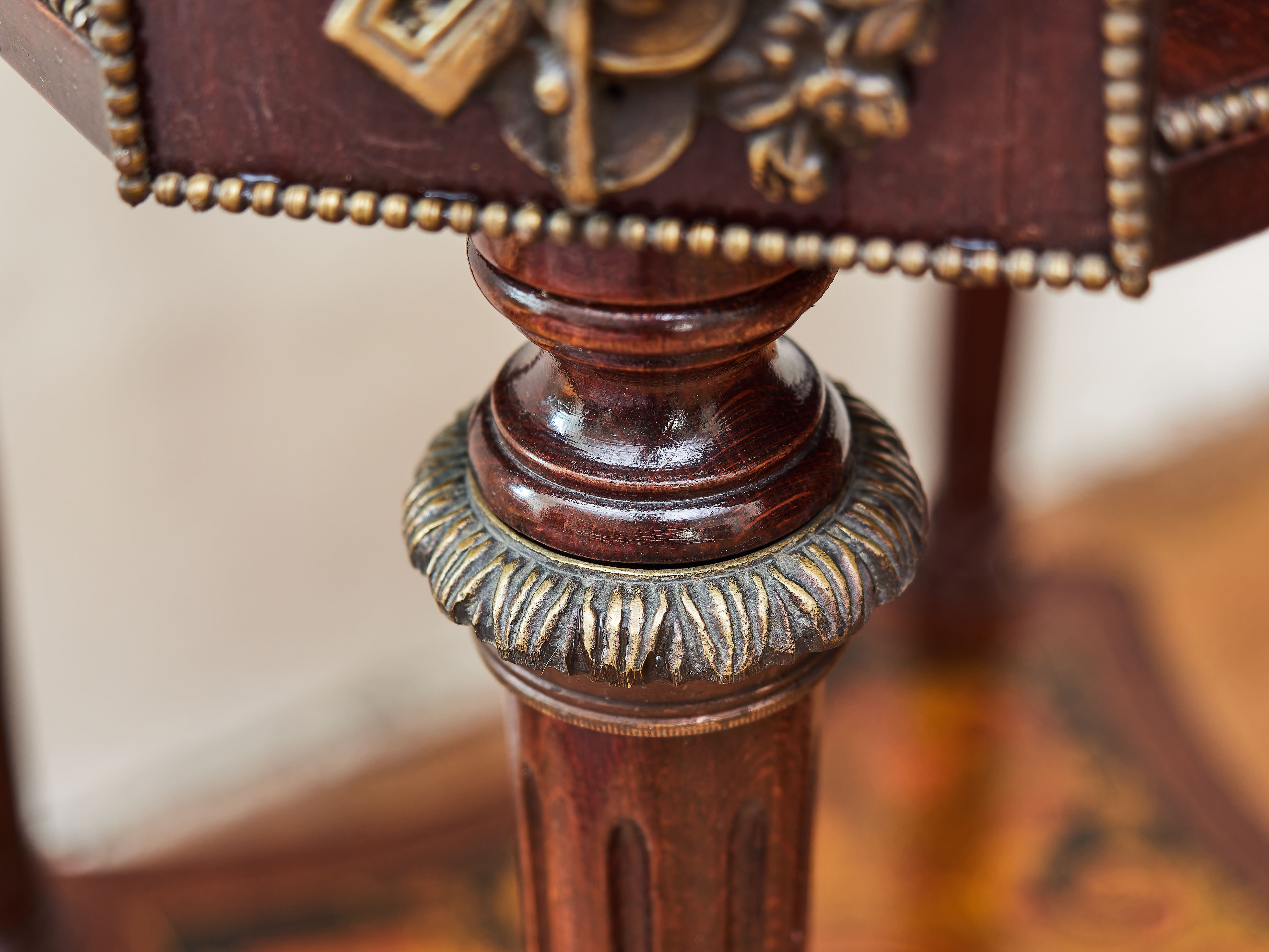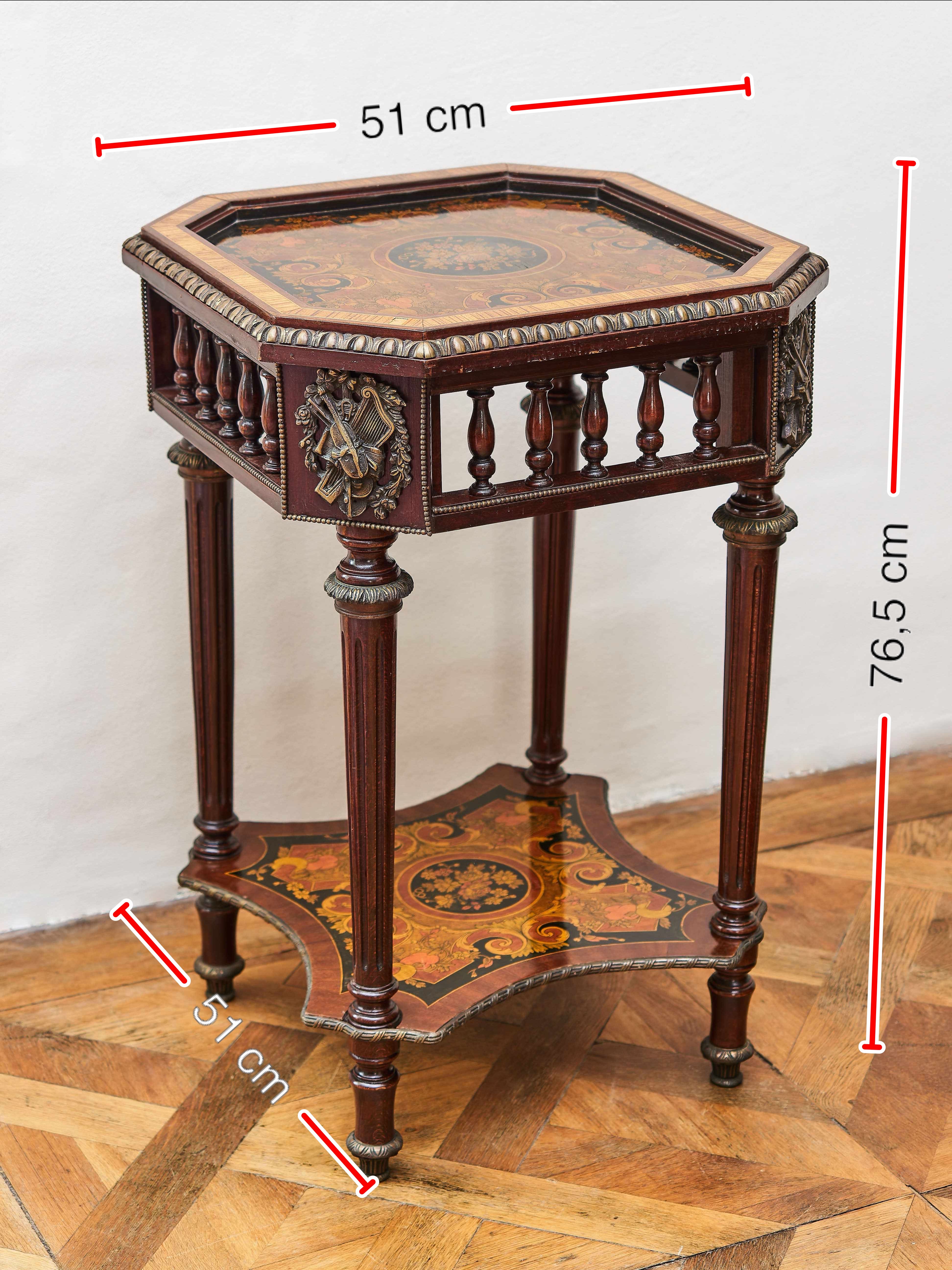 Vysoký odkládací stolek v klasicistním stylu Ludvíka XVI zdobený bohatou intarzií a bronzovými aplikacemi. Pod vrchní deskou jsou soustružení kuželky a nohy zušlechťuje kanelace. Bronzové aplikace na bocích nesou hudební motivy.