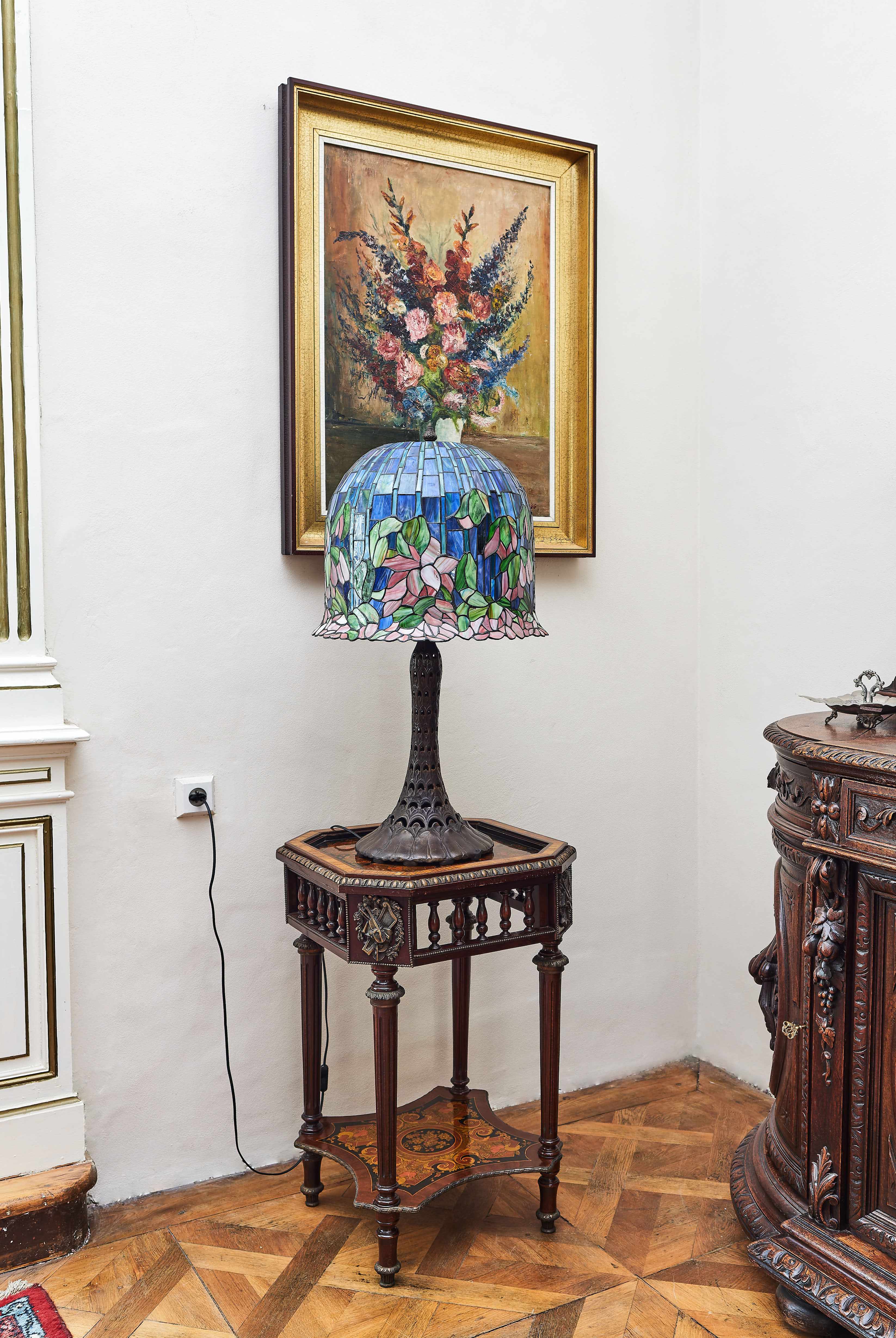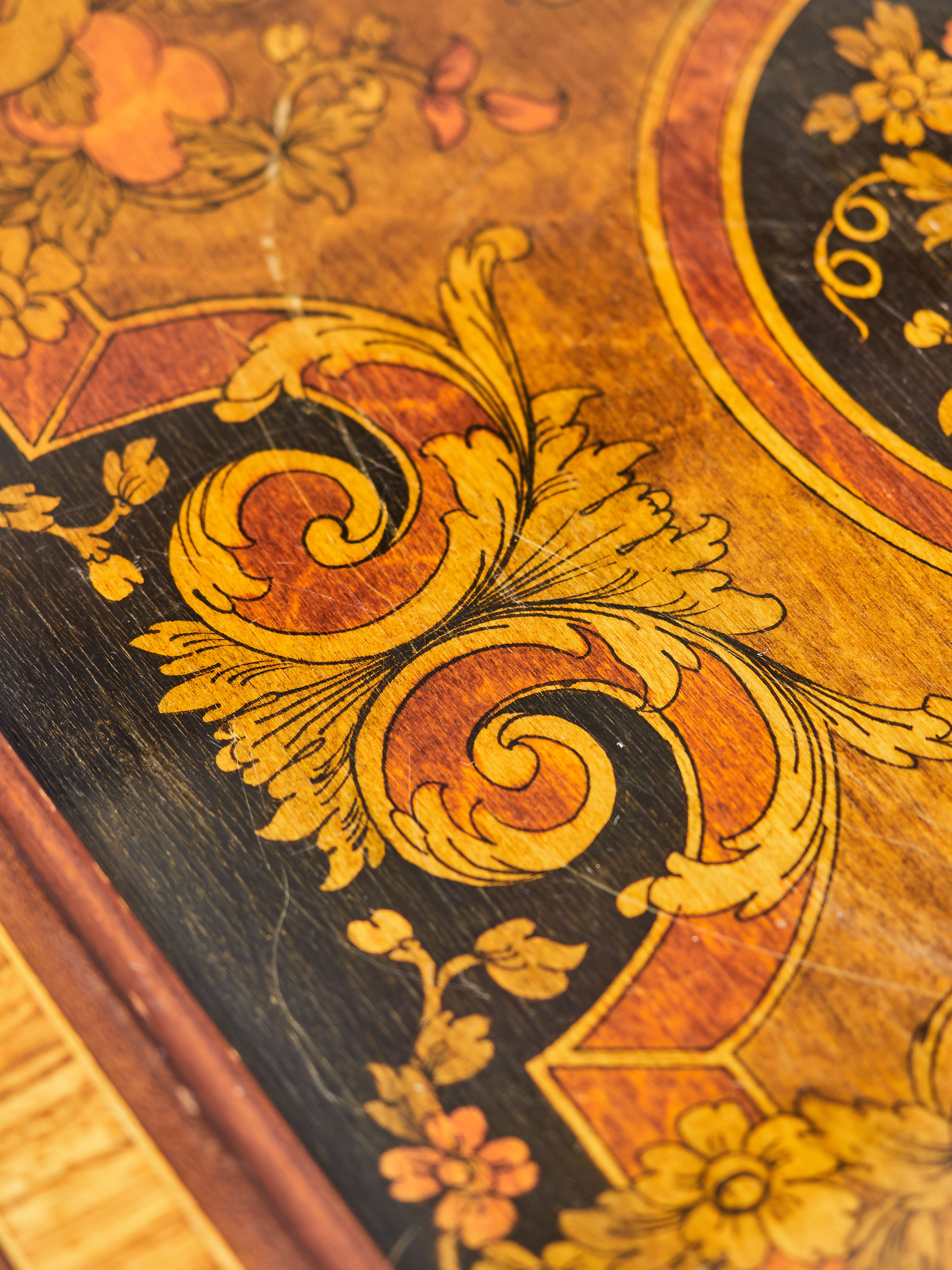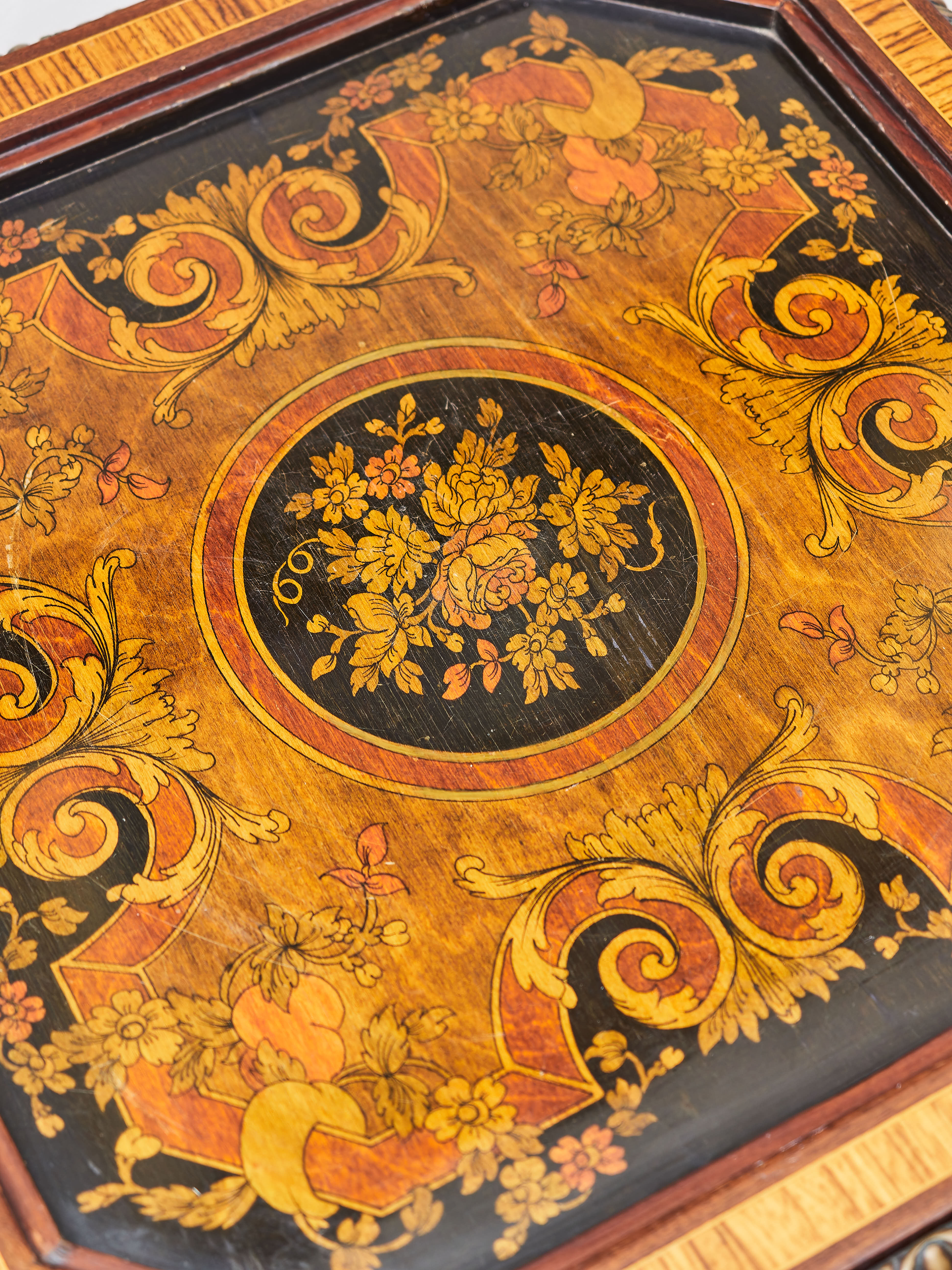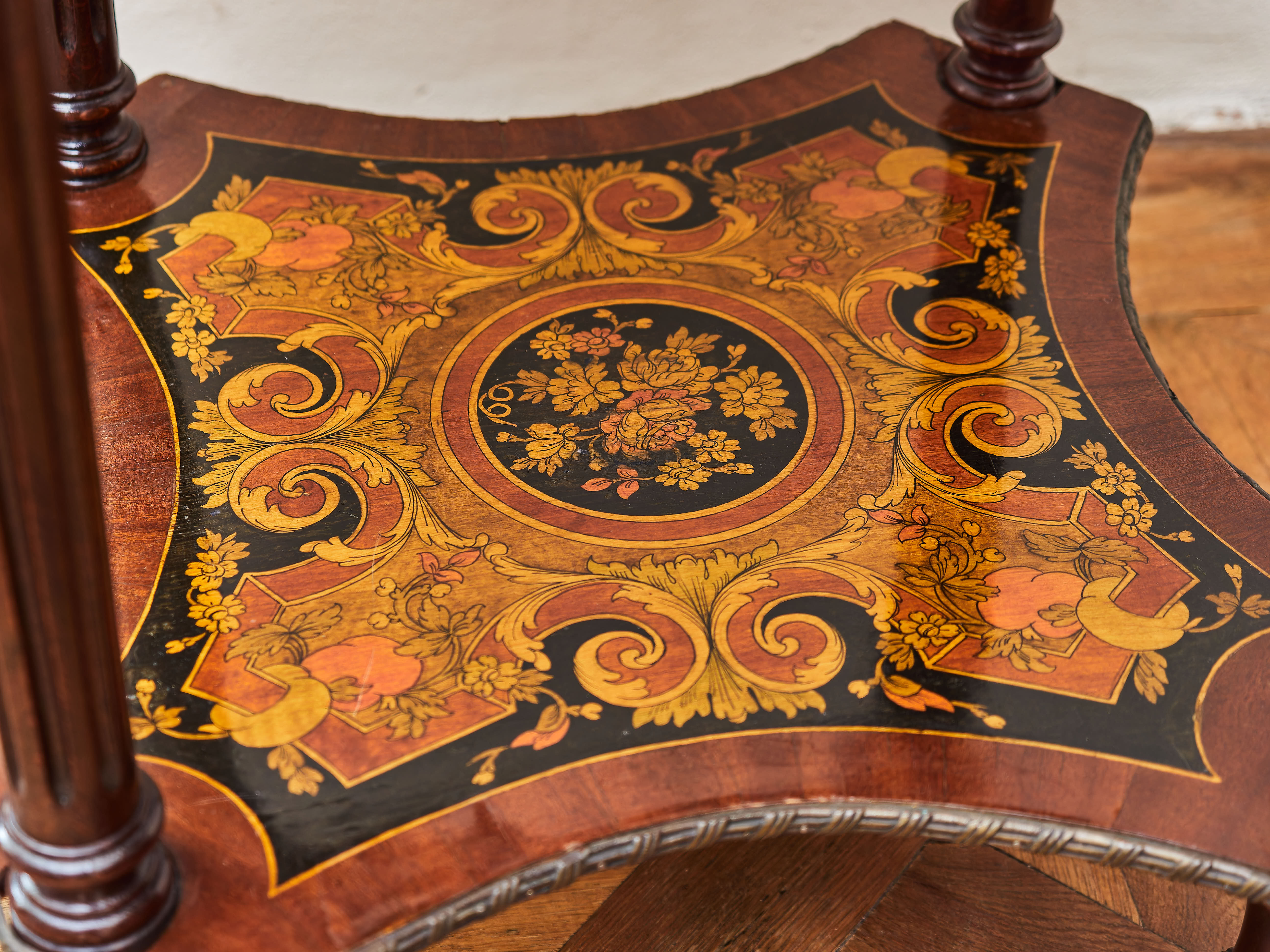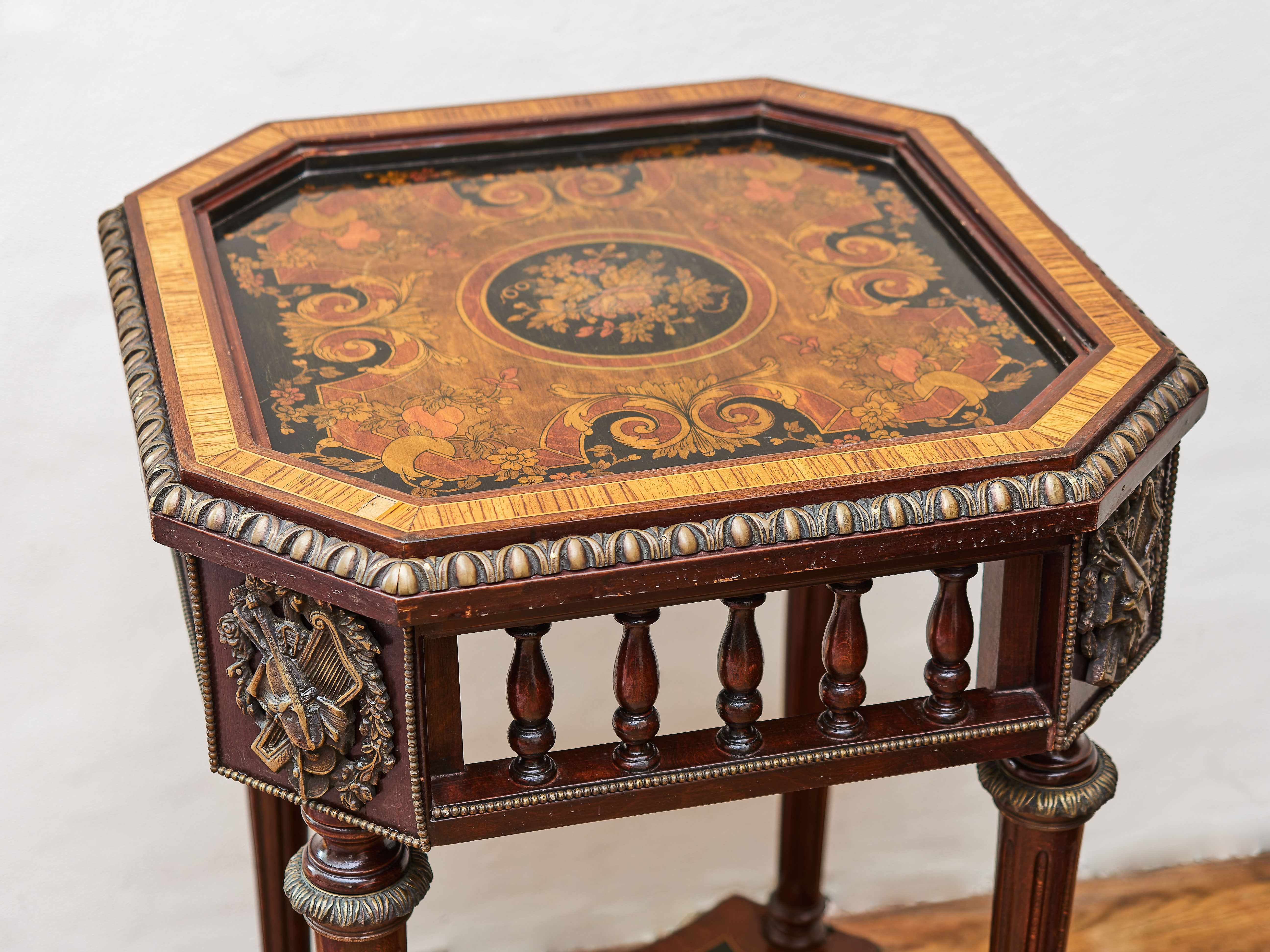 Vysoký odkládací stolek v klasicistním stylu Ludvíka XVI zdobený bohatou intarzií a bronzovými aplikacemi. Pod vrchní deskou jsou soustružení kuželky a nohy zušlechťuje kanelace. Bronzové aplikace na bocích nesou hudební motivy.