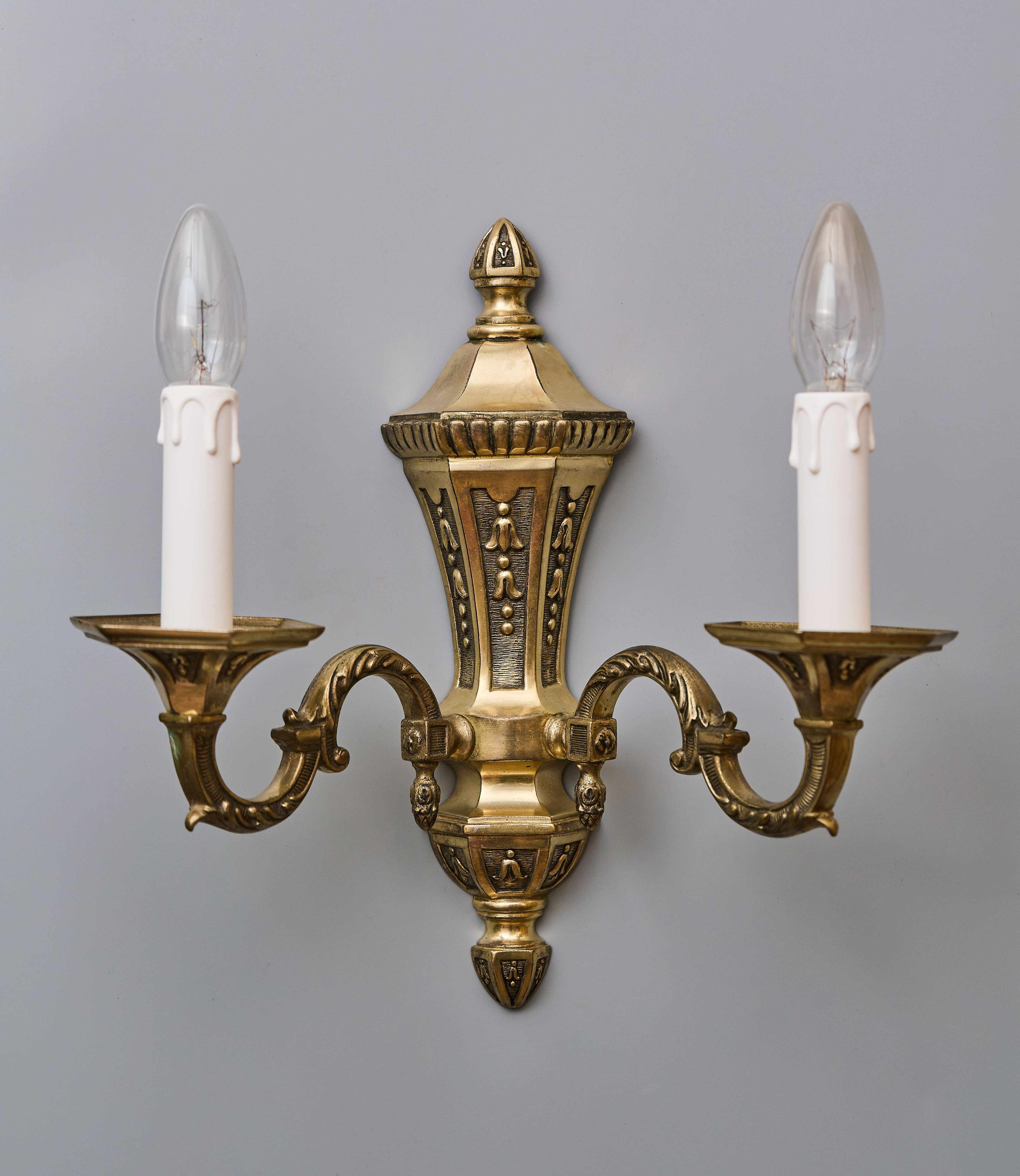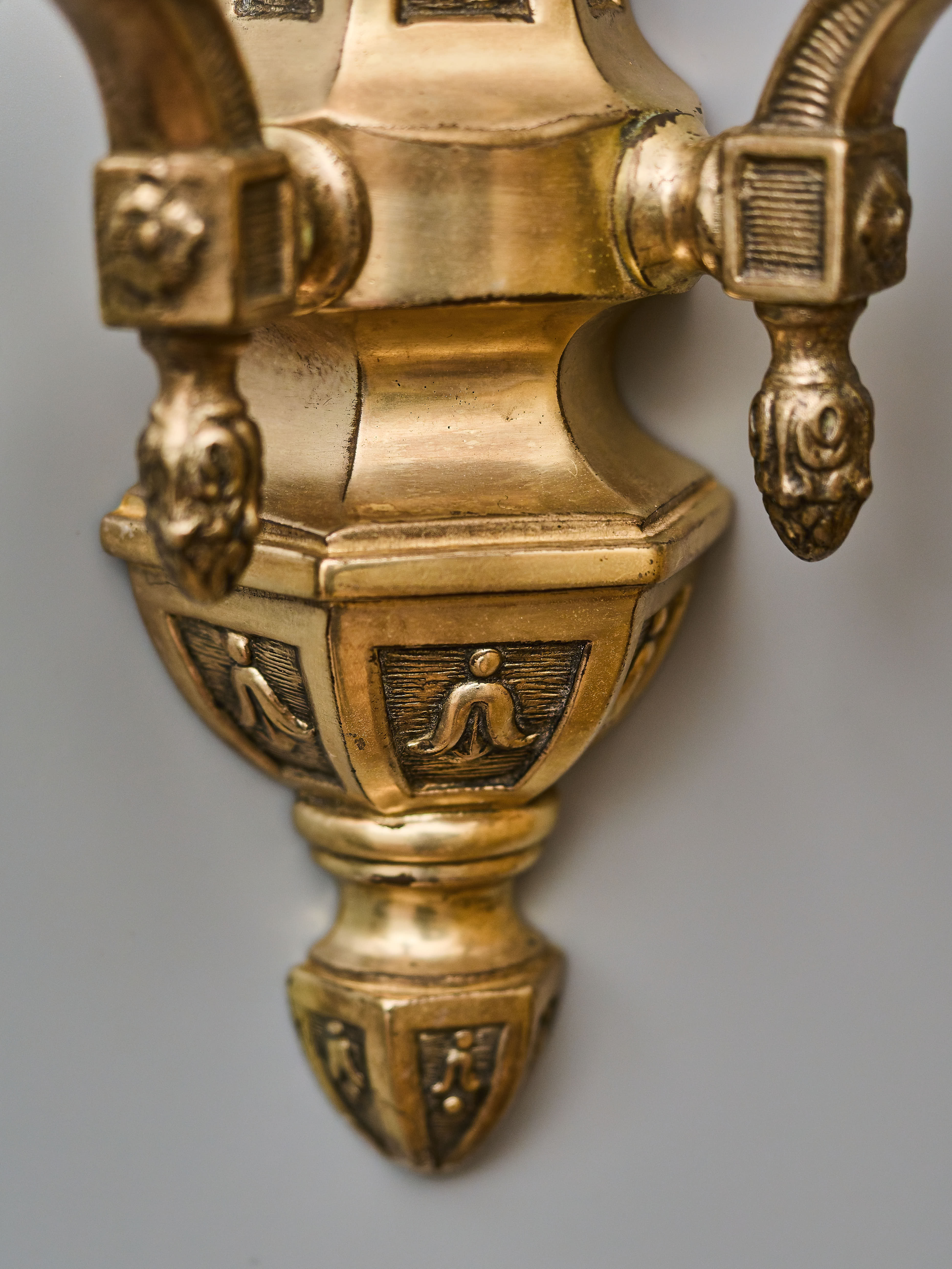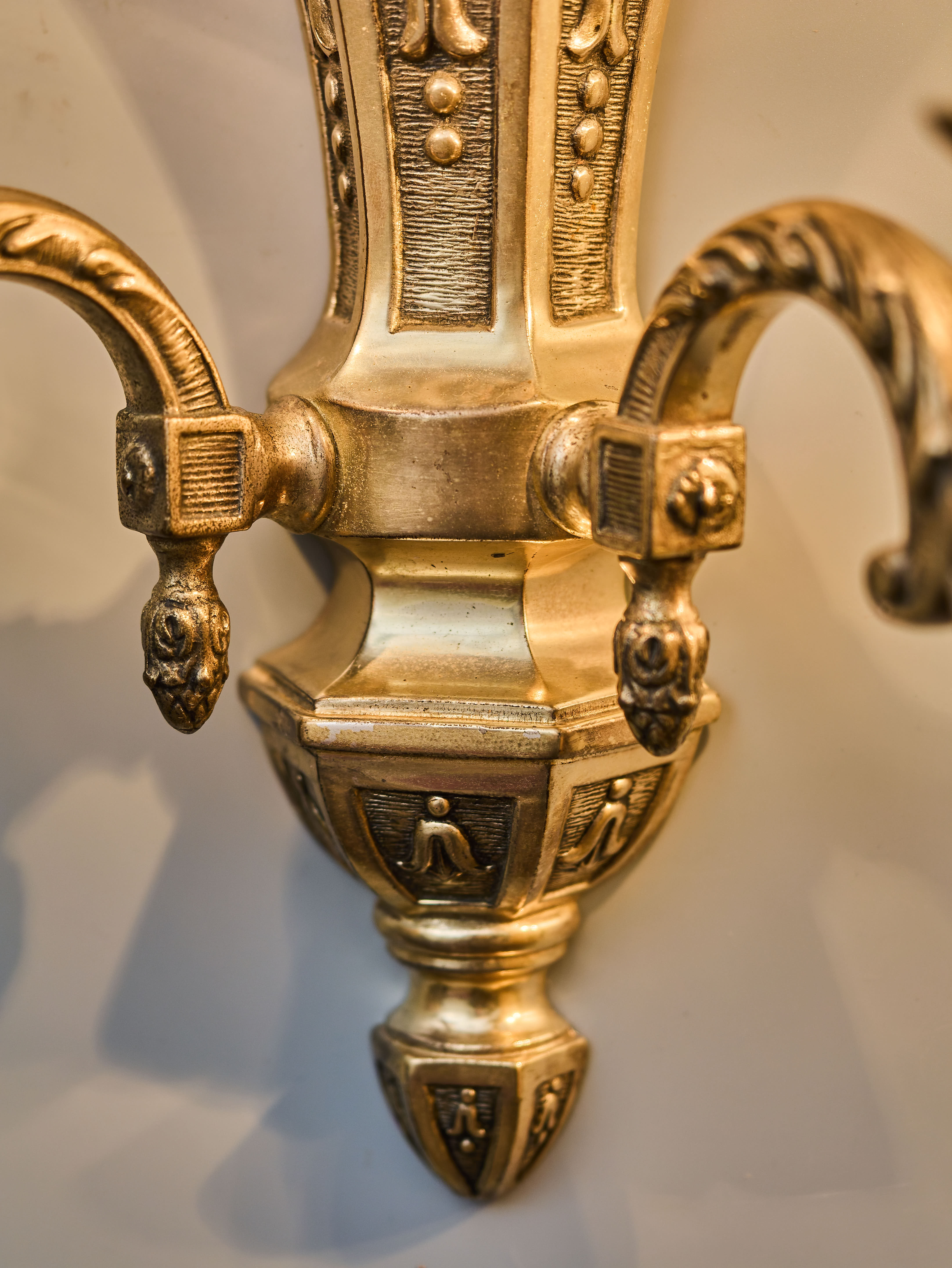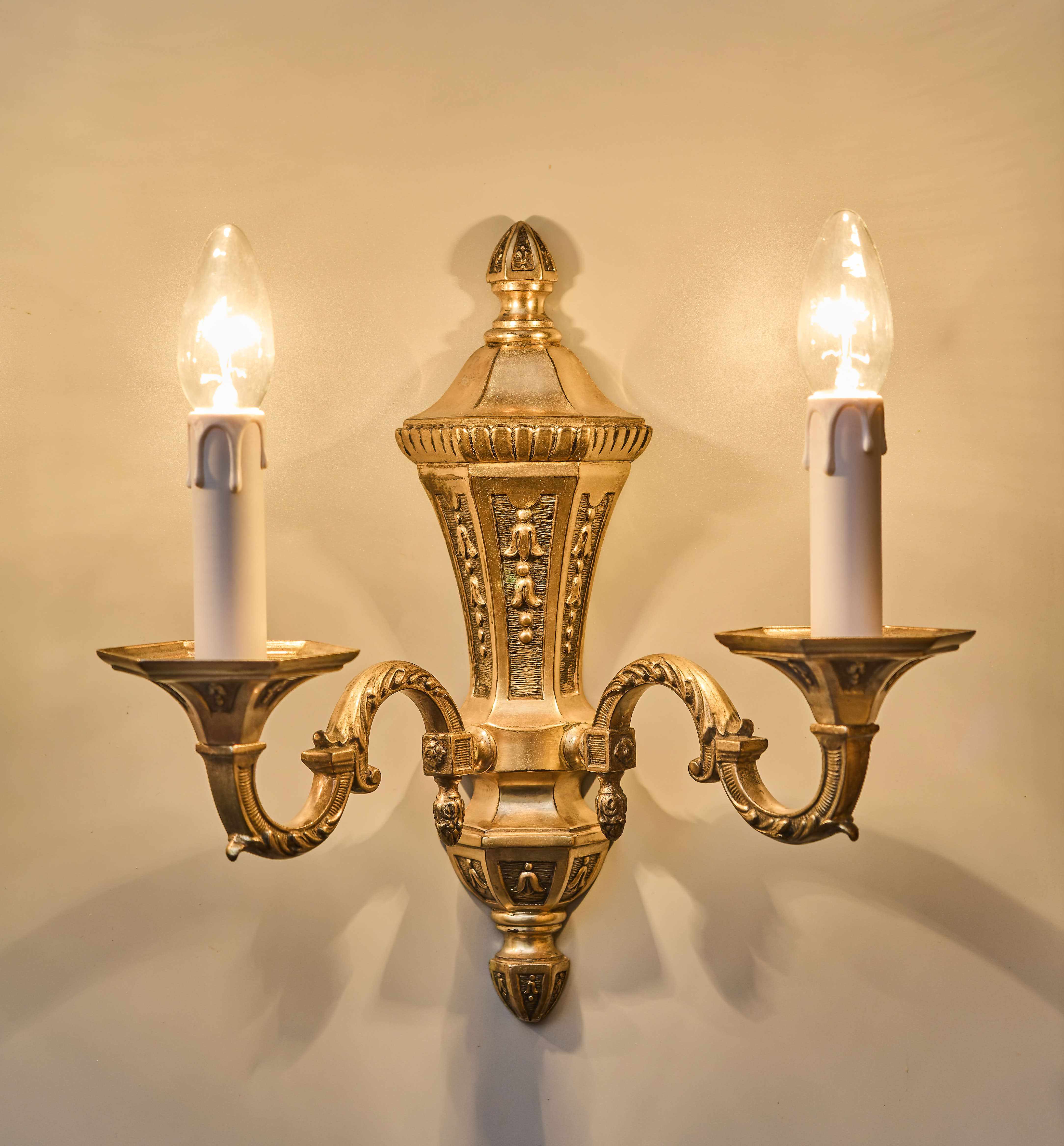 Nástěnné lampy z bílé mosazi v renesančním stylu. Lampy mají zrenovovanou elektroinstalaci do mědi, nové objímky a šešule (kryty objímek). Velmi kvalitní provedení z poloviny minulého století. Lampy byly vyrobeny v pařížských dílnách. Cena za kus 5000 Kč a za obě 8800 Kč