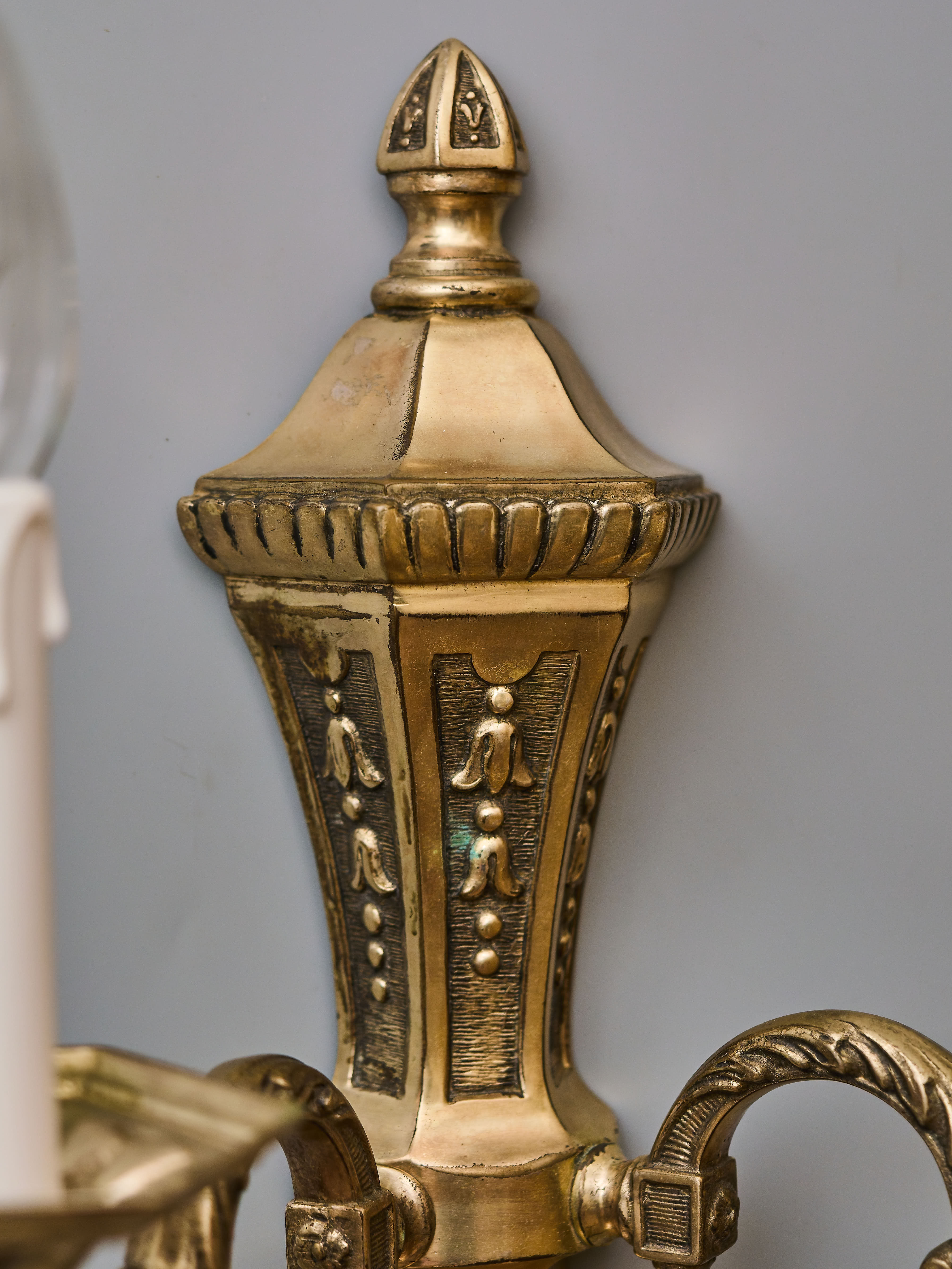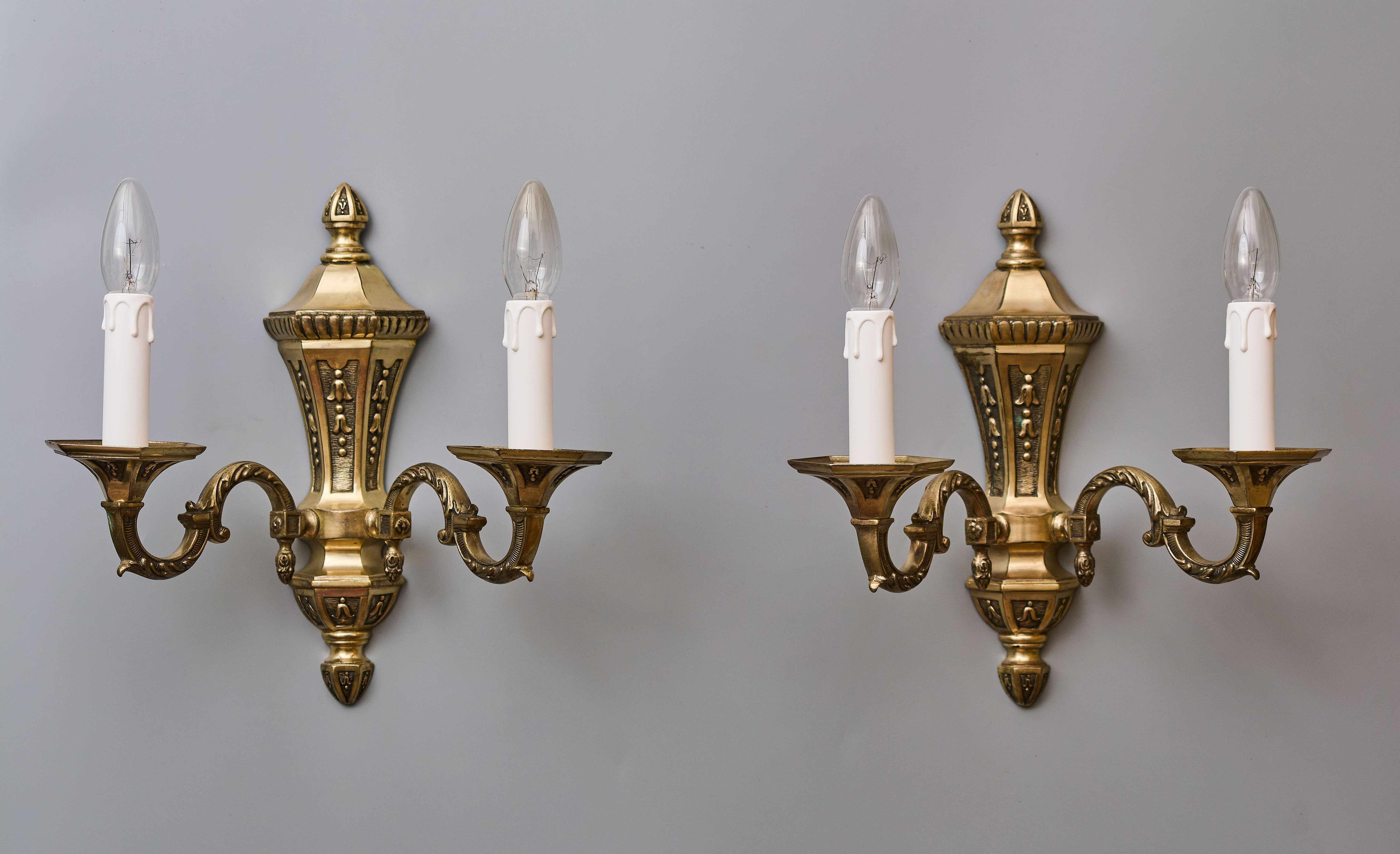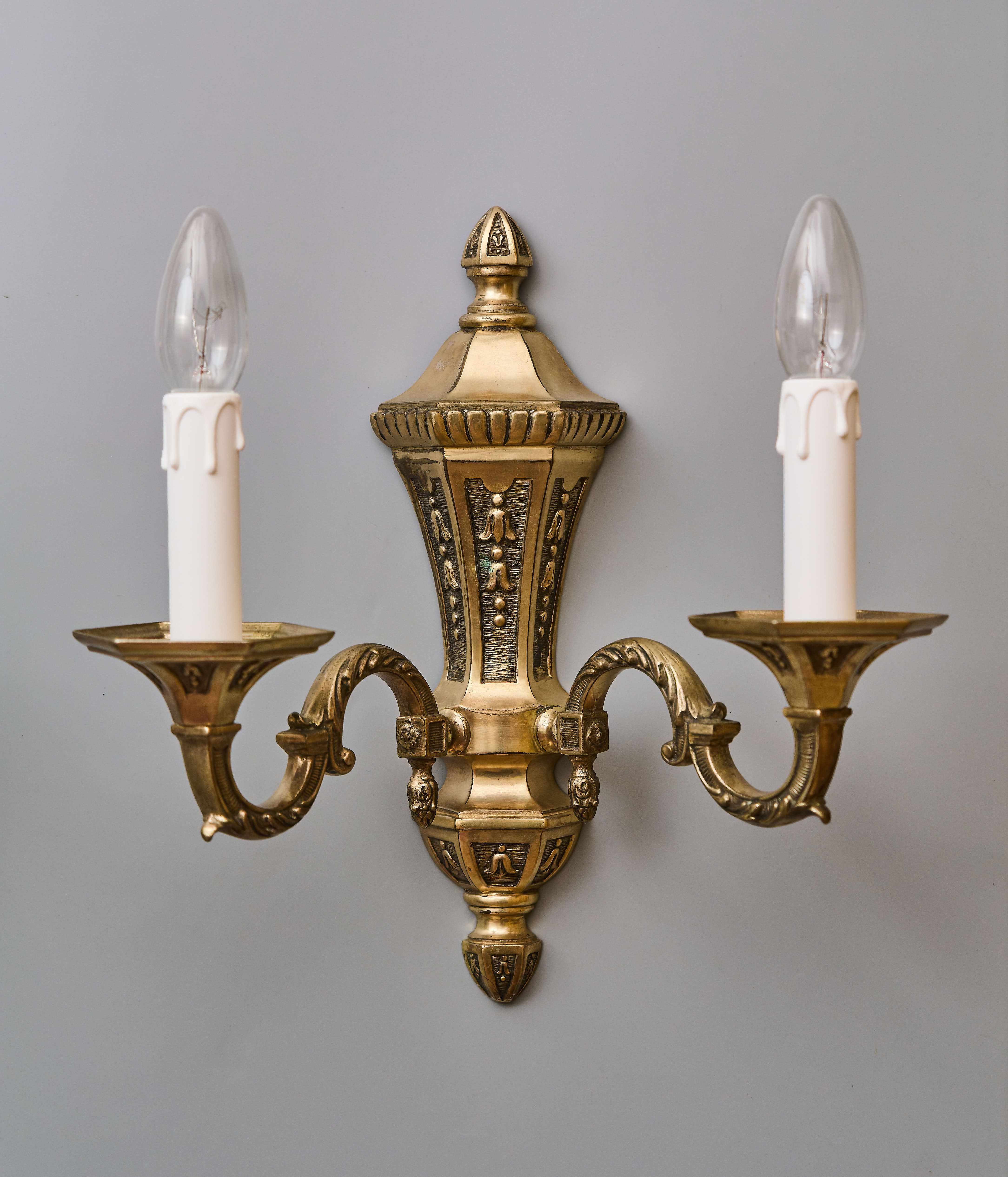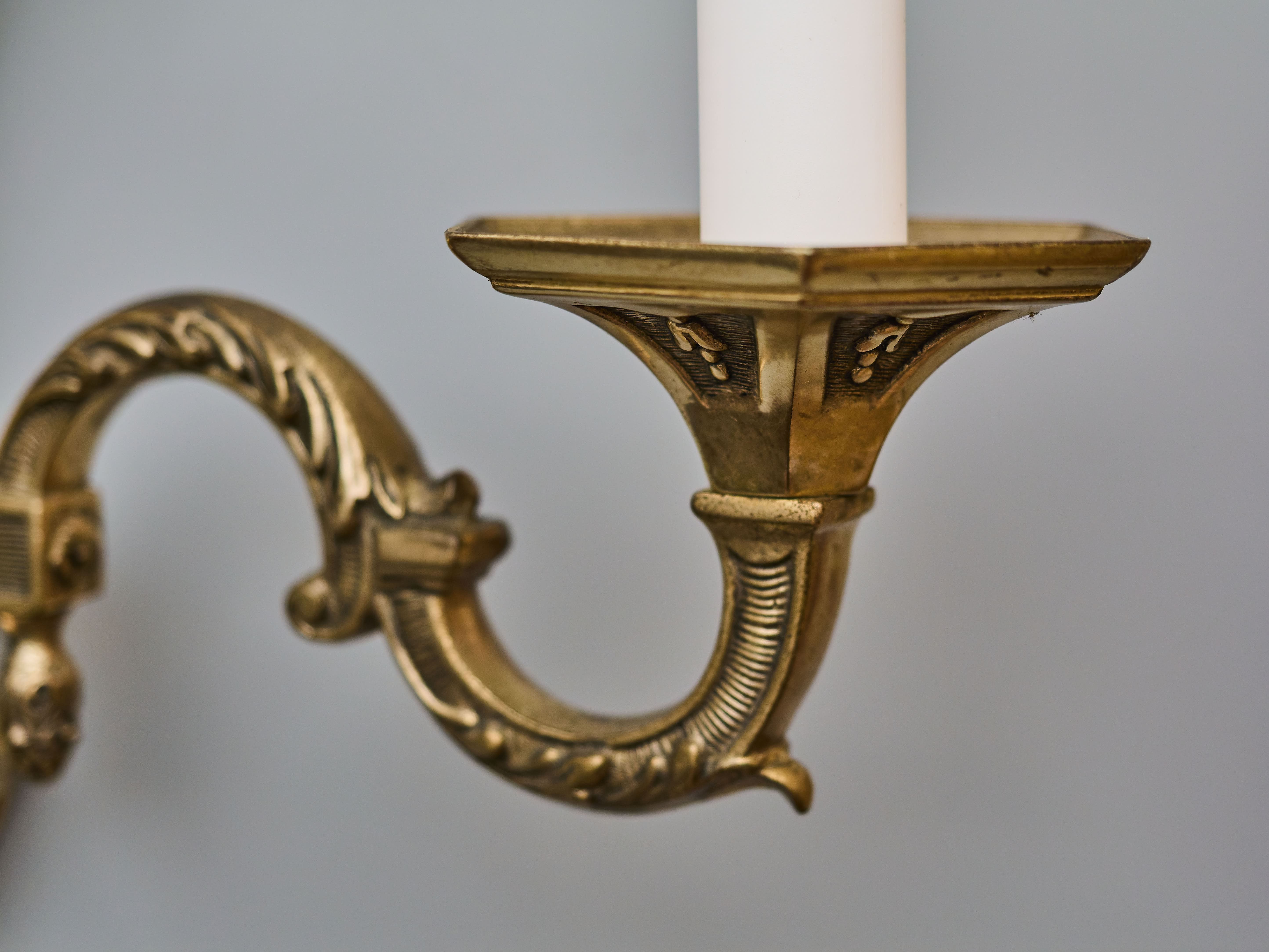 Nástěnné lampy z bílé mosazi v renesančním stylu. Lampy mají zrenovovanou elektroinstalaci do mědi, nové objímky a šešule (kryty objímek). Velmi kvalitní provedení z poloviny minulého století. Lampy byly vyrobeny v pařížských dílnách. Cena za kus 5000 Kč a za obě 8800 Kč