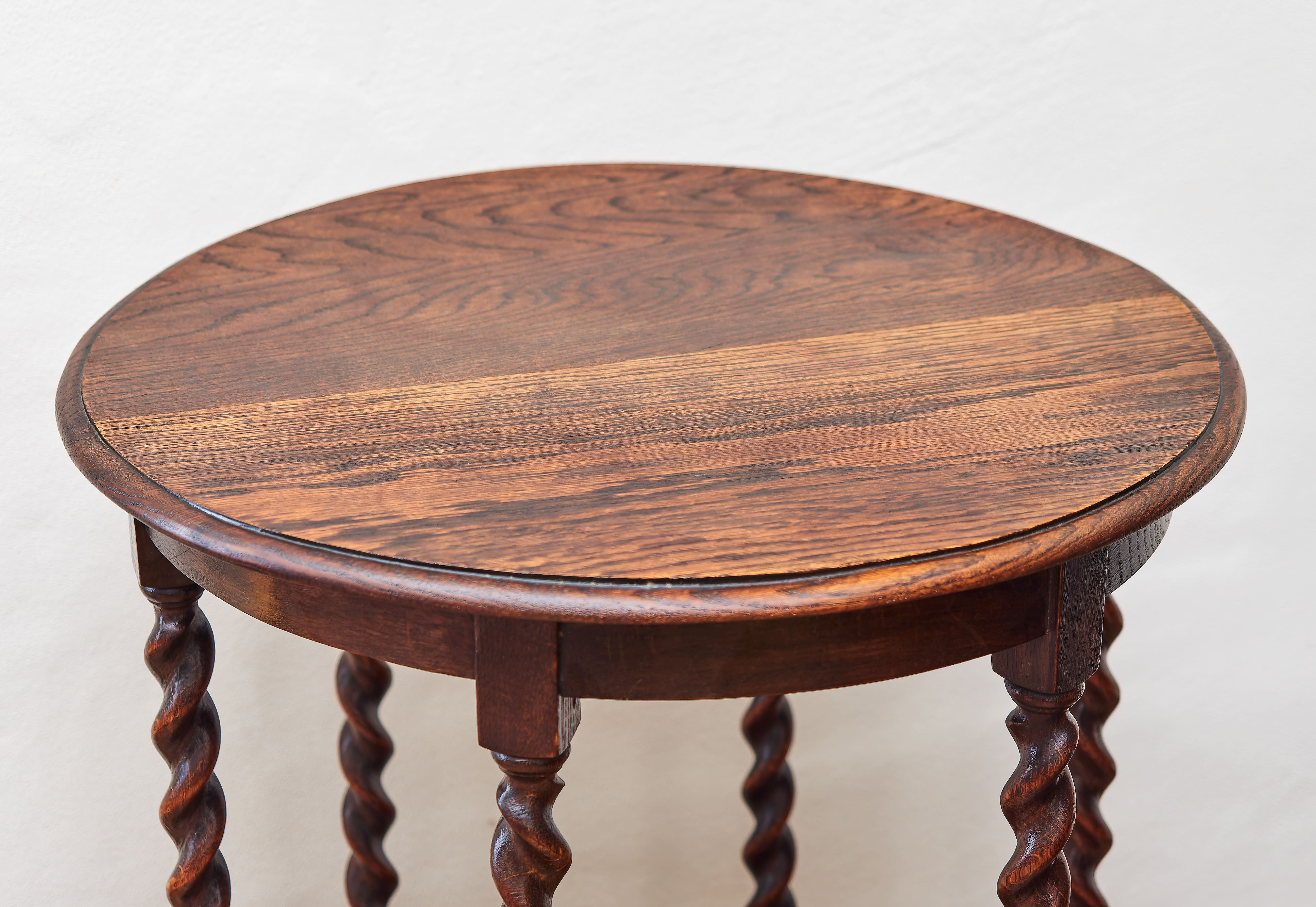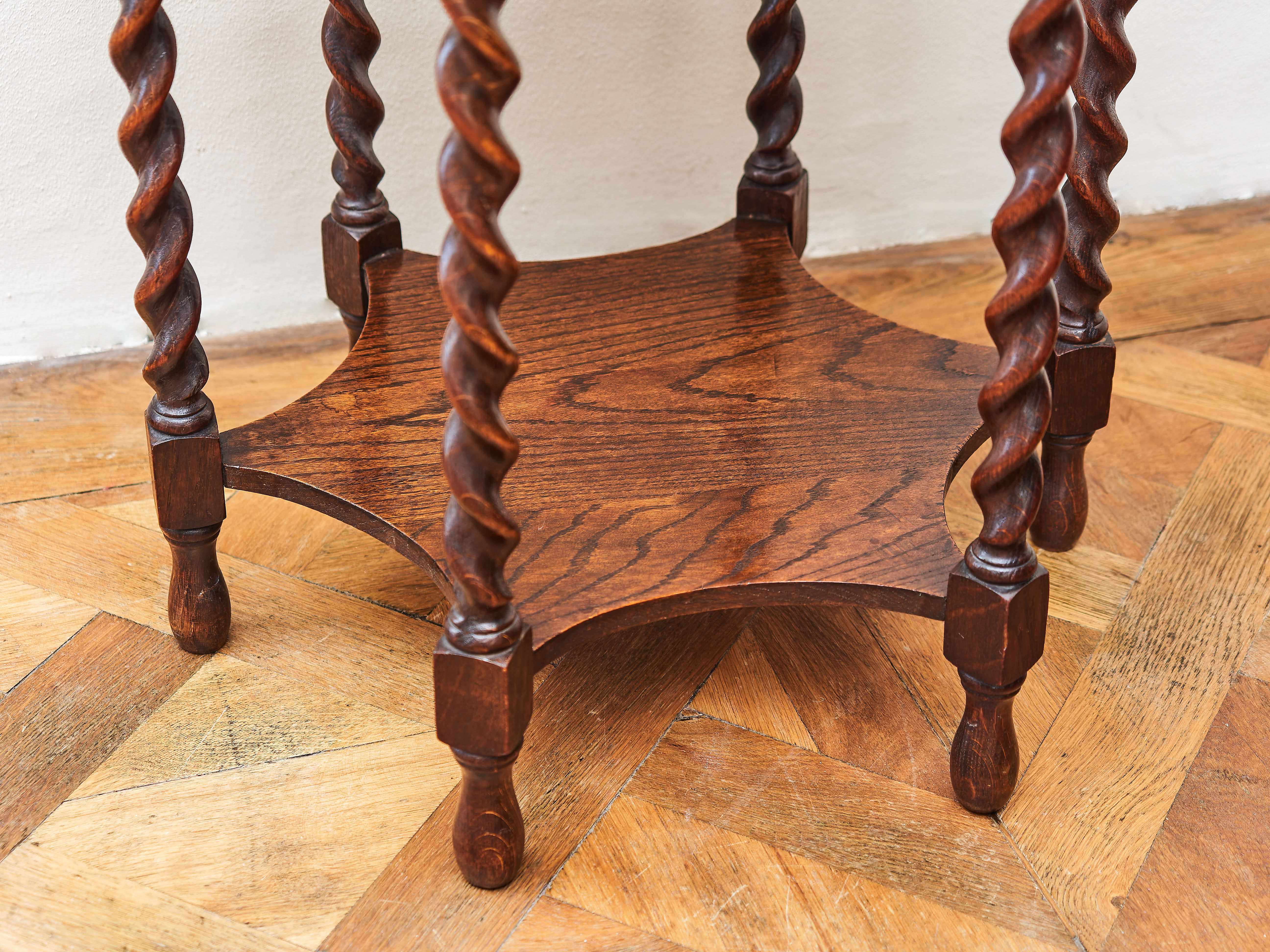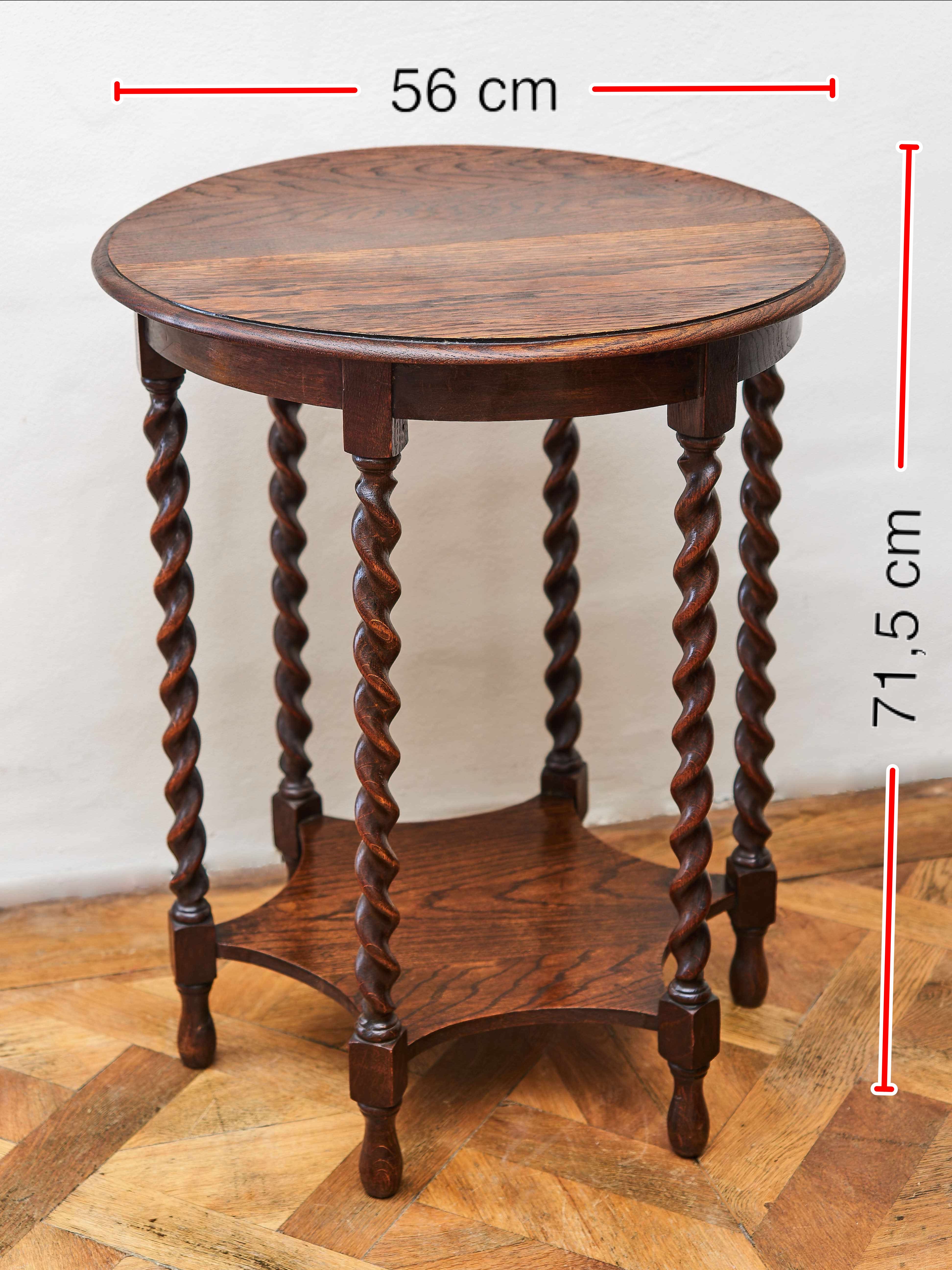 Dubový odkládací stolek v renesančním stylu. Kulatá deska z masivního dubu spočívá na šesti elegantně tordovaných nohách, které dodávají stolku dekorativní charakter. Spodní odkládací plocha ve tvaru hvězdice zvyšuje stabilitu i praktičnost. Stolek je v excelentním stavu, pevný a bez poškození, s krásnou patinou, která podtrhuje jeho historický půvab.