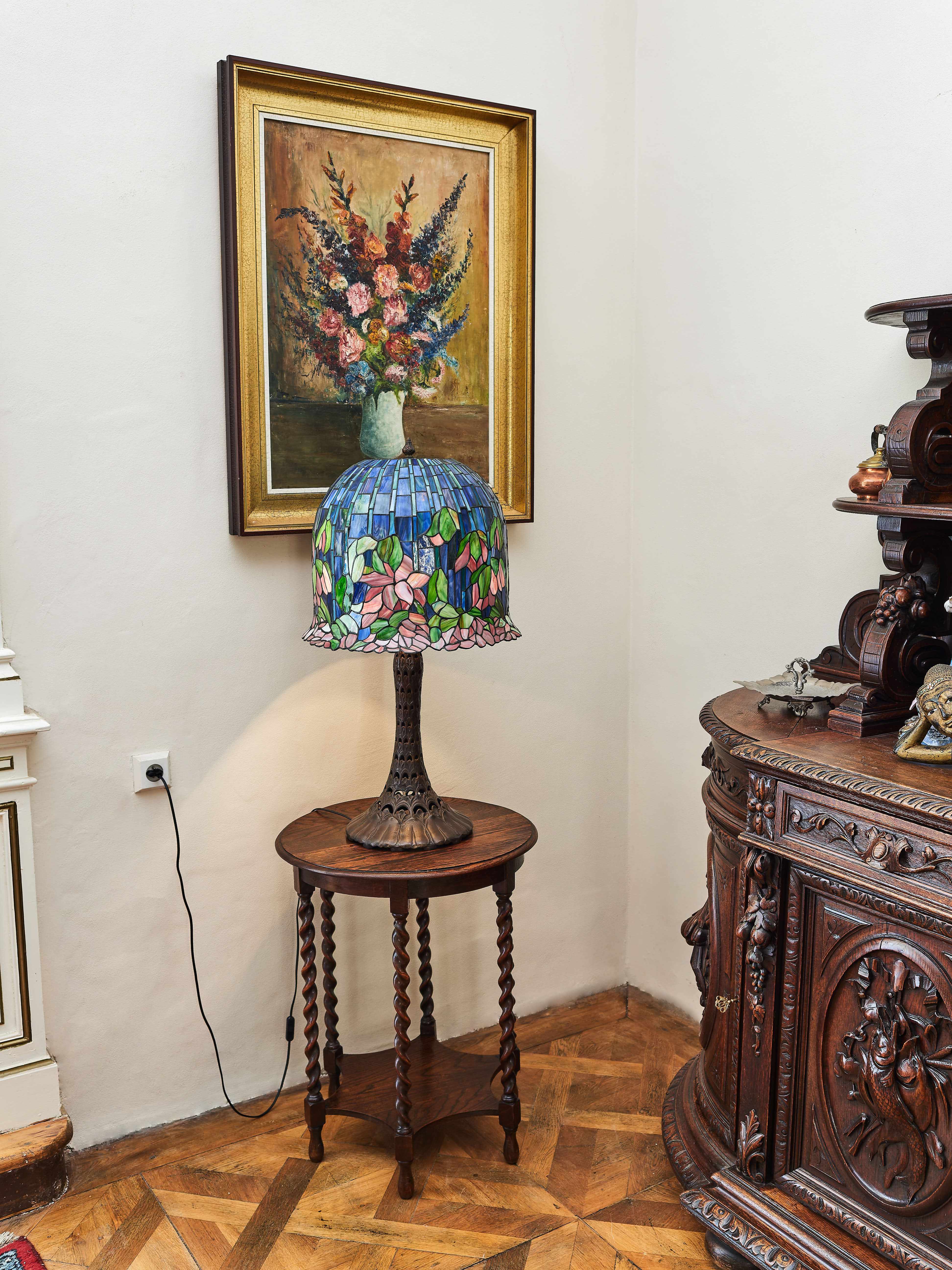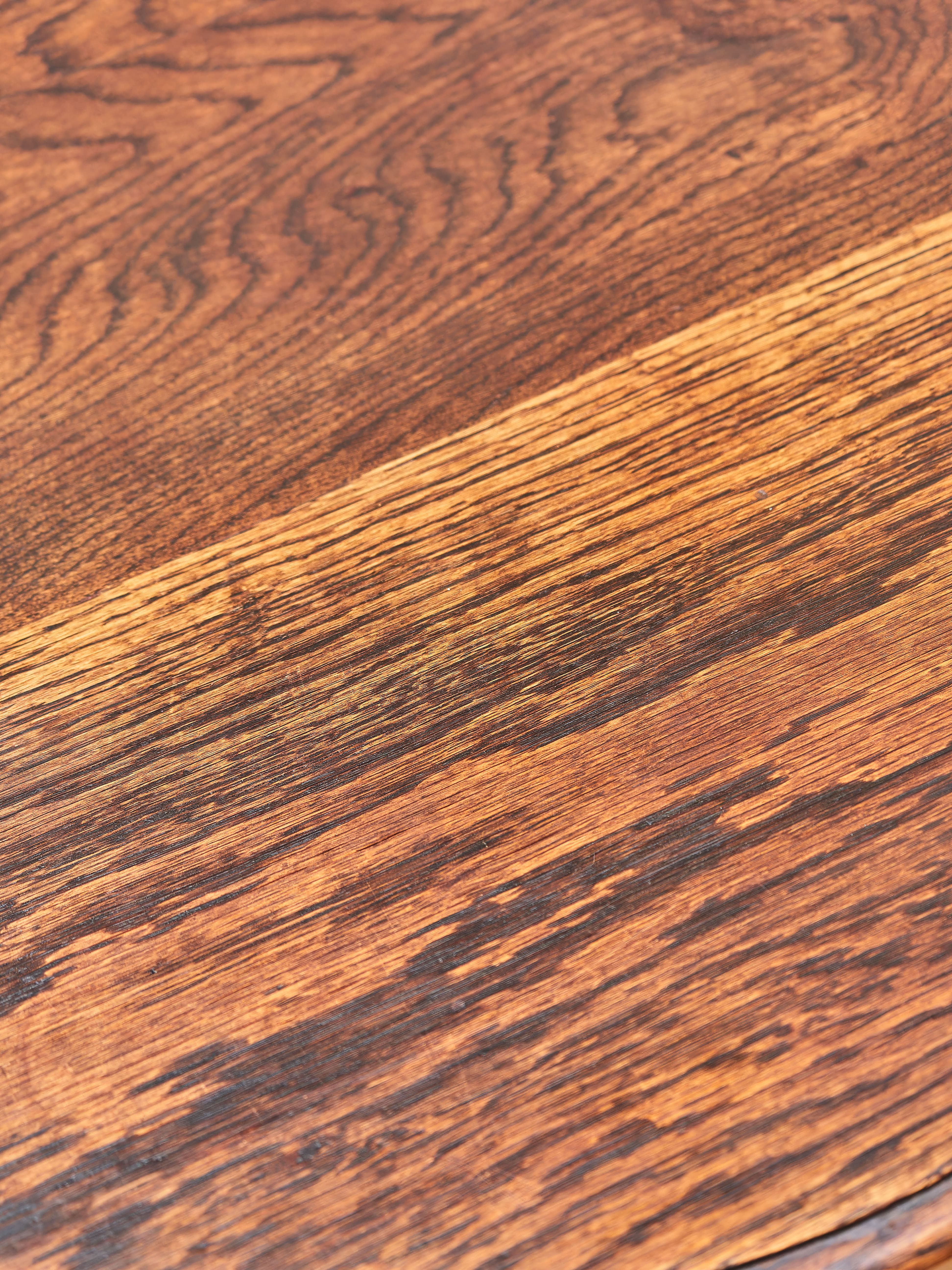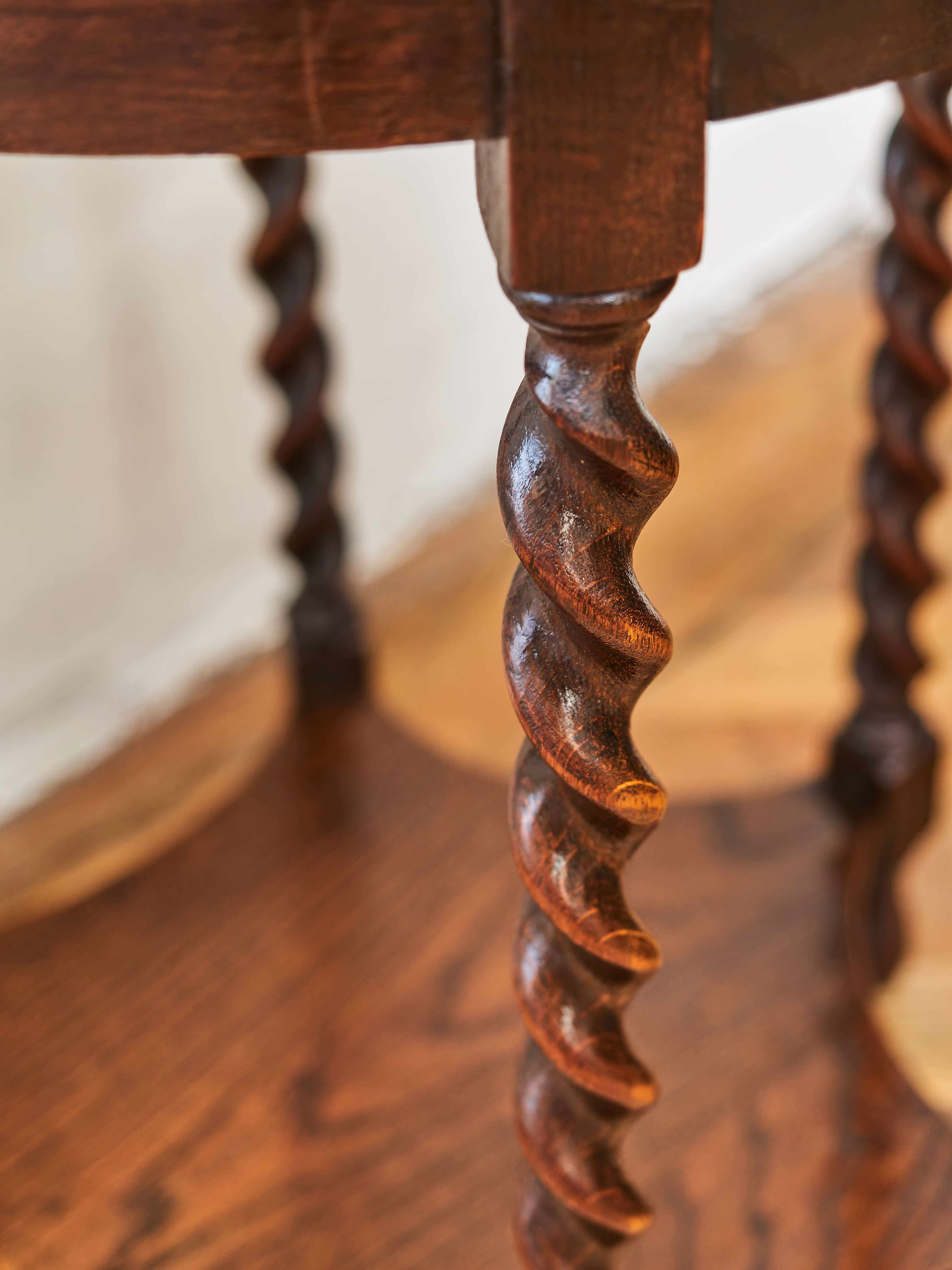 Dubový odkládací stolek v renesančním stylu. Kulatá deska z masivního dubu spočívá na šesti elegantně tordovaných nohách, které dodávají stolku dekorativní charakter. Spodní odkládací plocha ve tvaru hvězdice zvyšuje stabilitu i praktičnost. Stolek je v excelentním stavu, pevný a bez poškození, s krásnou patinou, která podtrhuje jeho historický půvab.