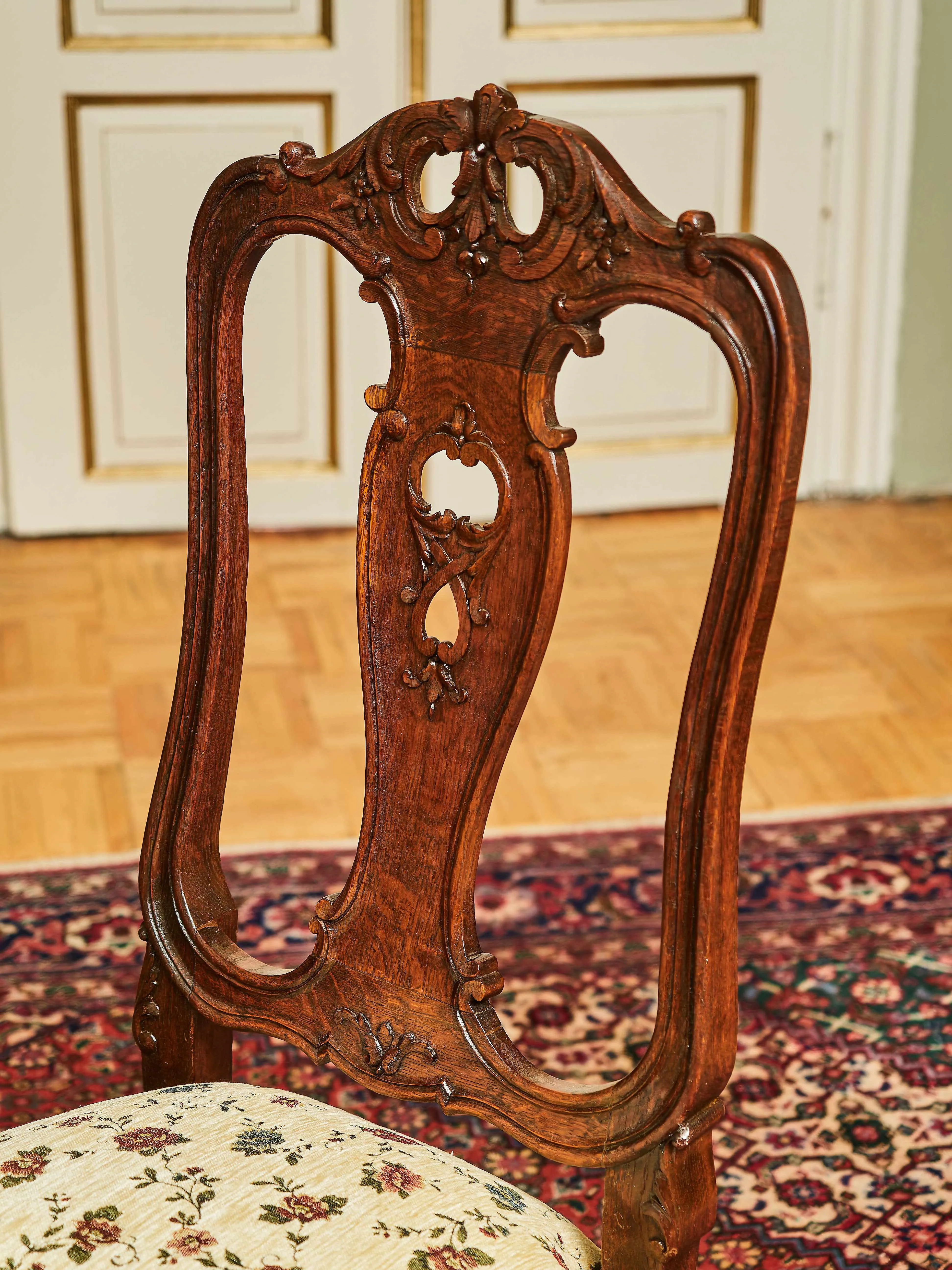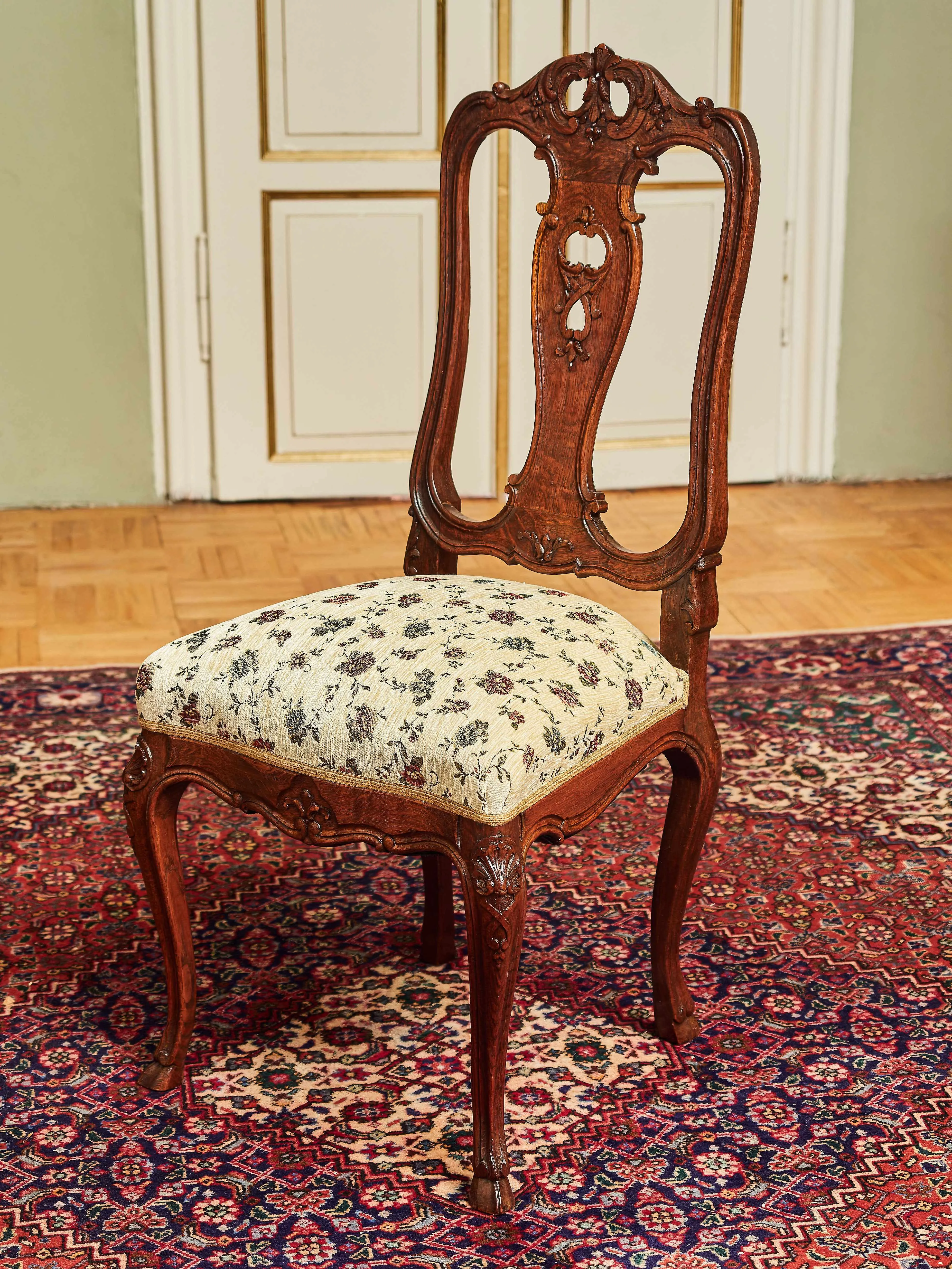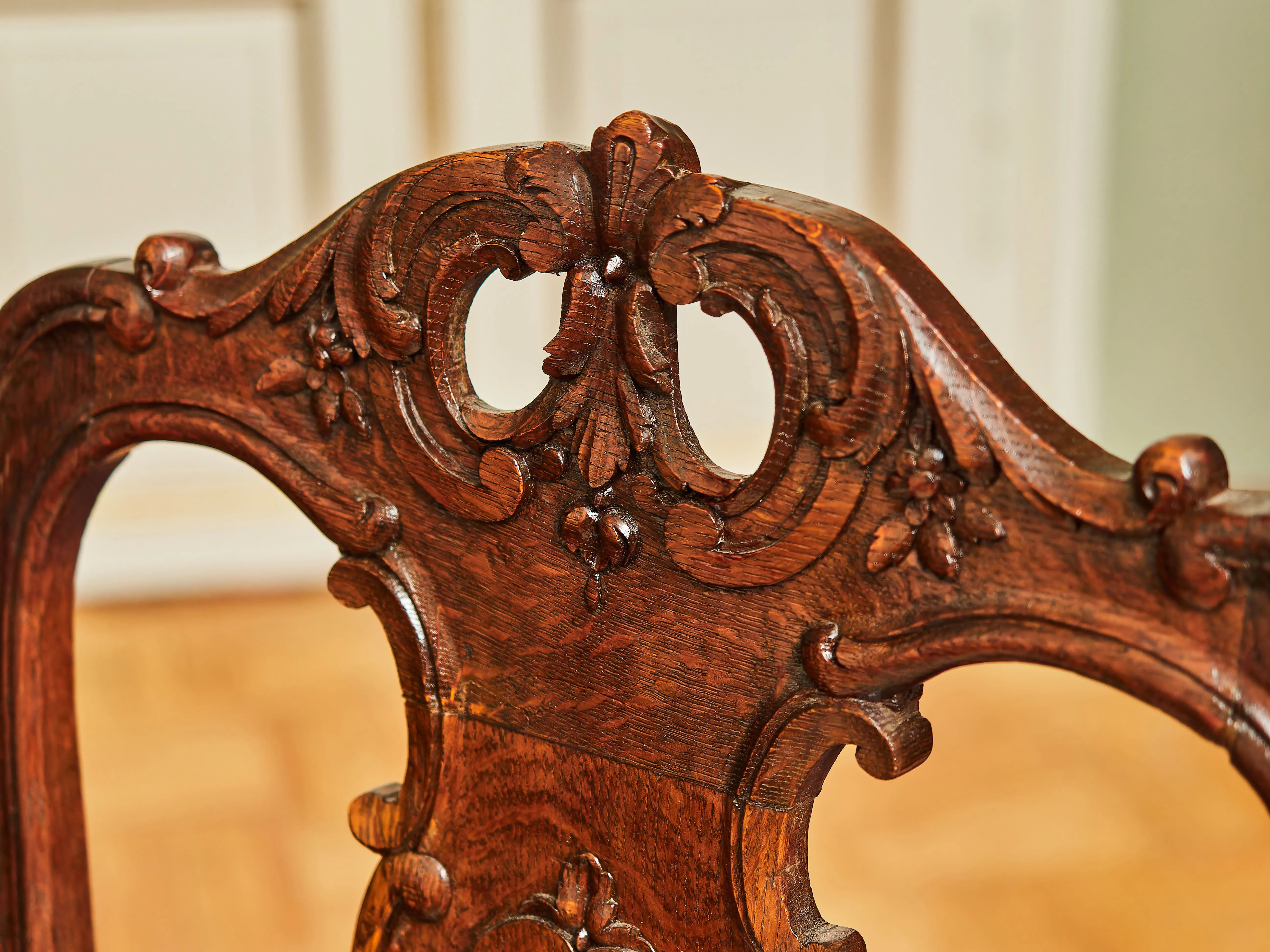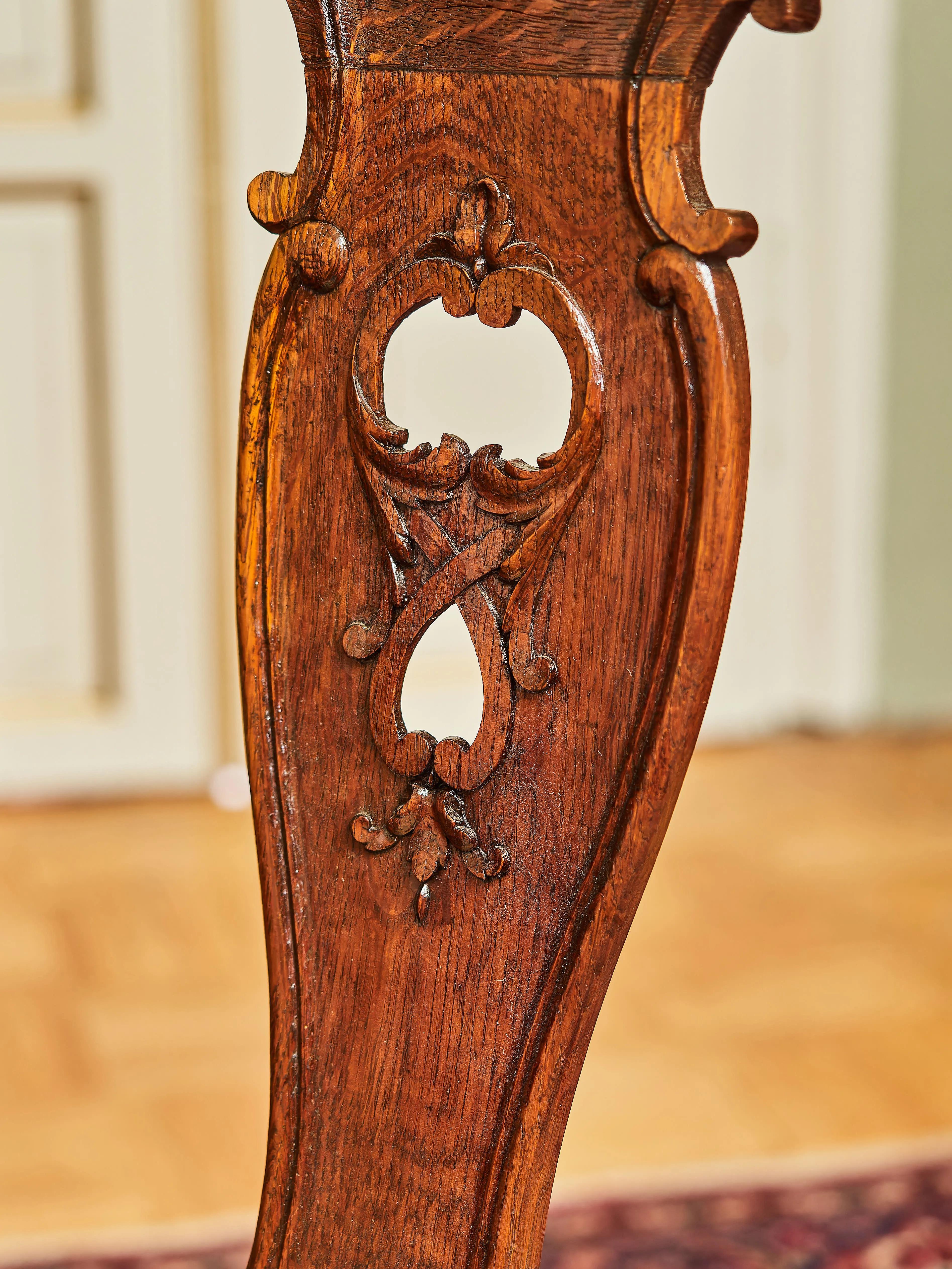Sada šesti ručně vyřezávaných židlí z masivního dubu ve stylu Ludvíka XV. pochází z oblasti Lutychu a představuje špičkové řemeslné zpracování s bohatě zdobenými detaily v duchu neorokoka. Každá židle prošla kompletním odborným restaurováním – konstrukce byla pevně zpevněna, povrch byl upraven tradiční šelakovou politurou a nové čalounění bylo provedeno původní historickou metodou.