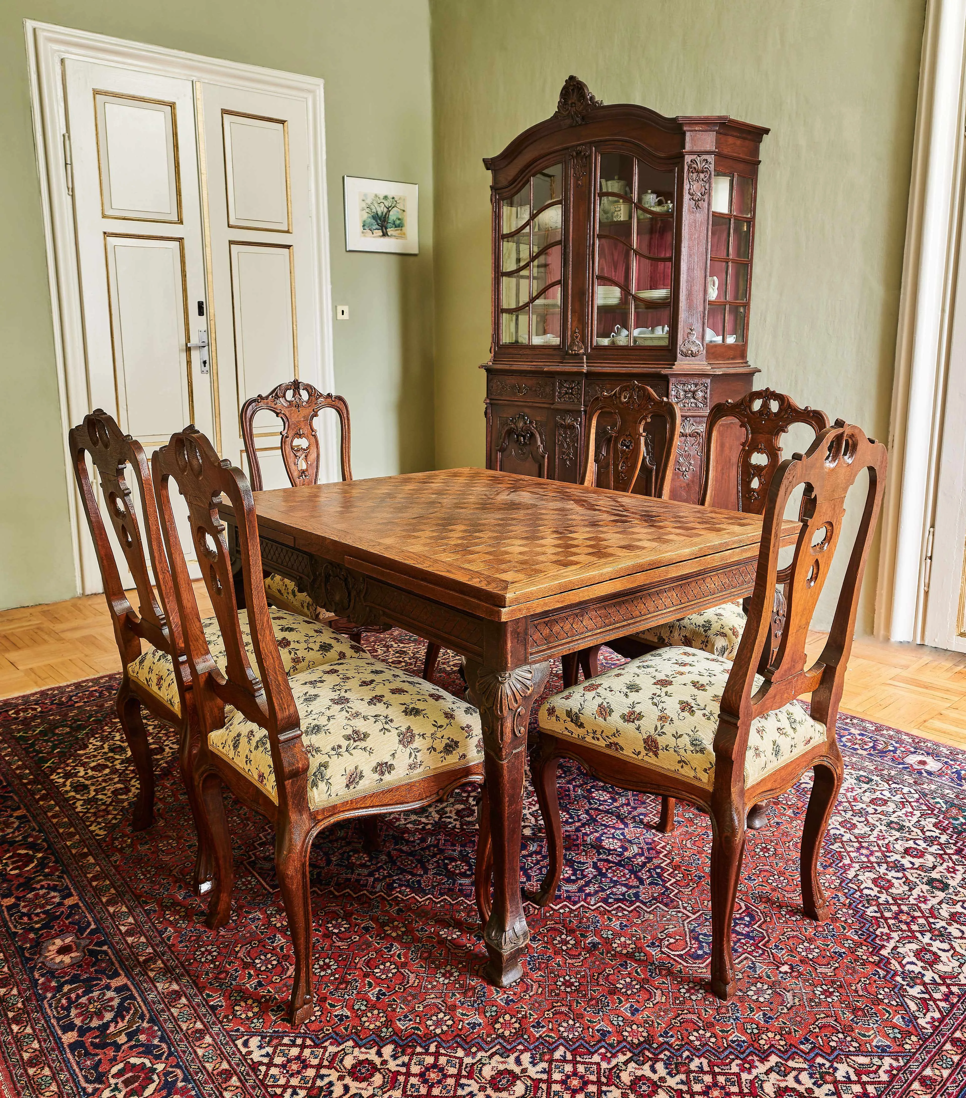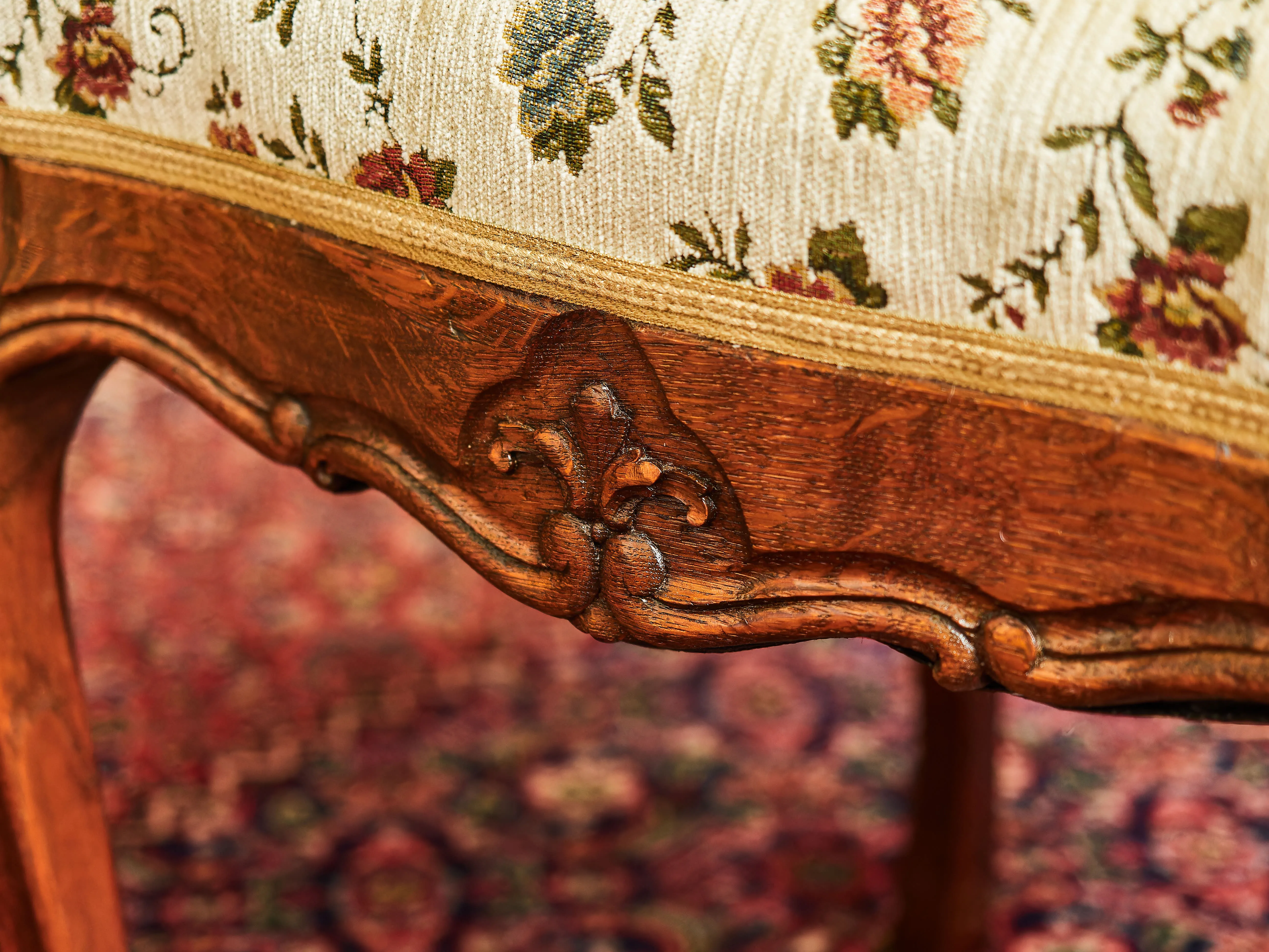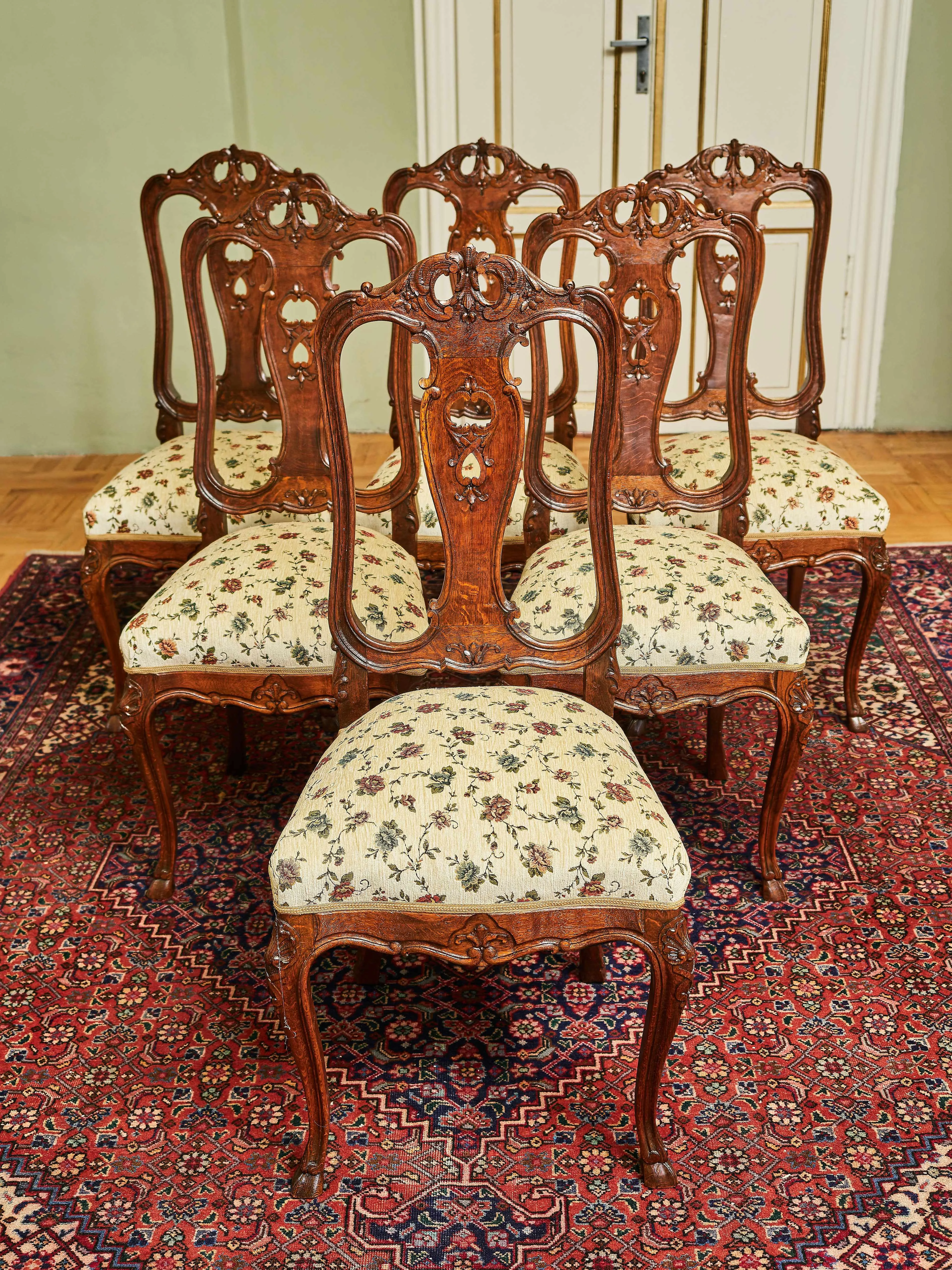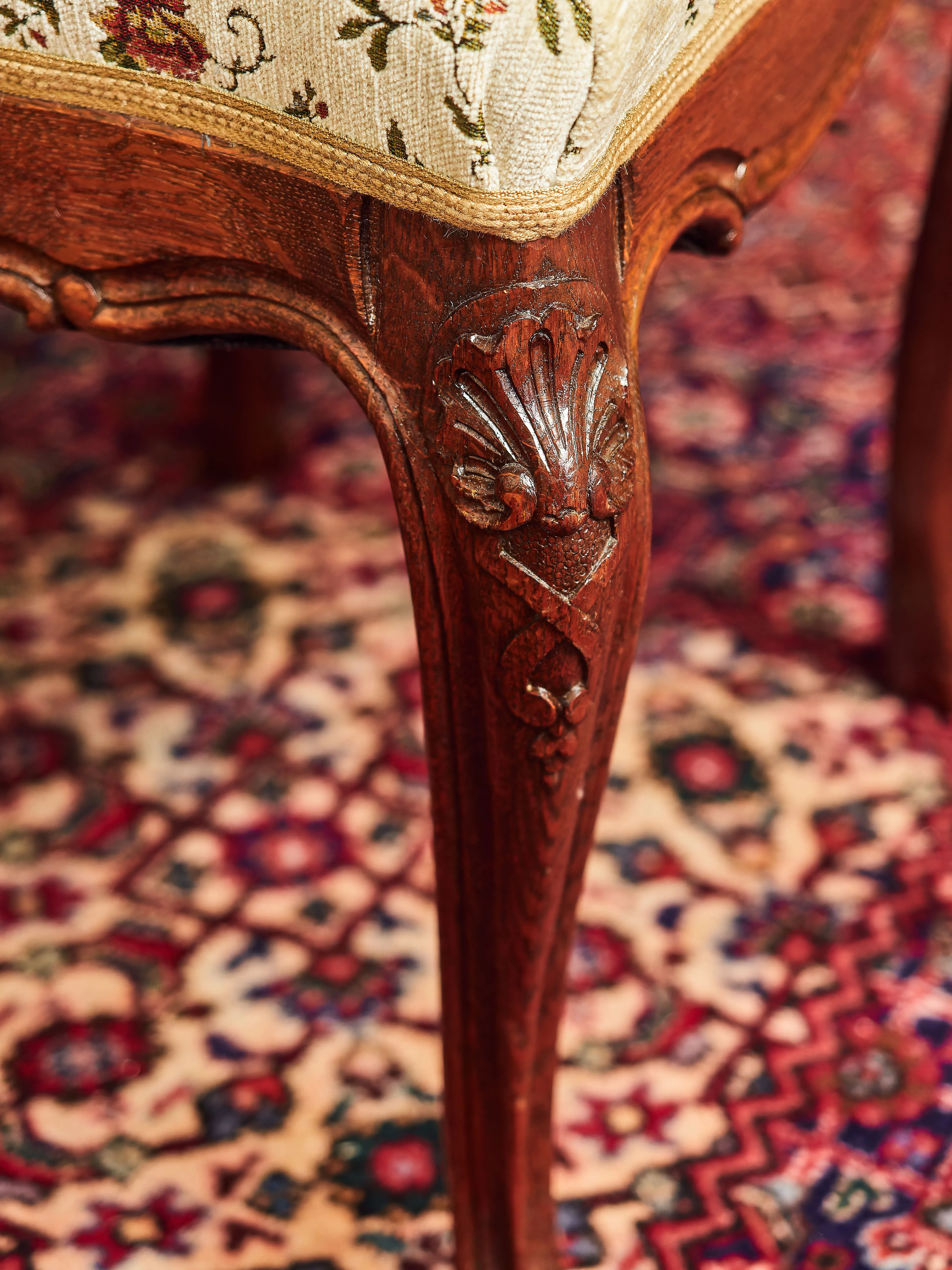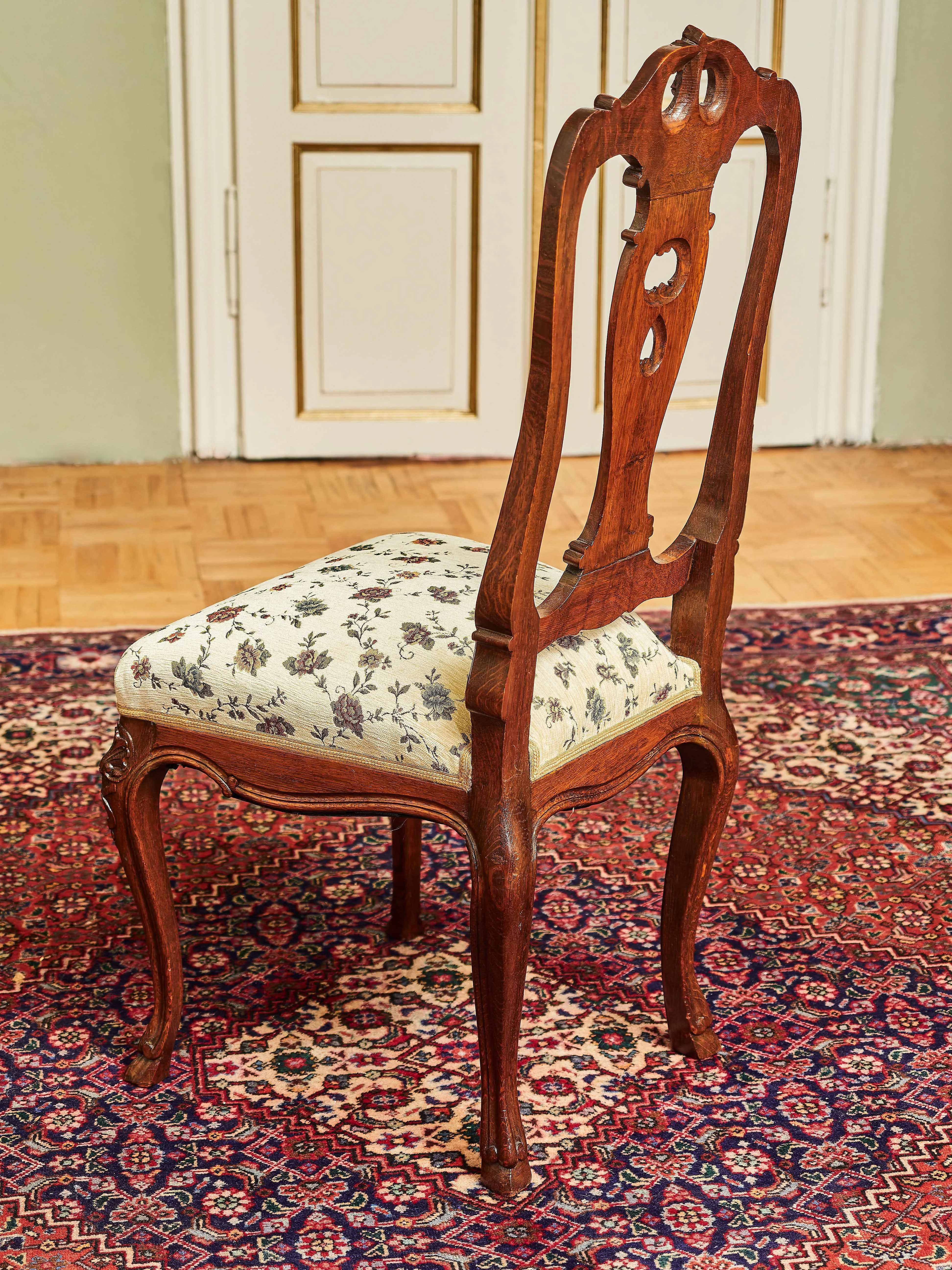 Sada šesti ručně vyřezávaných židlí z masivního dubu ve stylu Ludvíka XV. pochází z oblasti Lutychu a představuje špičkové řemeslné zpracování s bohatě zdobenými detaily v duchu neorokoka. Každá židle prošla kompletním odborným restaurováním – konstrukce byla pevně zpevněna, povrch byl upraven tradiční šelakovou politurou a nové čalounění bylo provedeno původní historickou metodou.