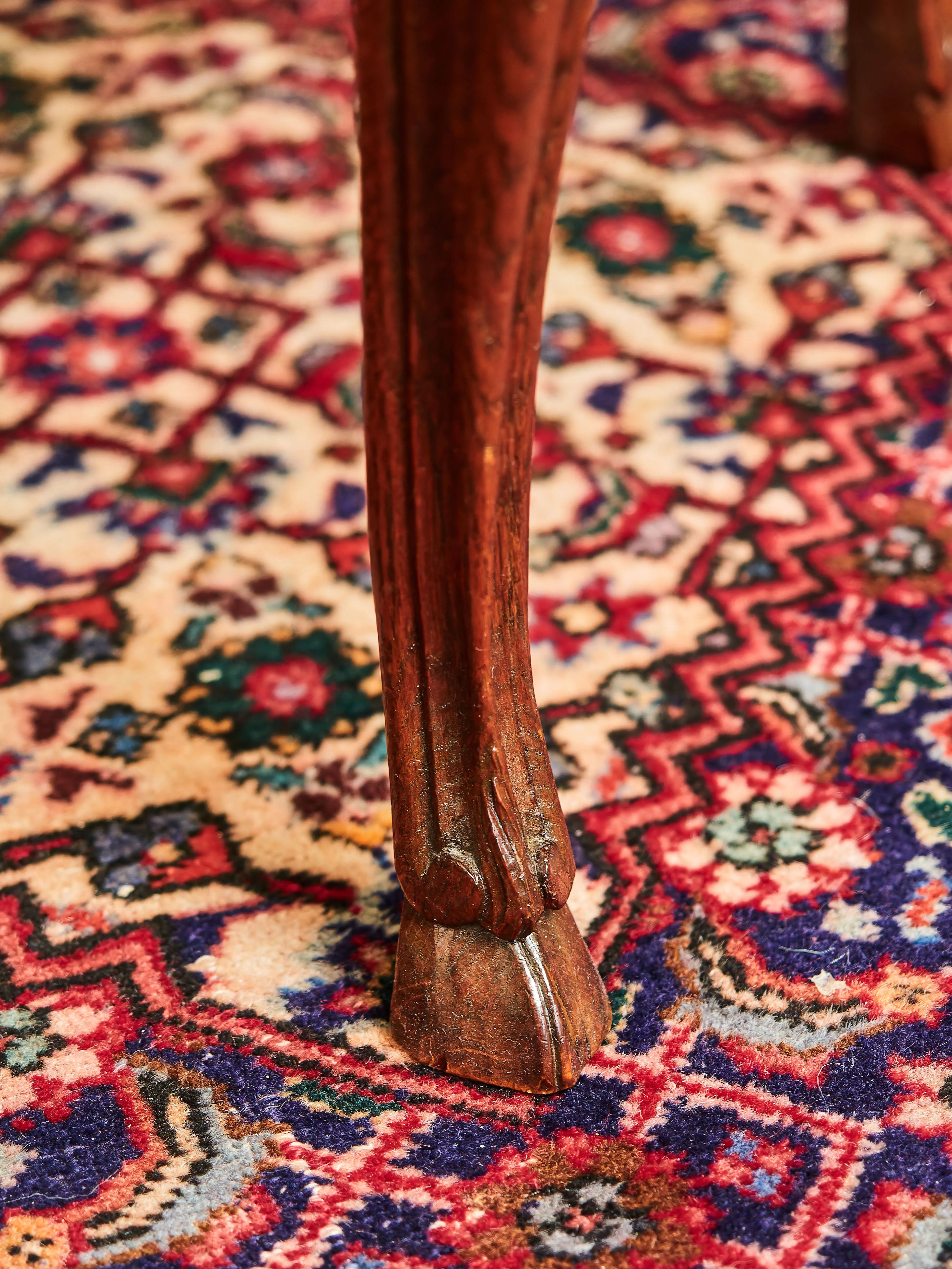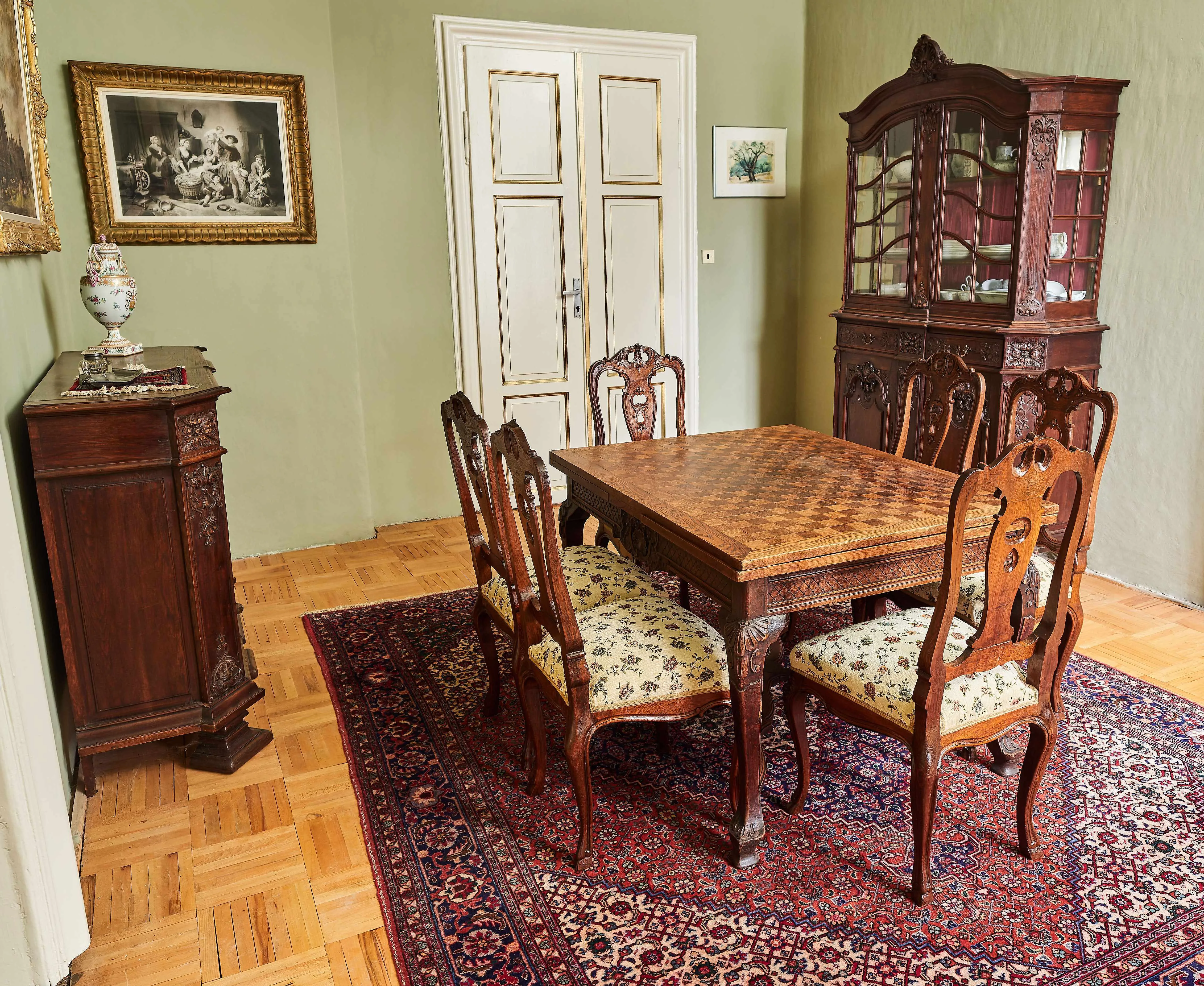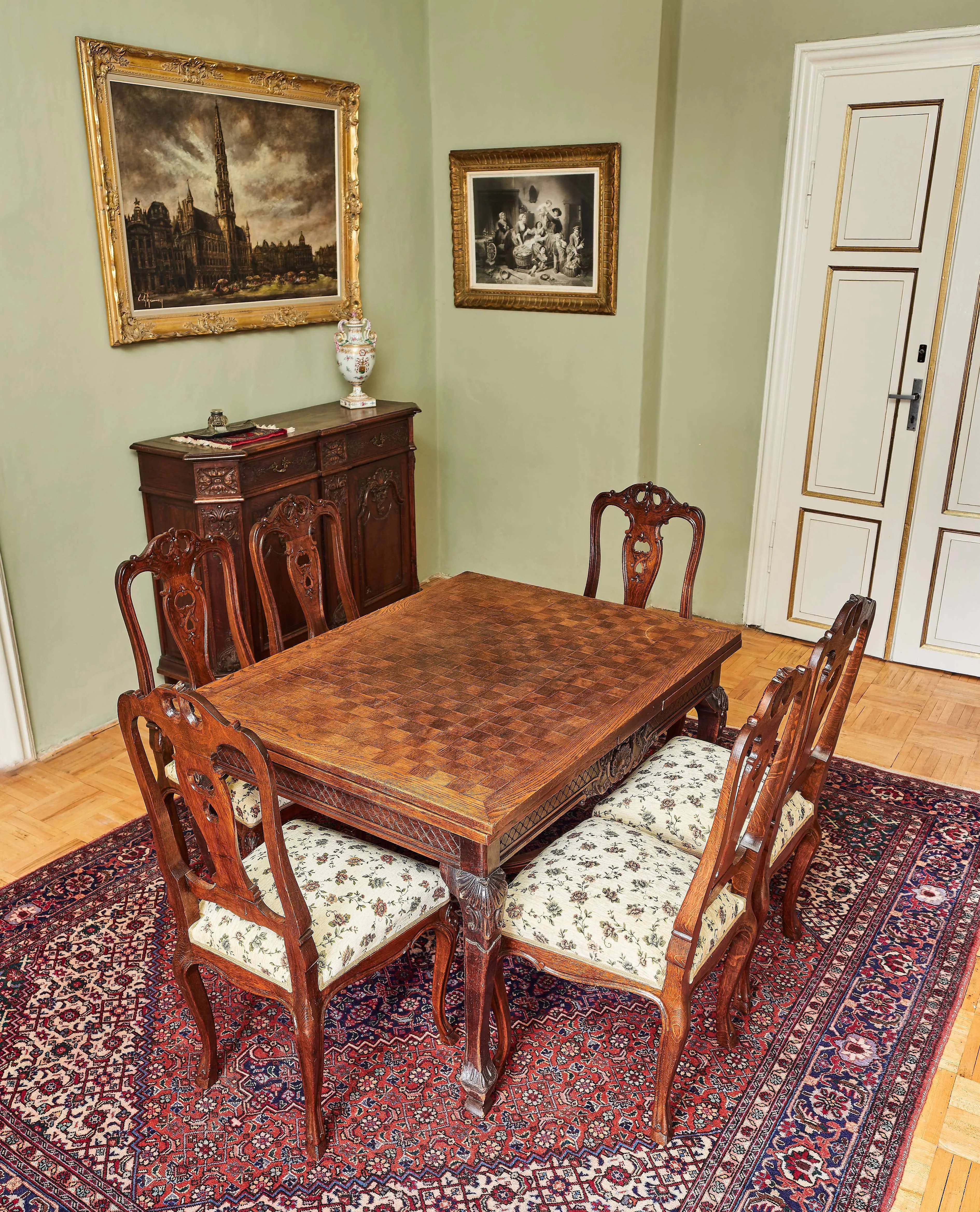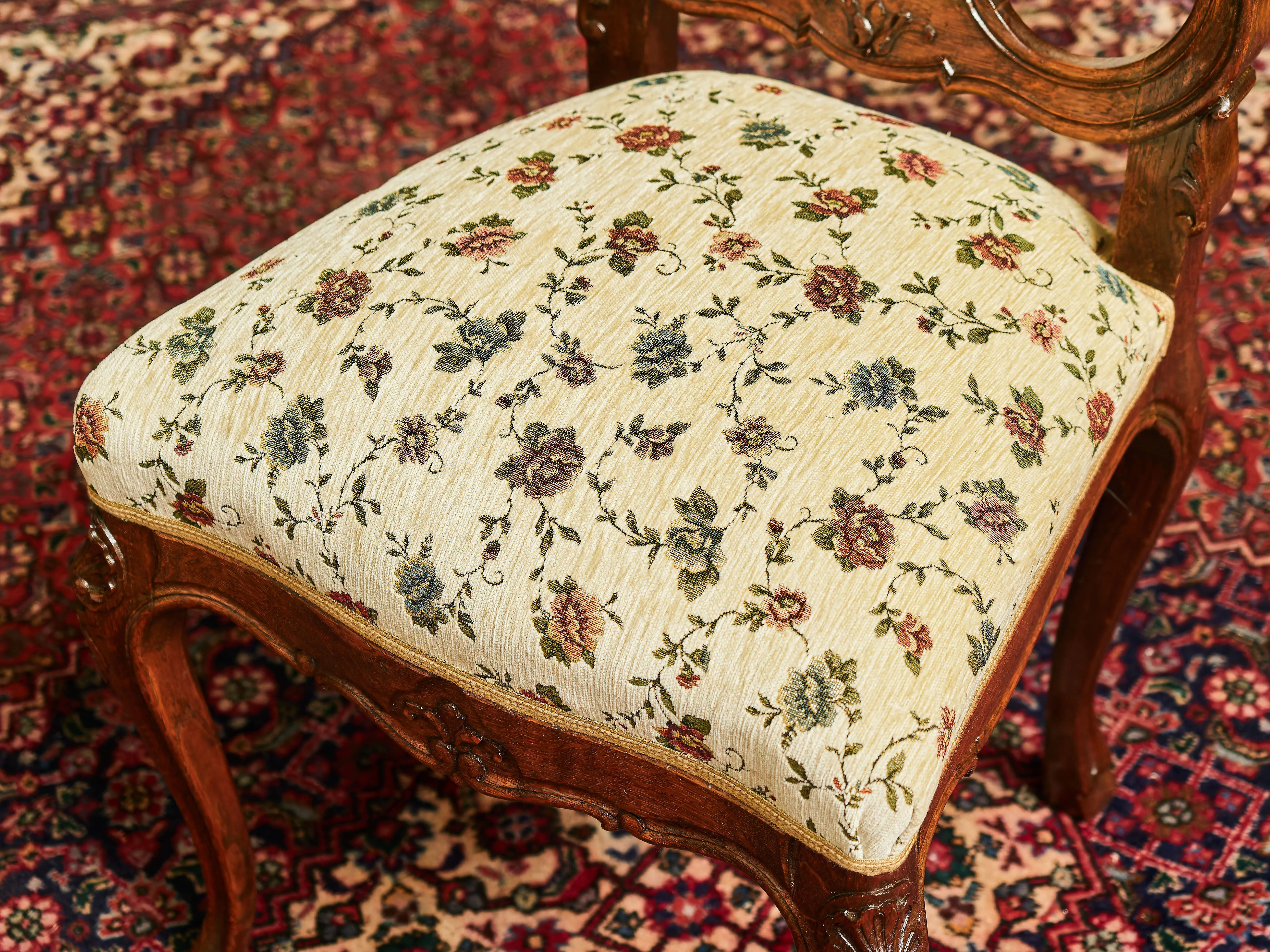 Sada šesti ručně vyřezávaných židlí z masivního dubu ve stylu Ludvíka XV. pochází z oblasti Lutychu a představuje špičkové řemeslné zpracování s bohatě zdobenými detaily v duchu neorokoka. Každá židle prošla kompletním odborným restaurováním – konstrukce byla pevně zpevněna, povrch byl upraven tradiční šelakovou politurou a nové čalounění bylo provedeno původní historickou metodou.