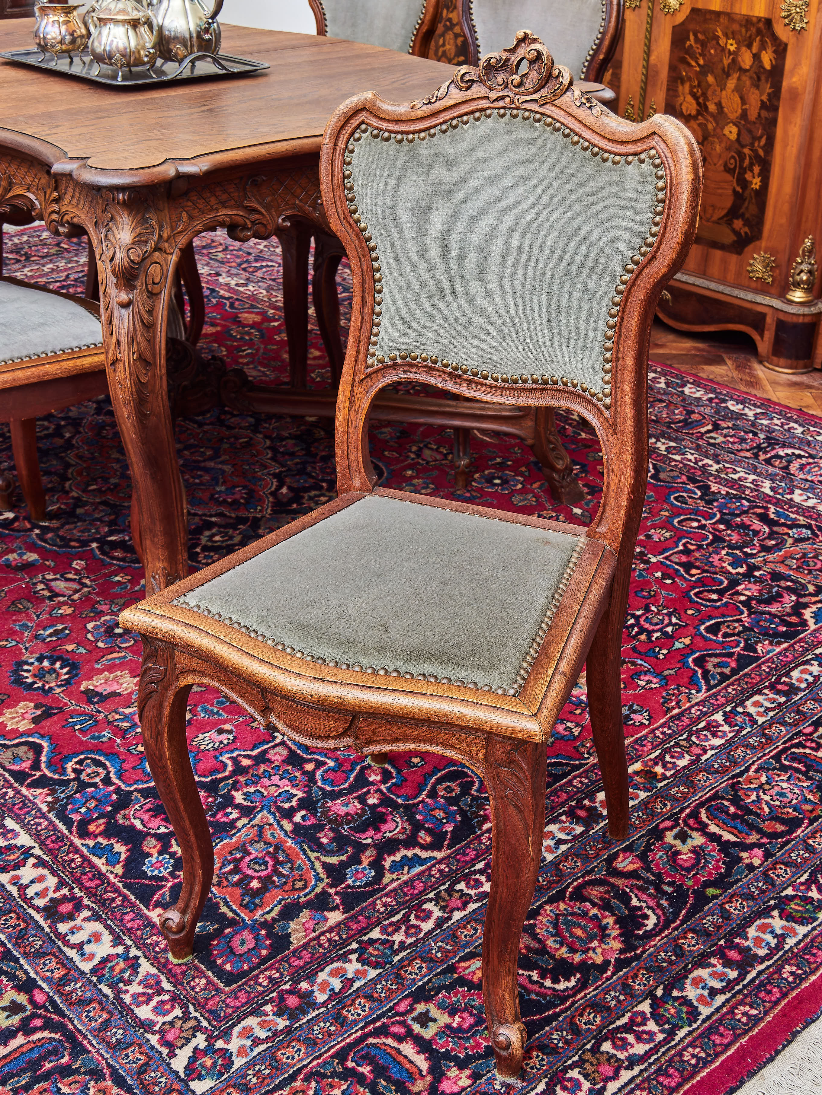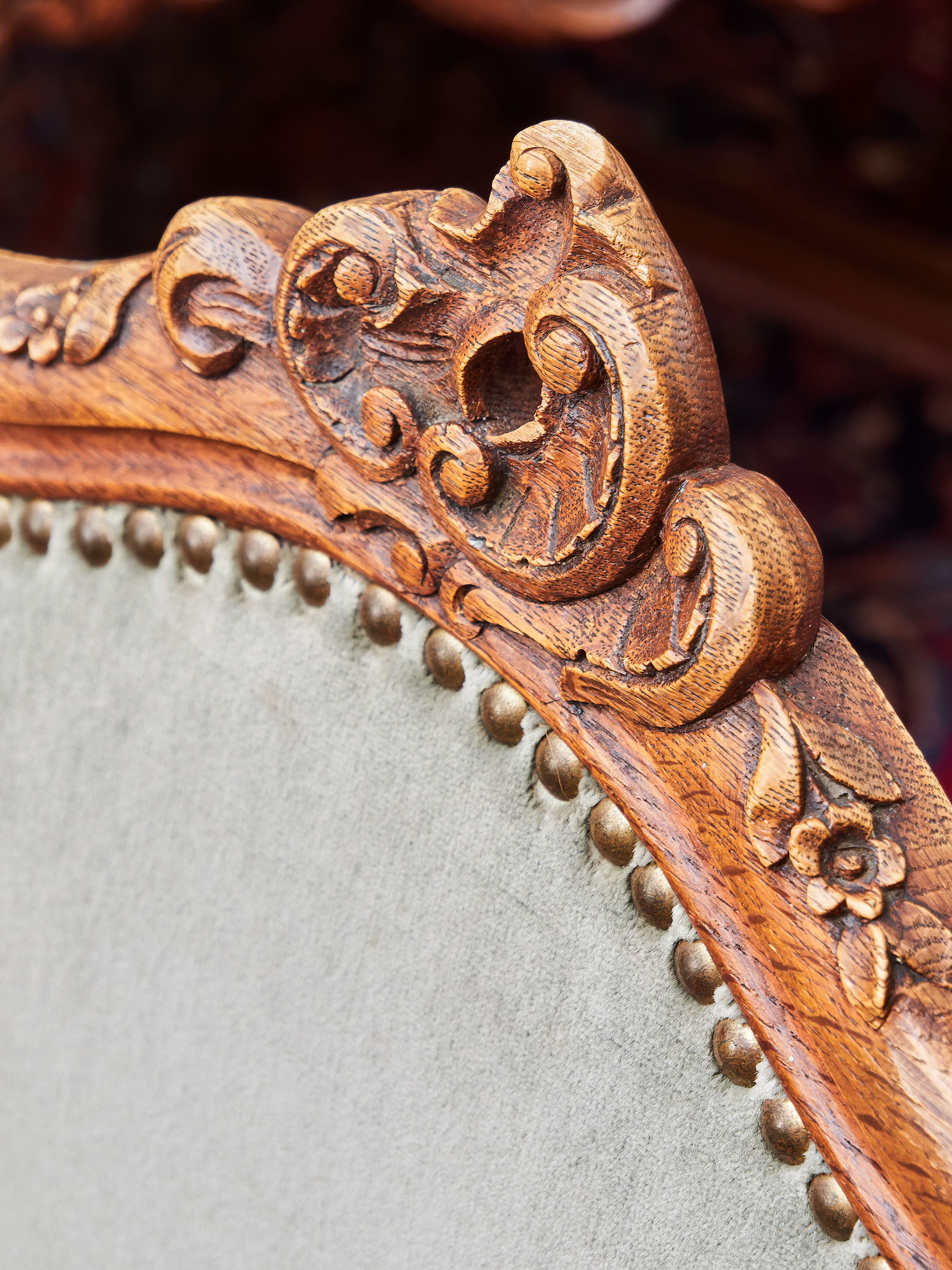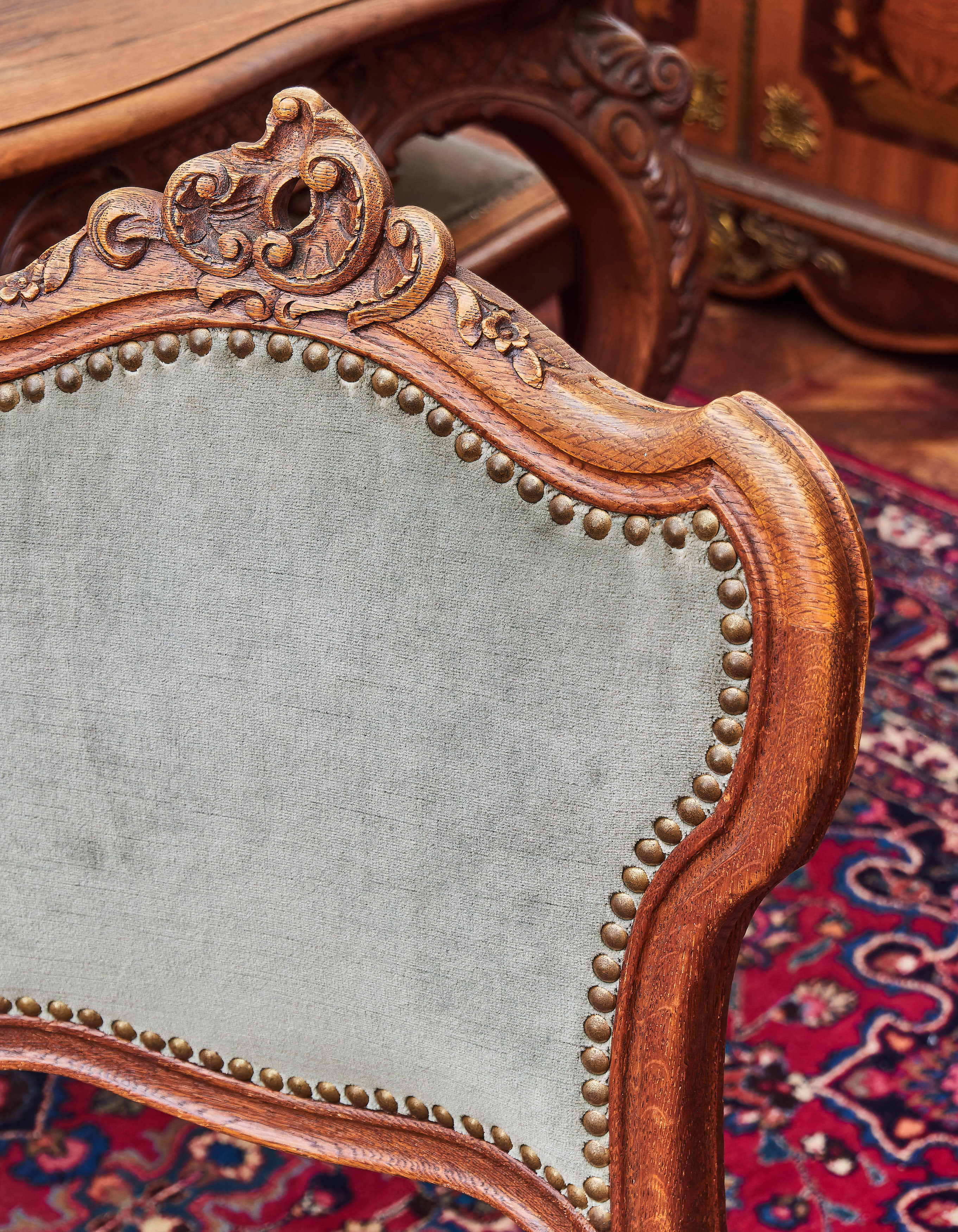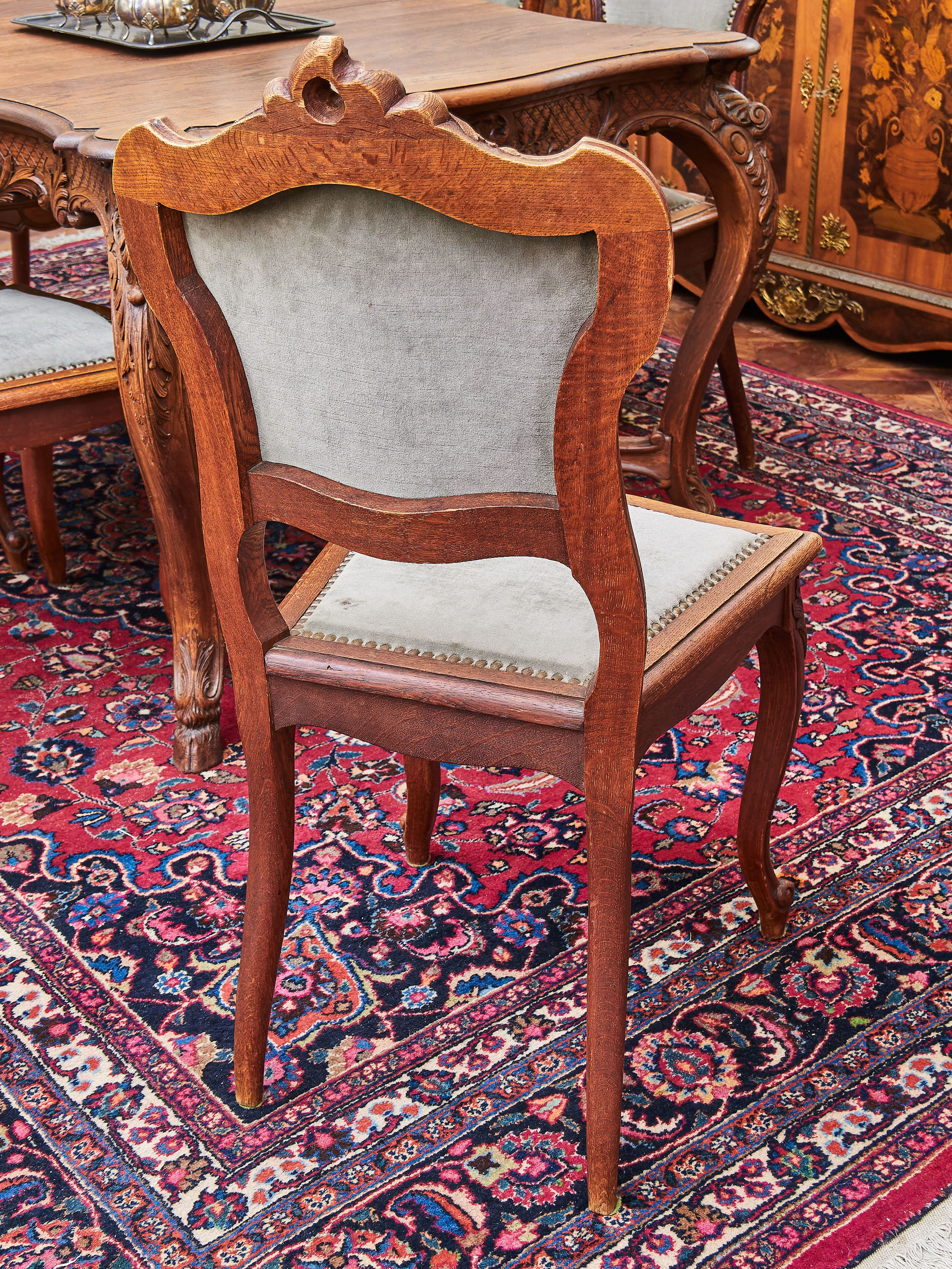 Ručně vyřezávané židle v rokokovém stylu. Výborná umělecko – řemeslná kvalita: mistrná řezbářská práce do výběrového masivního dubu. Židle jsou čalouněné jemným mohérem a čalounění je zakončené ozdobnými hřebíčky.
