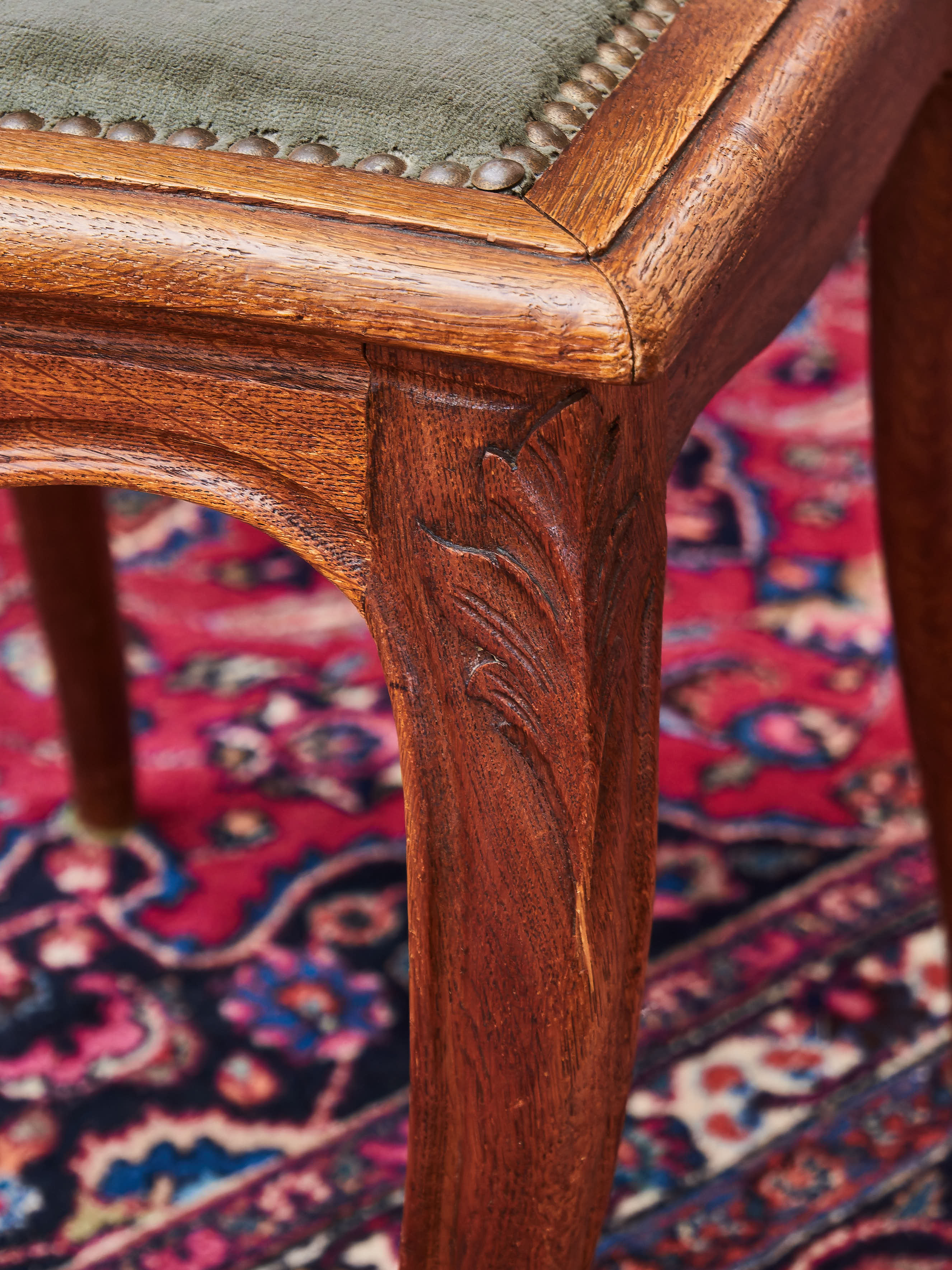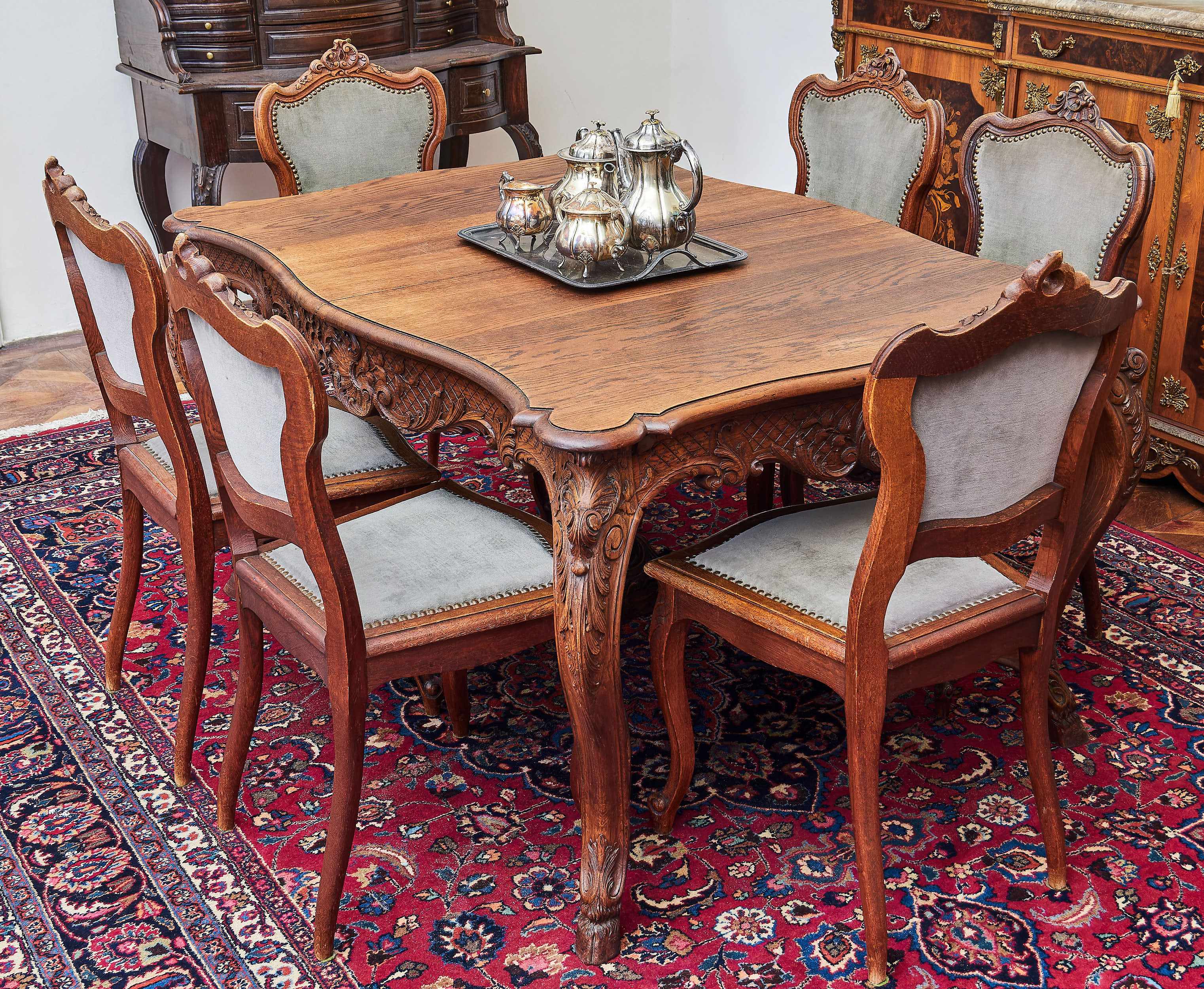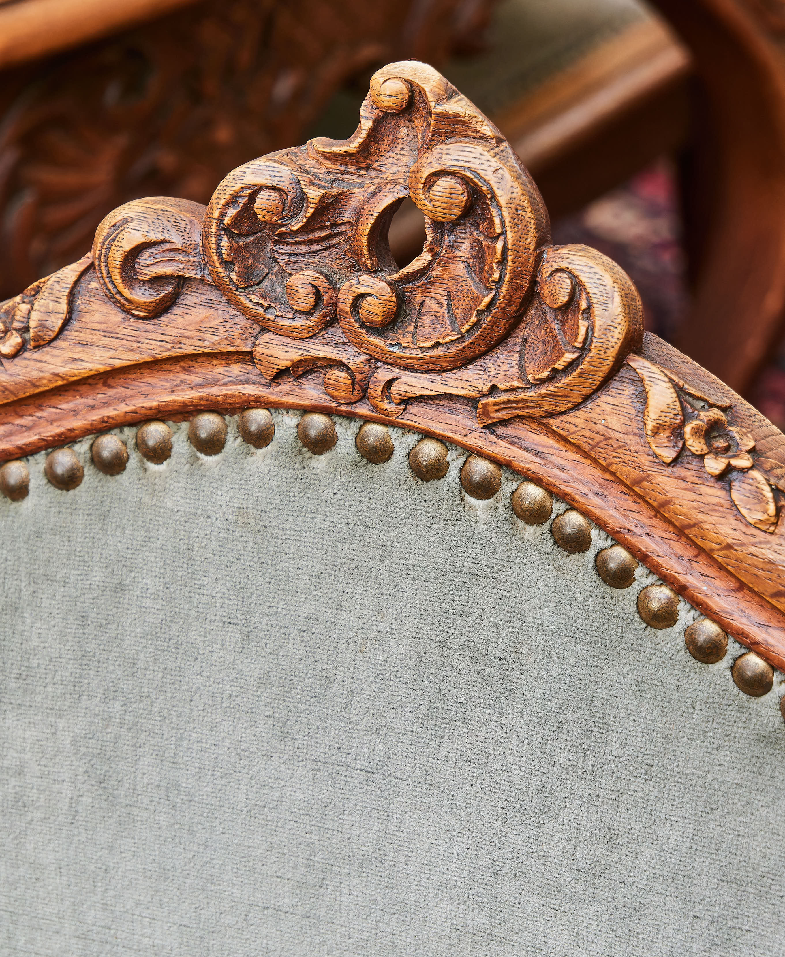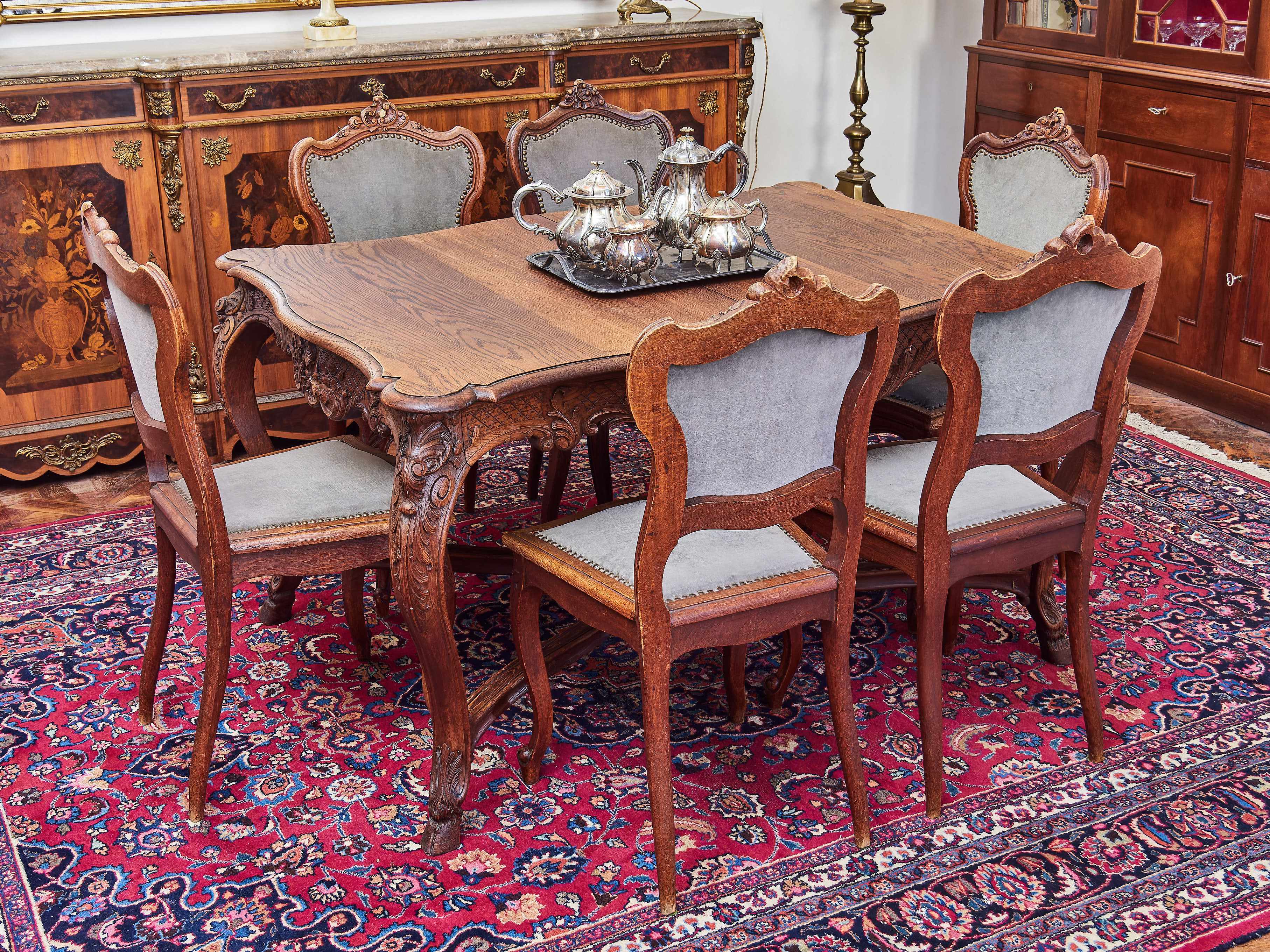 Ručně vyřezávané židle v rokokovém stylu. Výborná umělecko – řemeslná kvalita: mistrná řezbářská práce do výběrového masivního dubu. Židle jsou čalouněné jemným mohérem a čalounění je zakončené ozdobnými hřebíčky.