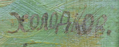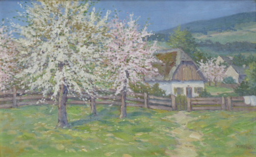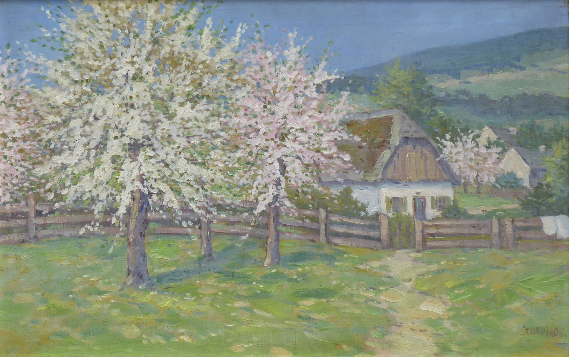 Krajina kvetoucími třešněmi a jabloněmi. Olej na plátně 37 x 58 cm. Signováno vpravo dole. Autor: Nikolaj Ivanovič Cholodkov (nar. 1925) . Pohled na jarní sad s kvetoucími stromy a chalupami v údolí pod kopcem. Zlatý široký dekorativní rám s ornamenty. Sovětský svaz 1950 – 1970. Celkový rozměr s rámem 52 x 73 cm.