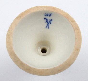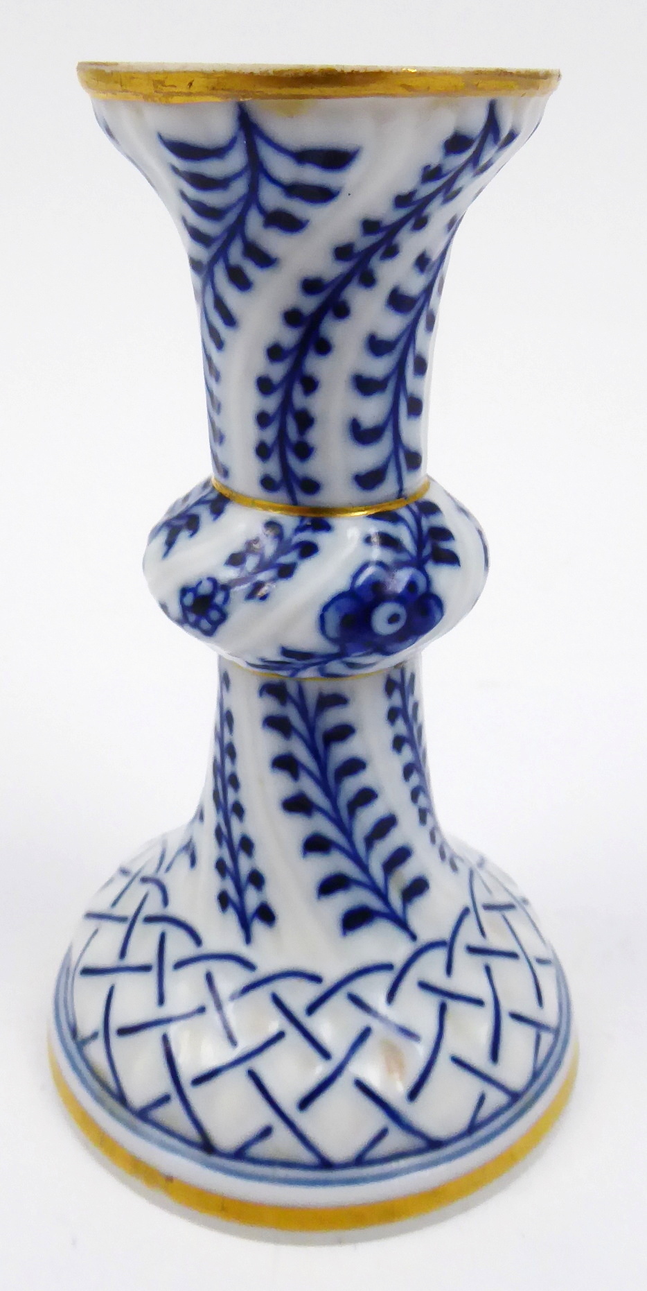 Bílý, kobaltovou modří ručně malovaný a ručně zlacený porcelán. Světoznámá porcelánka Meissen (Míšeň). Porcelánový svícen bohatě ručně kobaltovou modří zdobený, s florálními motivy a ornamentem mřížky, doplněnými o modré a zlacené linky a středový prstenec. Jemný reliéfní dekor. Značeno zespodu: modré zkřížené meče a ručně psané číslo 25 (značka malíře). Německo, Míšeň 1860 – 1924. Výška 9 cm.