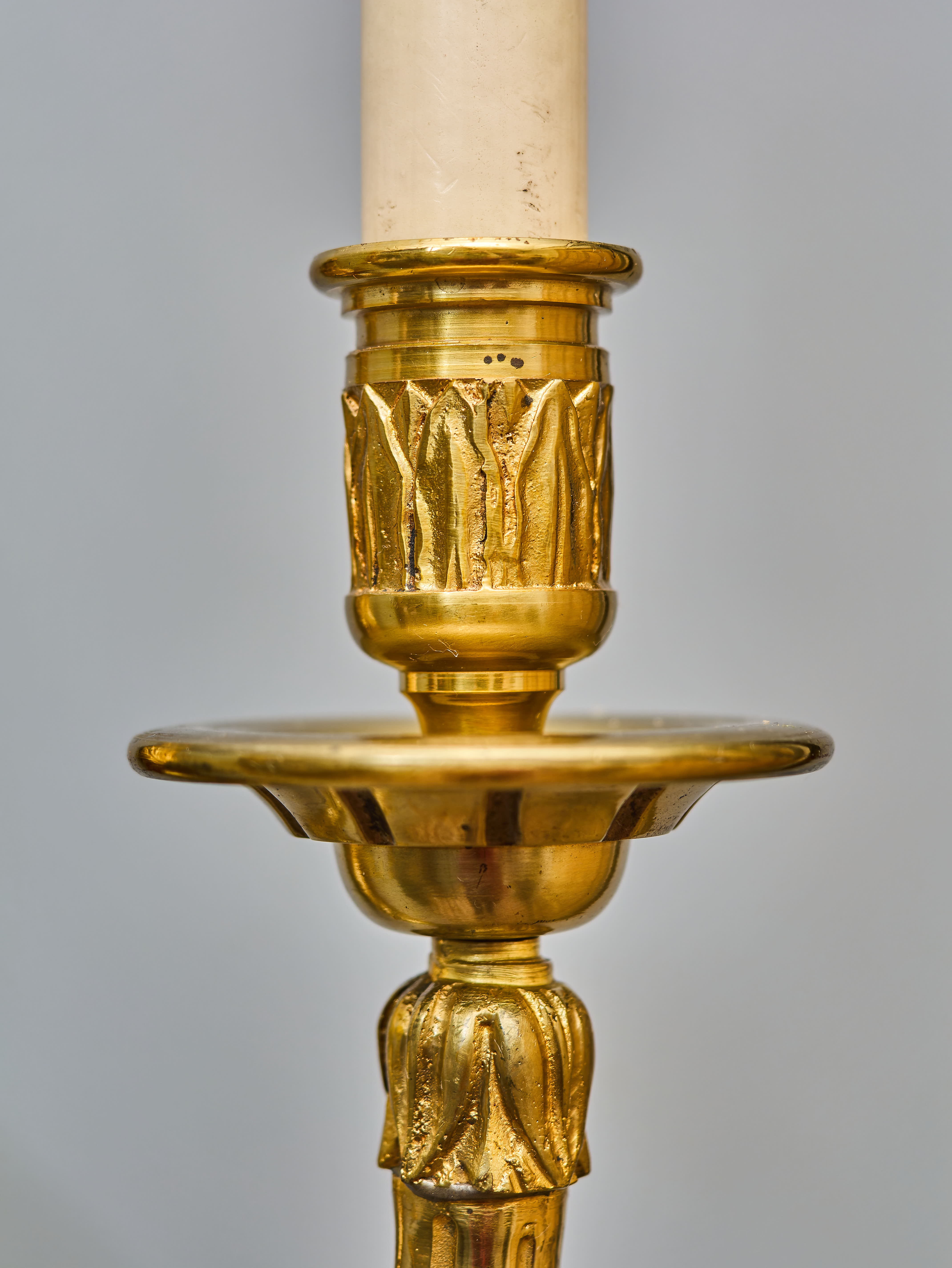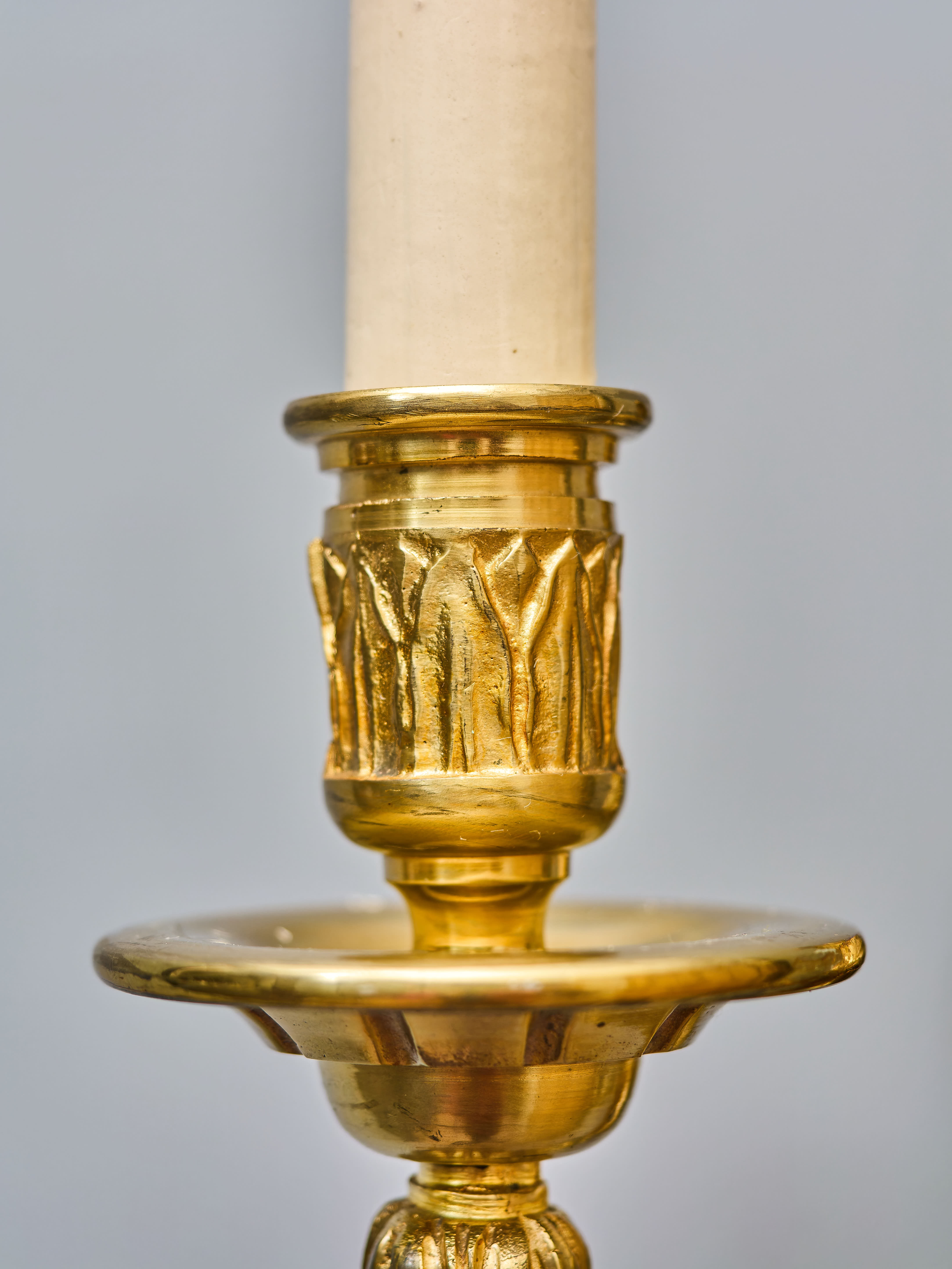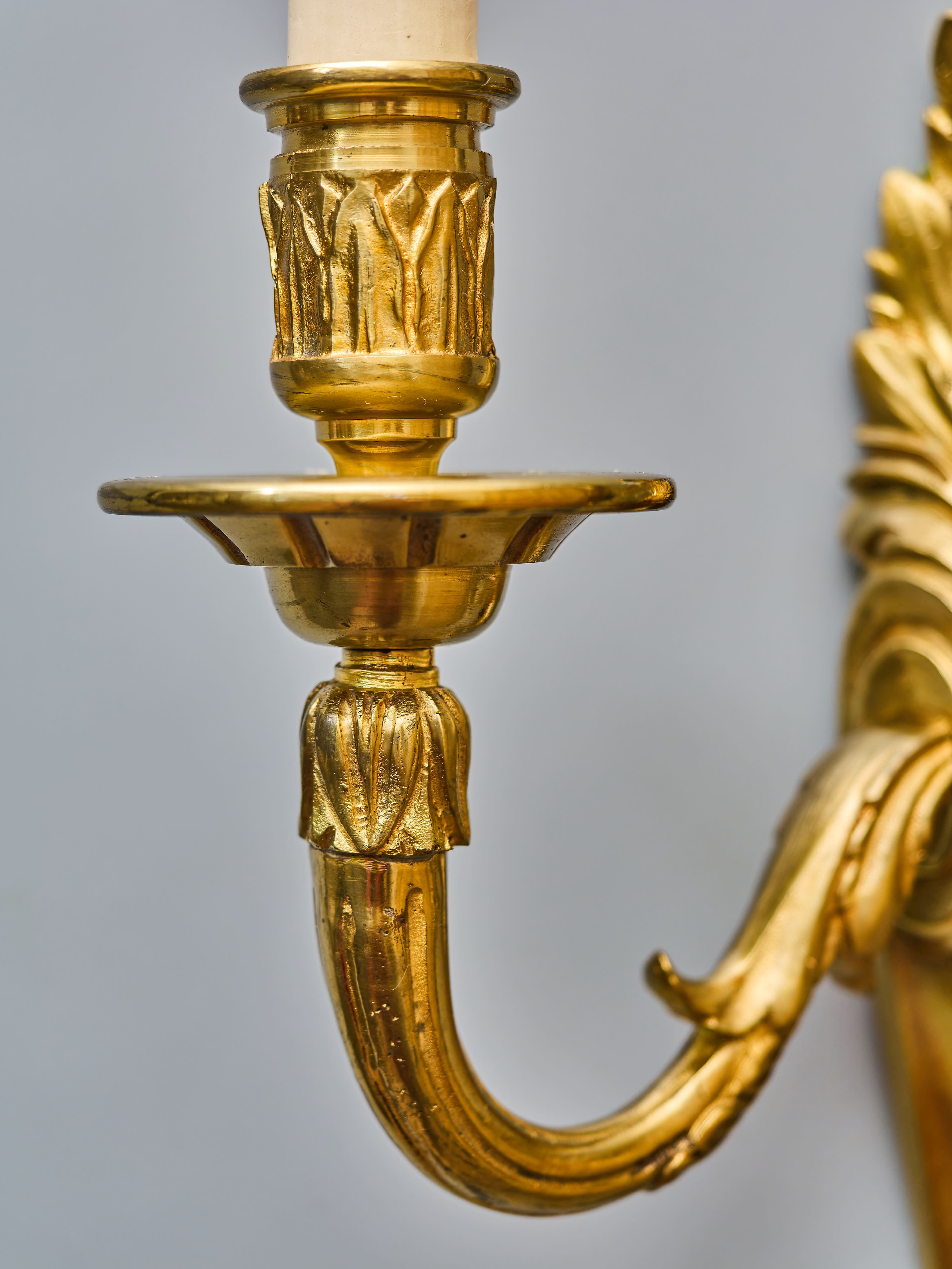 Starožitná nástěnná lampa / aplika z lité mosazi v klasicistním stylu s florálním zdobením. Robustní tělo s velkým akantovým listem, z kterého vycházejí dvě prohnutá ramena nesoucí objímky s žárovkami. Na první pohled zaujme kvalitní provedení ve zlaté barvě s jemnými detaily. Lampa je plně funkční a ihned k užívání. Lampa je na dvě žárovky s klasickým svíčkovým závitem E14 do 40W – vhodné jsou normální, halogenové i lede žárovky do 40W, které nejsou součástí, ale můžeme dodat nebo doporučit nejlepší volbu pro váš projekt.