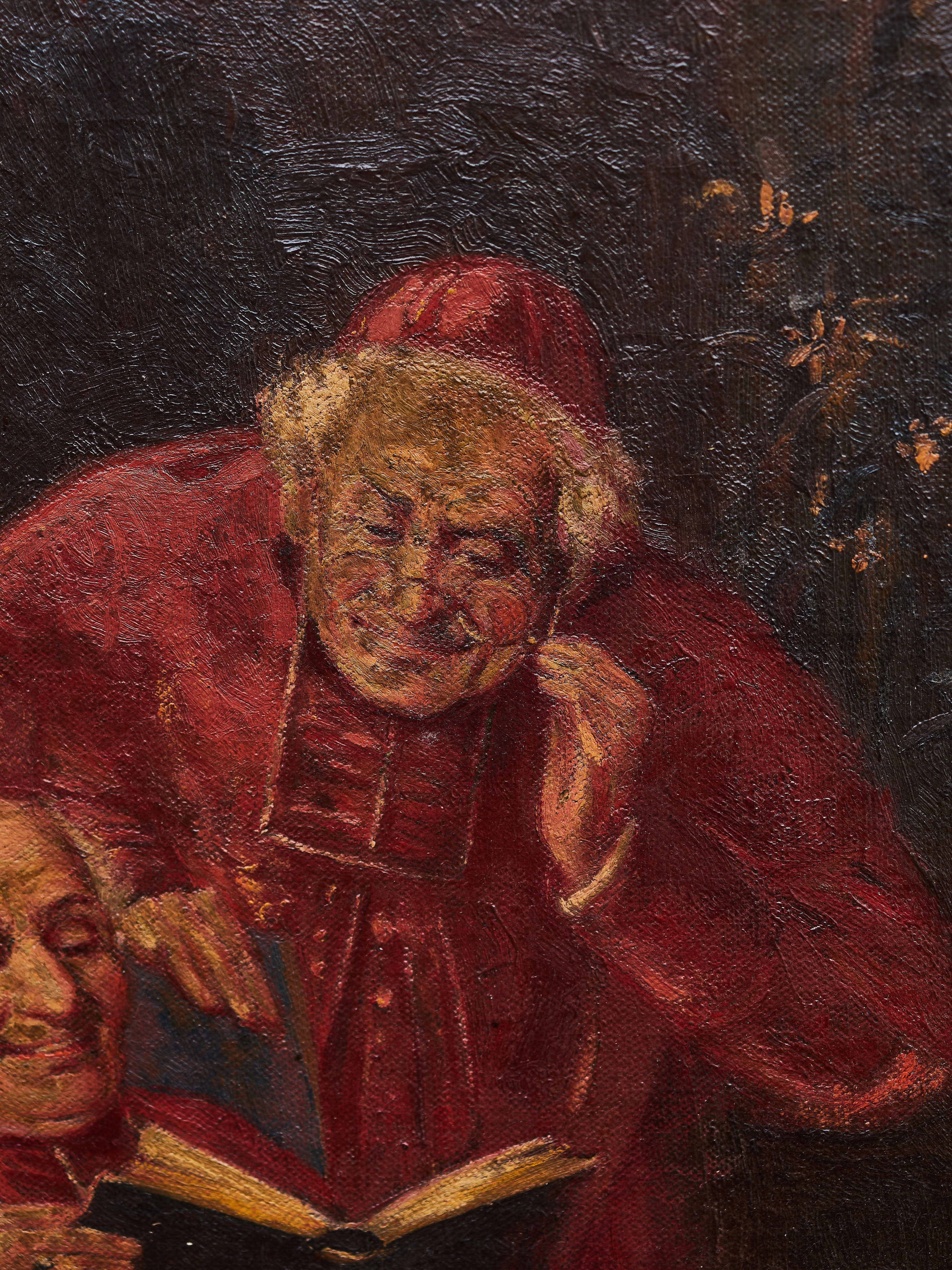 Žánrová scéna se dvěma kardinály v karmínových ornátech. Sedící prelát čte z otevřené knihy, druhý se nad něj s pobaveným výrazem naklání a naslouchá. Malba pracuje s bohatou škálou červených tónů a teplým světlem, které modeluje objem drapérií i mimiku postav. Pastózní, místy výrazně štětcová lazura, tmavší pozadí s náznakem architektury a zahradního kouta; celkově lehce anekdotický, laskavě ironický motiv oblíbený v pozdně 19. století (tradice francouzského a italského žánru „cardinals“).